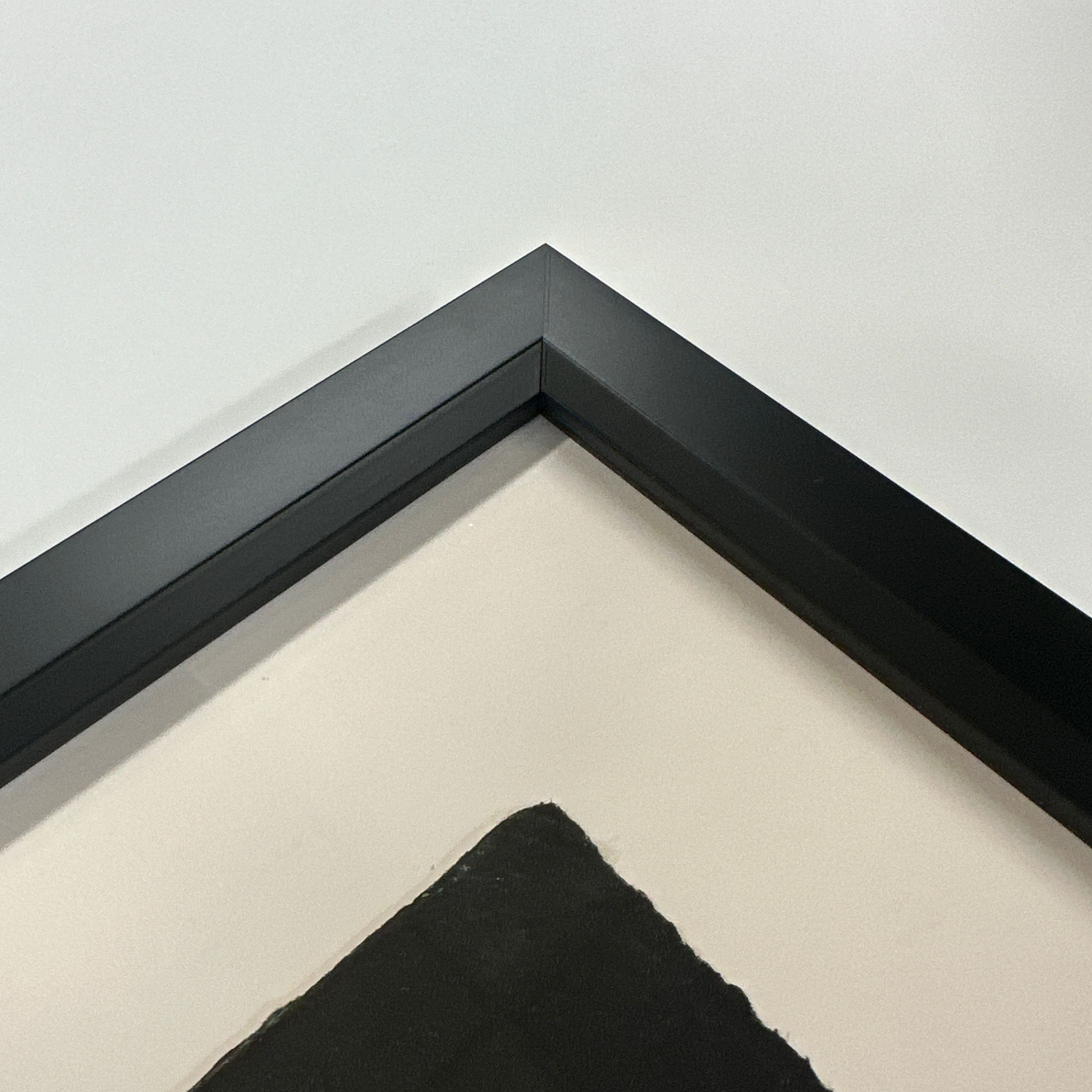 Custom float-framed using strictly conservation-grade materials in black-painted wood frame behind 99% UV-blocking art glass.