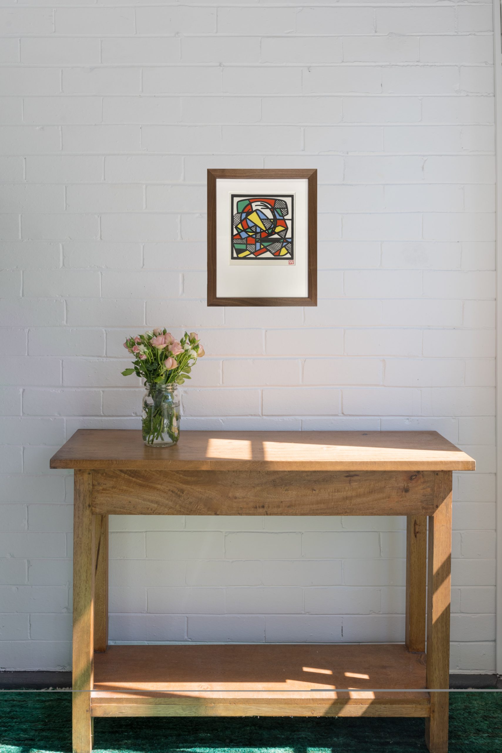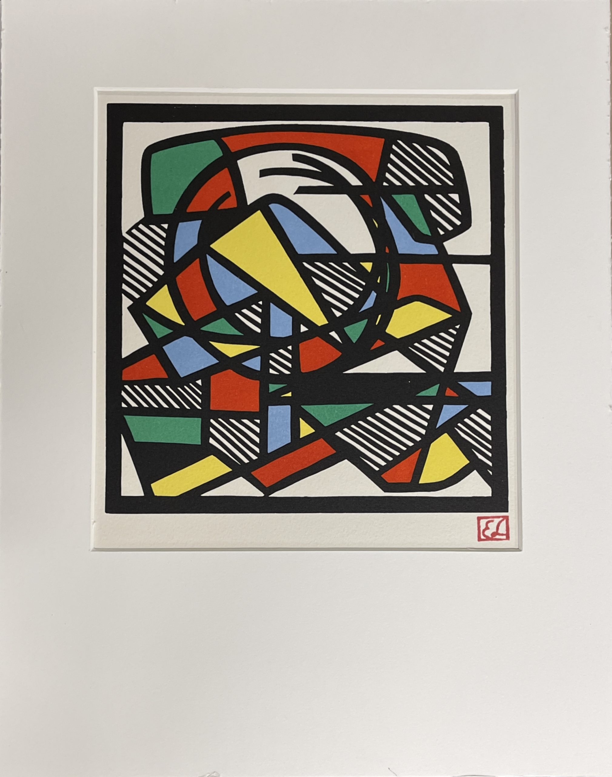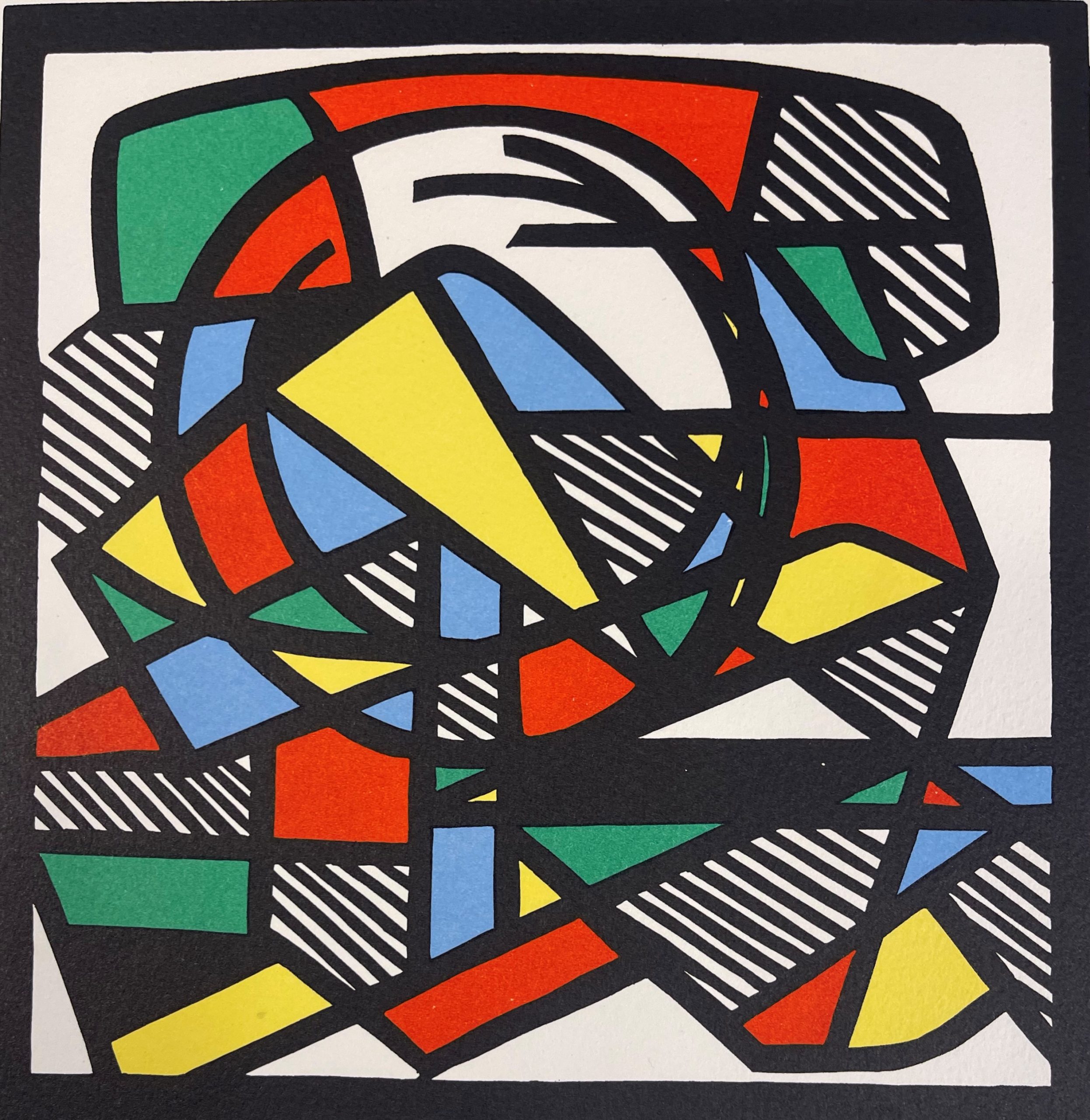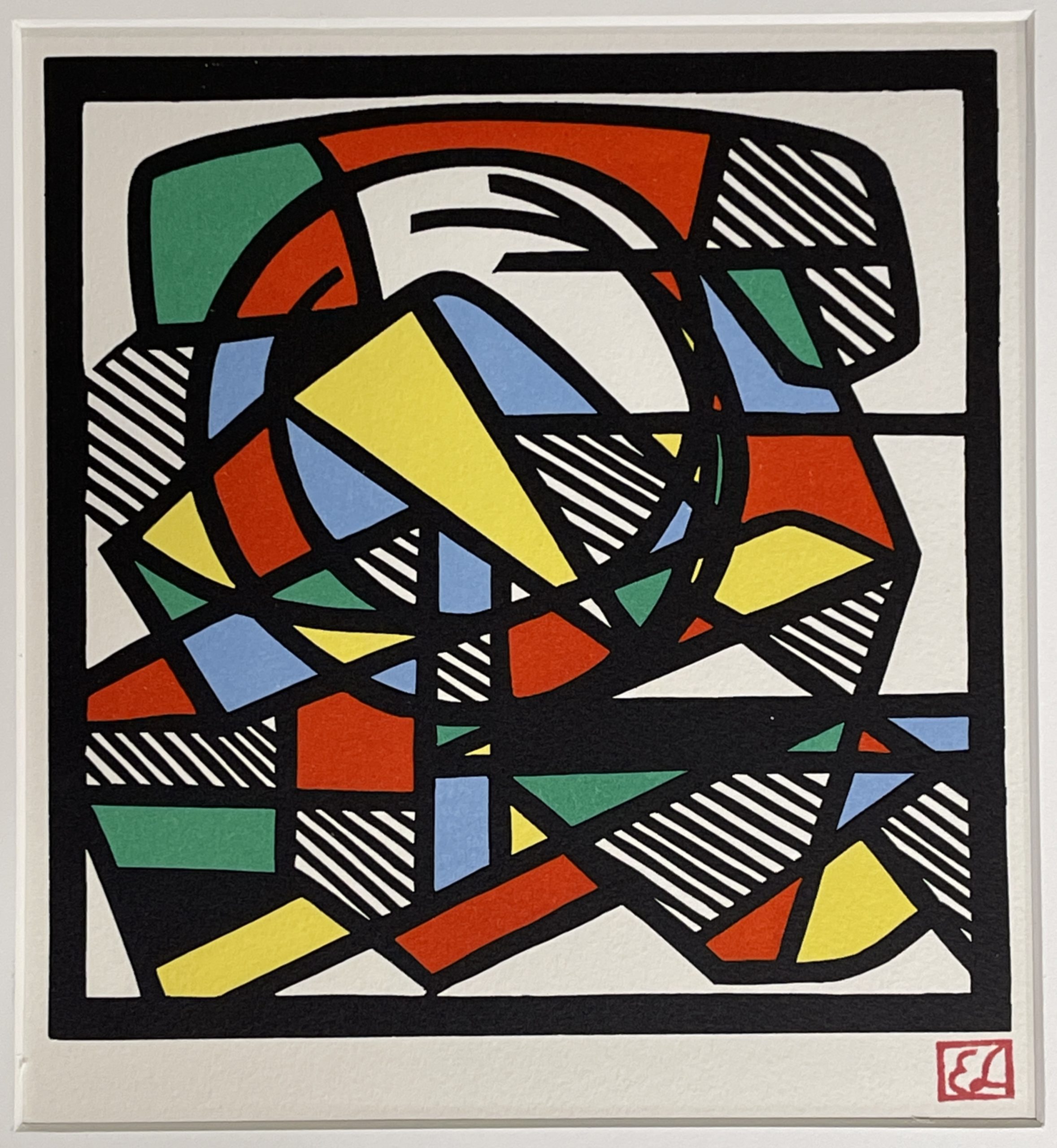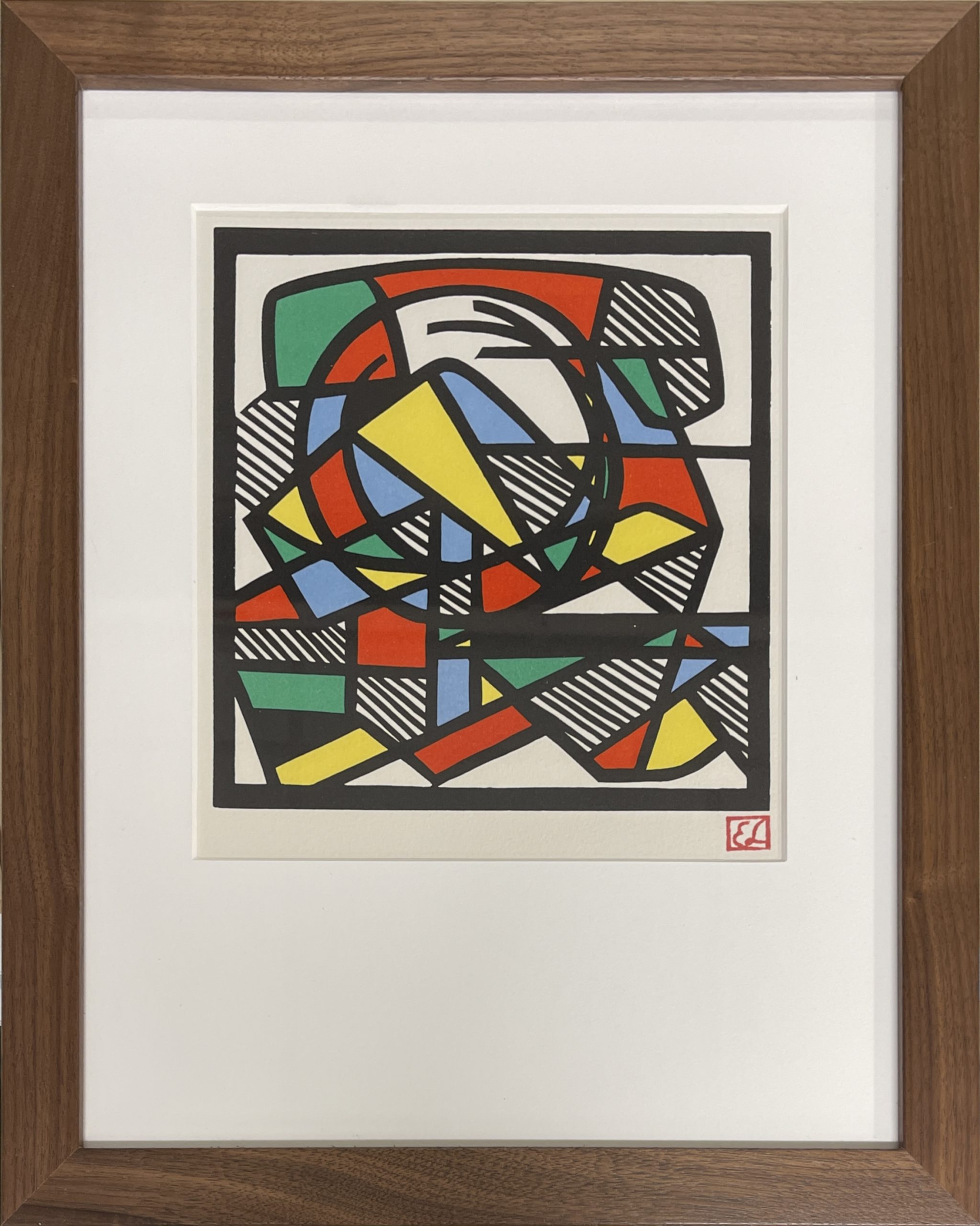 “Contrast” marries together the Cubism which is found in Lahner’s earliest works with the look of the stained glass chapel windows that he made in Algiers in the middle years of his career.  It is from a portfolio of Emile Lahner’s abstractions published by Lahner’s long-time dealer, Laszlo Laky.  (Lahner met Laky in Paris when he had a job working as a Hungarian-language guide for Laky; Laky was there looking—but not finding—Parisian artists whose work he could sell in his Carmel gallery. At long last, Lahner confessed to Laky that he was a painter and after seeing Lahner’s work Laky became Lahner’s sole American dealer. Lahner enjoyed great economic and critical success in the American market thanks to Laky’s efforts.)