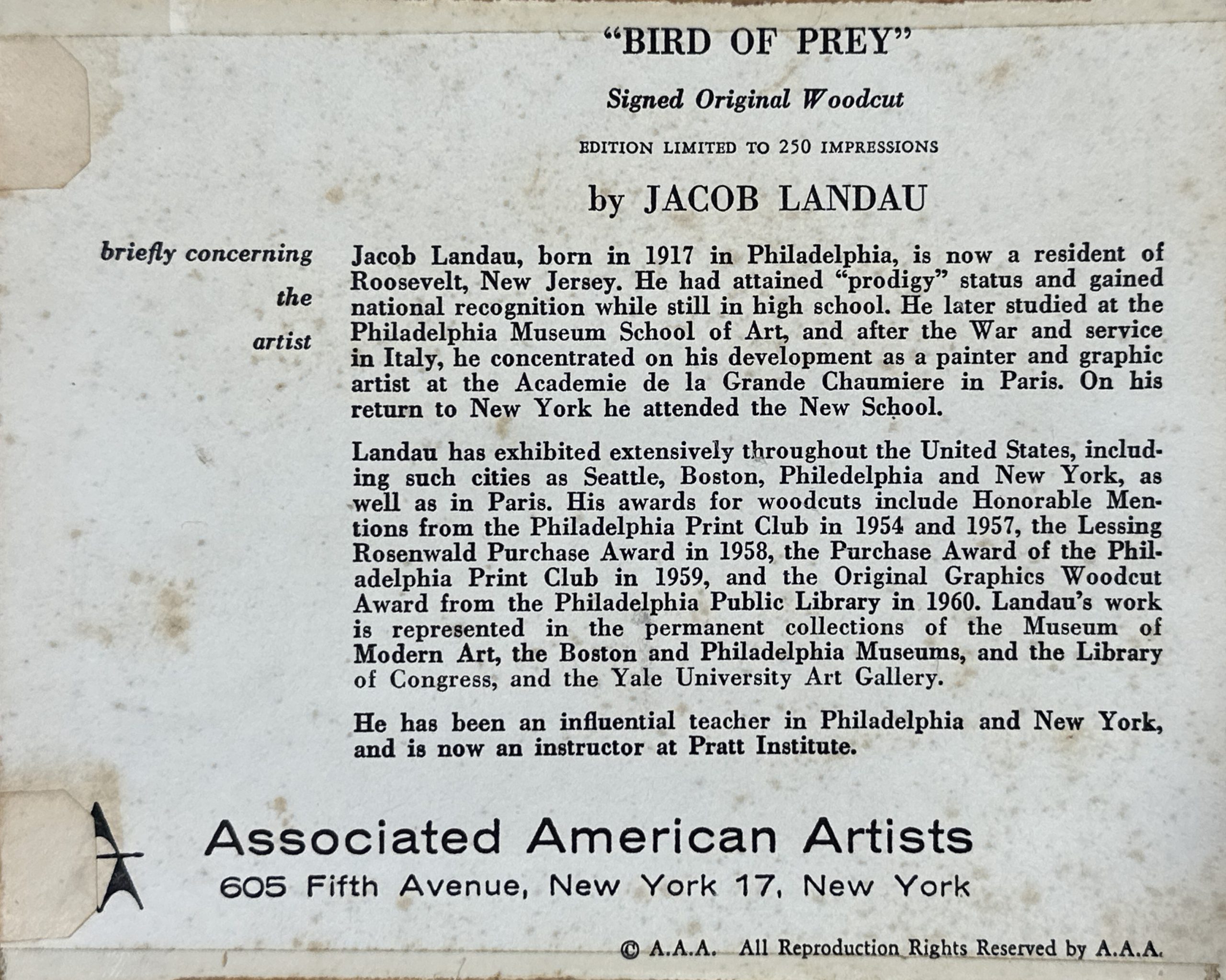 This work was commissioned by the Bloom Advertising Agency, Inc., for the American Desk Manufacturing Co., Inc. It was published by Associated American Artists and printed by master printer Jim Lanier at the Adlib Press at the Pratt Institute. It has been custom framed in a silvered-wood frame under an 8-ply mat protected by 99% UV-blocking art glass using strictly conservation-grade materials.