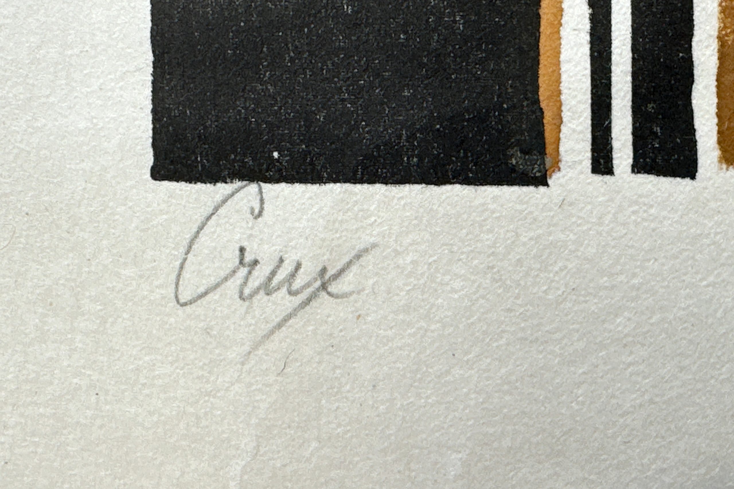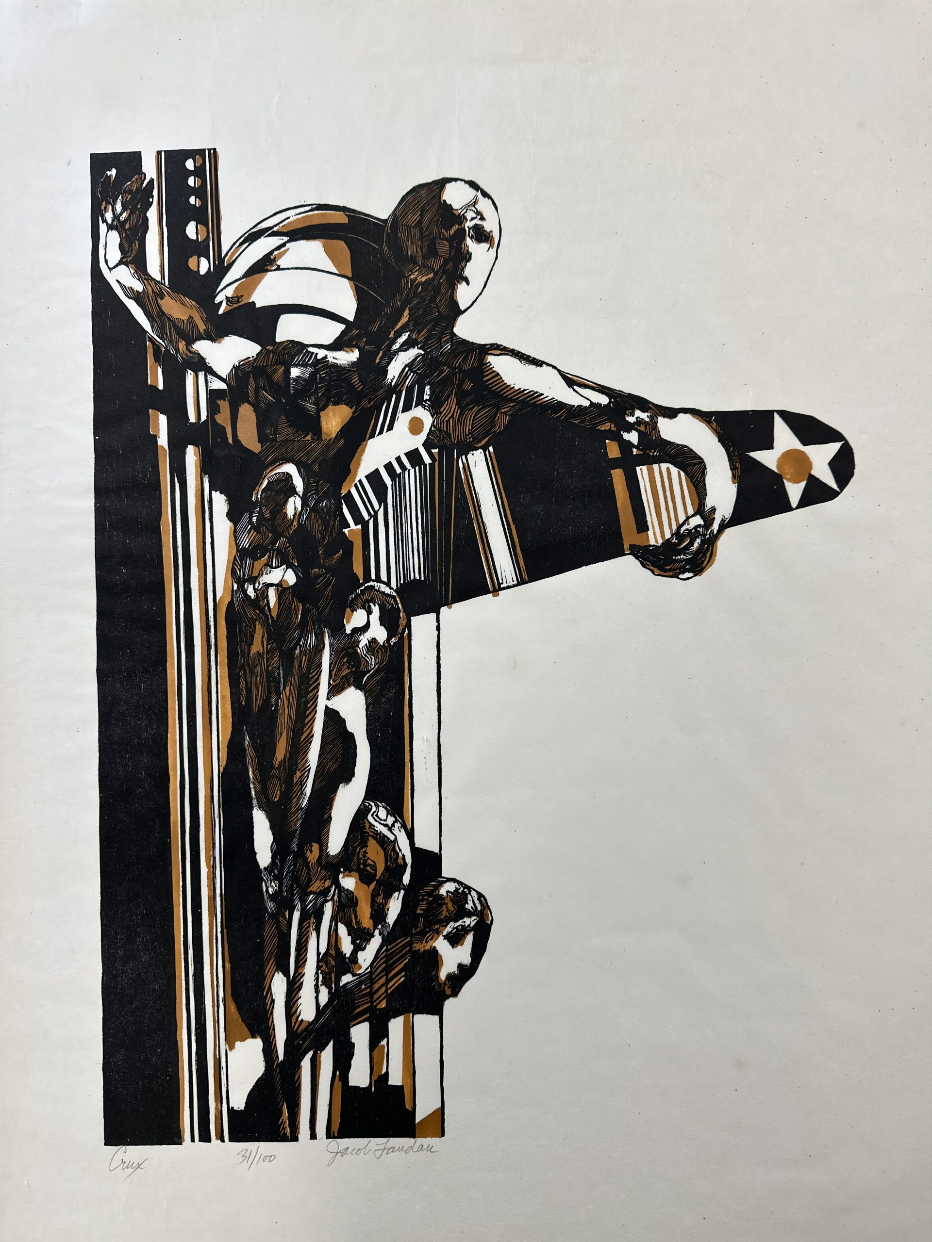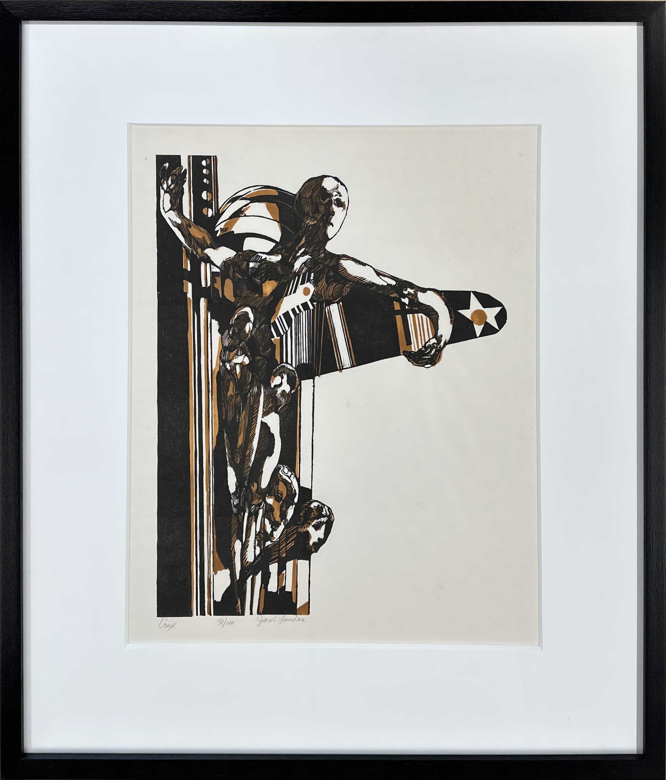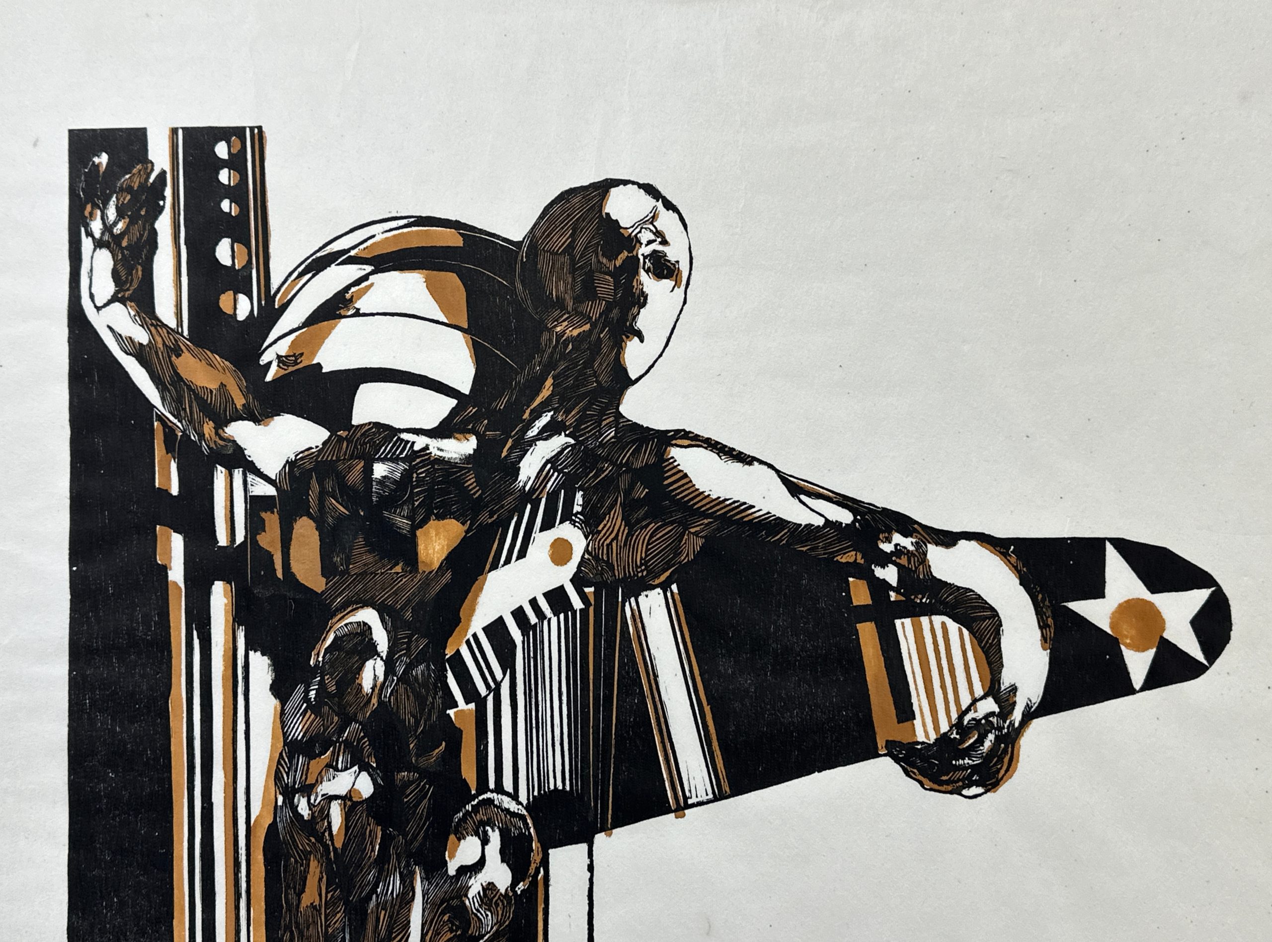 “Crux” is no exception–nevertheless, I am aware of certain clear cut meanings in the woodcuts, around which the other more elusive ideas may revolve, just as the planets around the sun. No less than all of mankind is the crux of my concern. Man in a technicological age is part airplane, part environment, part all too vulnerable anatomy. His nerves and bones are fragmented and interspersed with mechanical form. He is disassociated from his fellows who can scarcely be distinguished from the spare architecture which engulfs them.