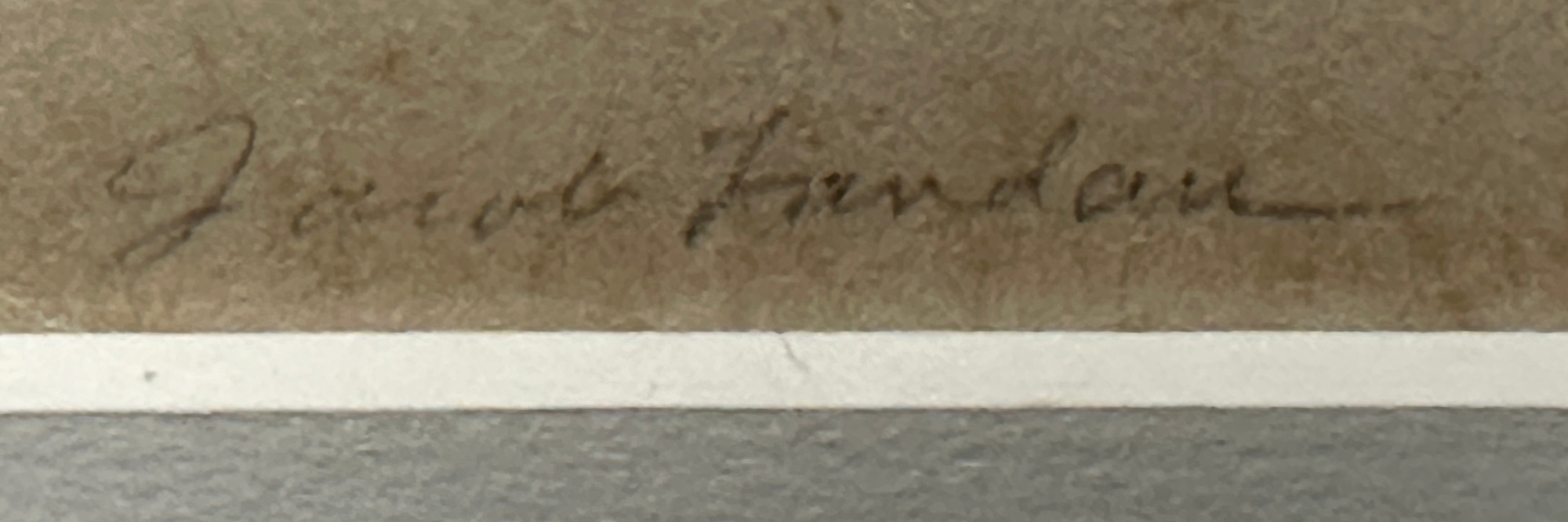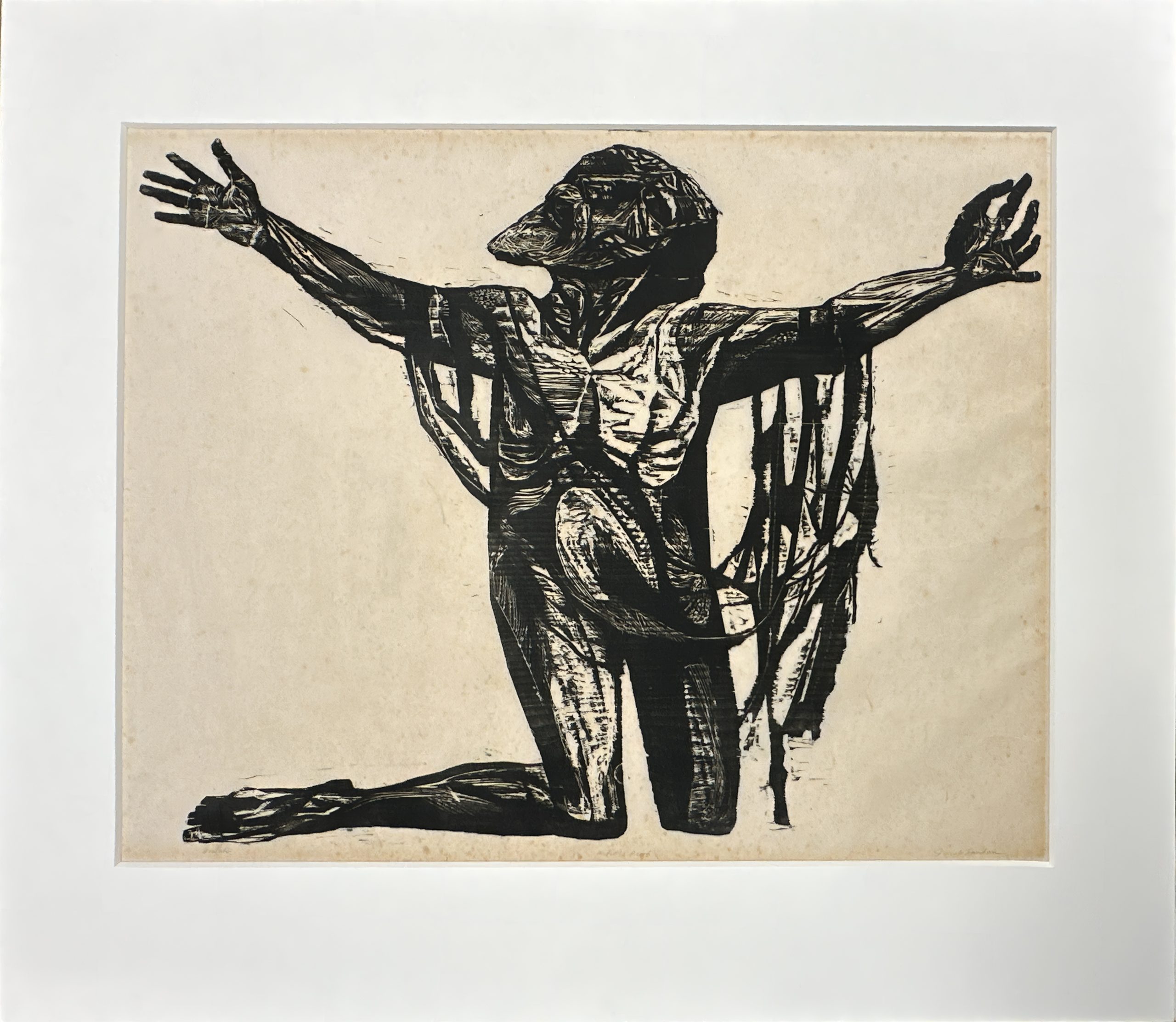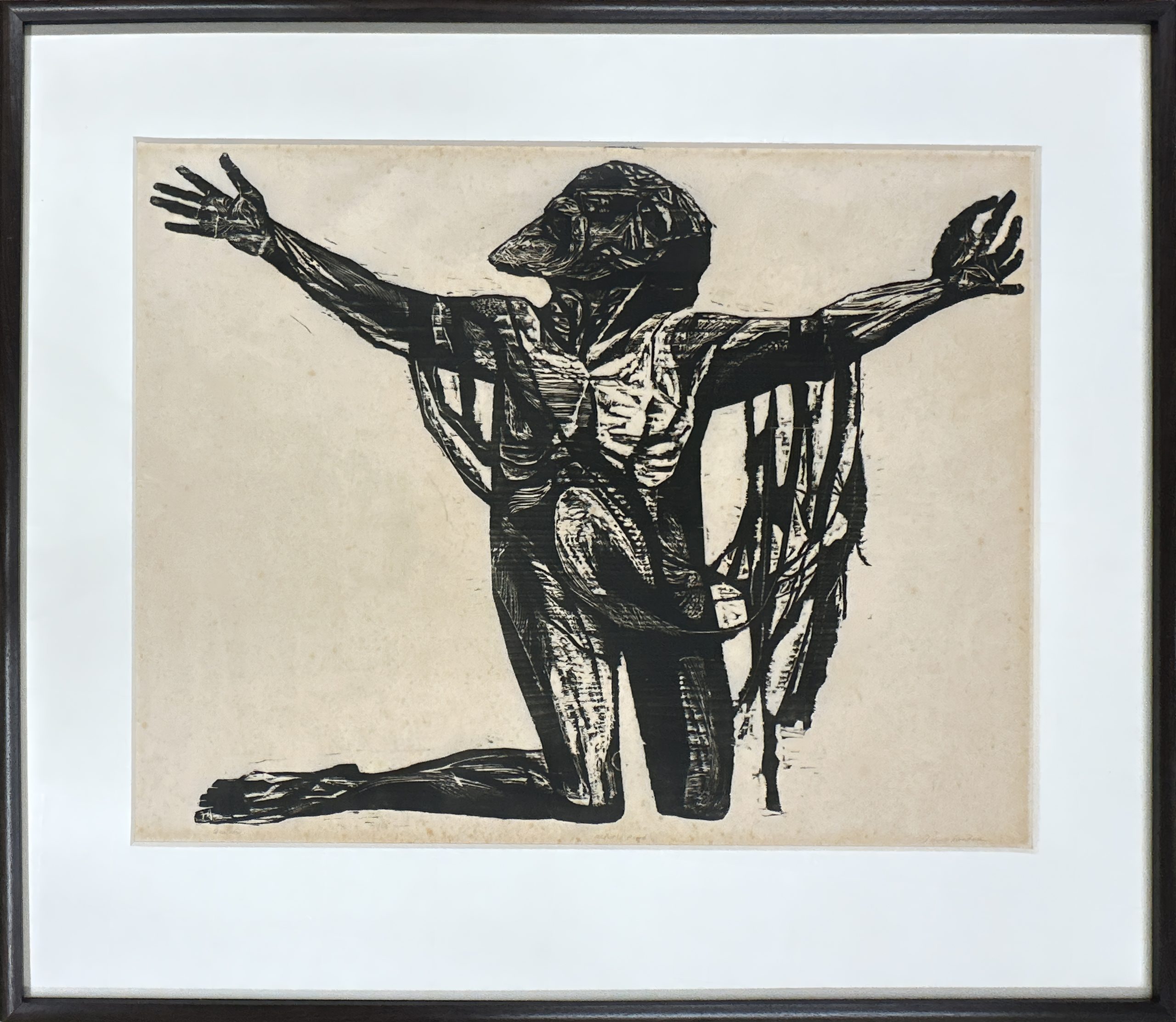 This portrait of the prophet Isaiah is special in four respects. First, Jacob Landau reached maturity in his work only in the early 1950s, so this work, created in 1956, is a rare early example of his mature work. Second, it is an Artist’s Proof preceding a very limited edition of ten copies, making this a rare find. Third, it has been widely reproduced, including its 1957 presentation in the leading art magazine “Art in America”. Finally, it comes from the personal collection of the celebrated portrait artist William Arthur Smith, gifted to him by the Artist. This work was created as the album cover design for ISAIAH THE PROPHET by Alexander Tansman; Paul Van Kempen conducting The Radio Philharmonic Orchestra and Choir, Epic Records. Custom framed in a solid Walnut frame behind 99% UV-blocking art glass using strictly conservation-grade materials.
