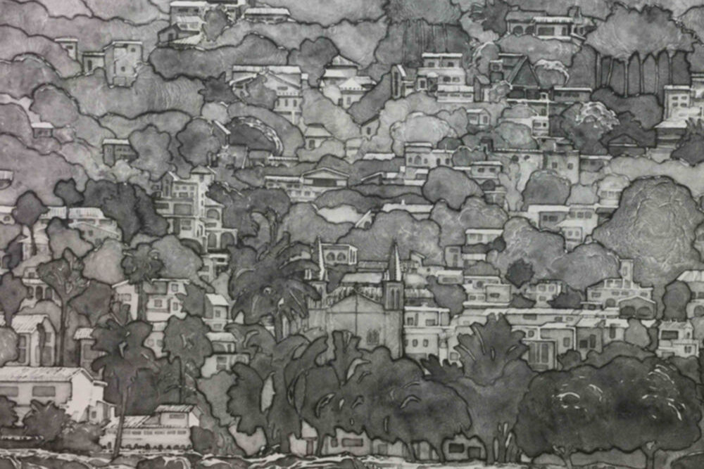 This work demonstrates Leonard Lehrer’s primacy as a print-maker. Marrying together bold lines with subtle shading, he creates a remarkable three-dimensionality. This image of Puerto Vallarta simultaneously has the character of a line drawing with the aliveness of the hyperrealists. This technique, which you can see in all of his Formal Gardens works, is difficult to achieve successfully in the challenging arena of lithography.