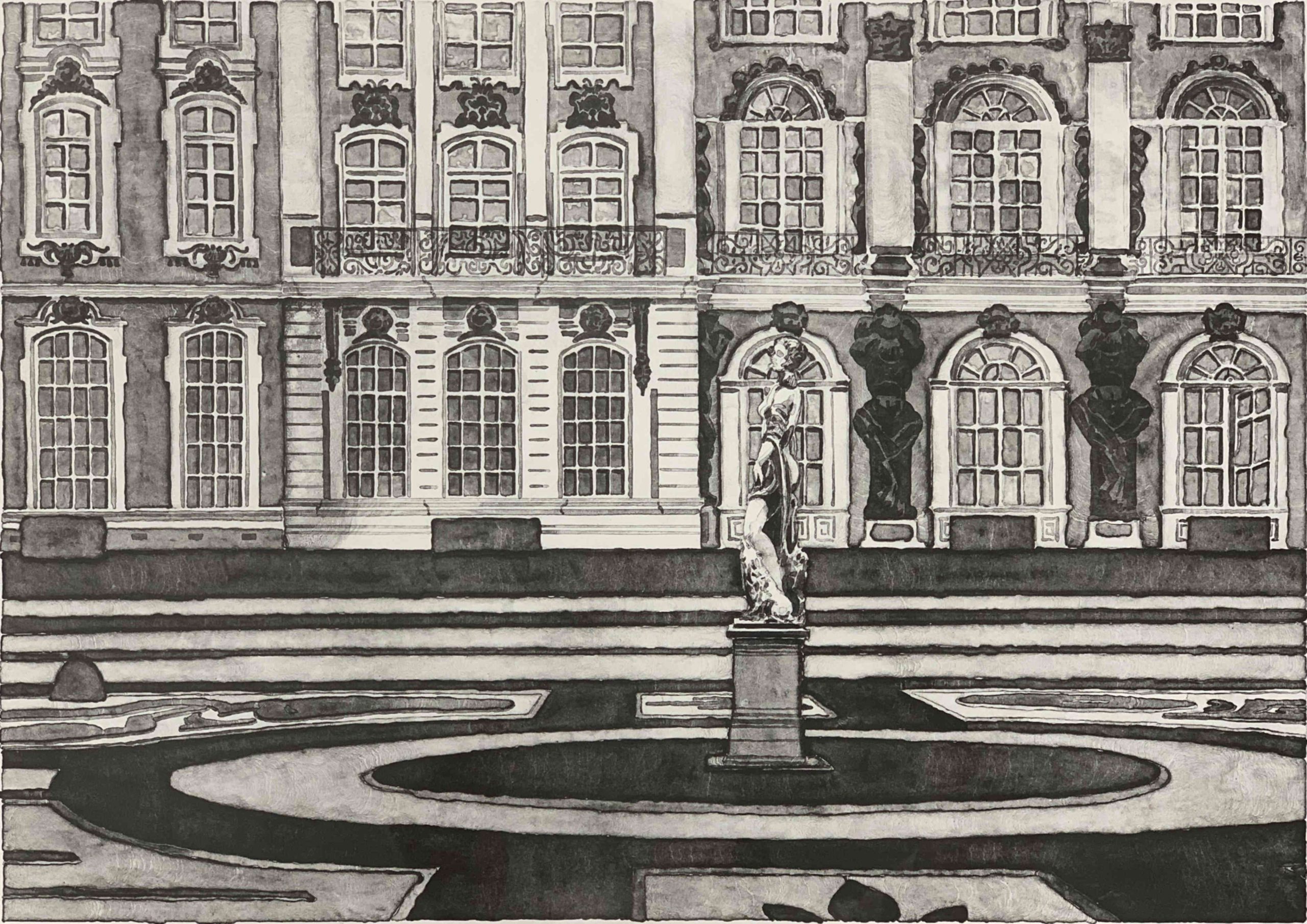 This work demonstrates Leonard Lehrer’s primacy as a printmaker. Marrying together bold lines with subtle shading, he creates a remarkable three-dimensionality. This beautiful rendition of the opulent Pushkin Gardens, Russia’s first landscape garden when it was built in about 1770 by Catherine the Great, simultaneously has the character of a line drawing with the aliveness of the hyperrealists. This technique, found in all of Lehrer’s Formal Gardens works and a Lehrer hallmark, is difficult to achieve successfully in the challenging arena of lithography.