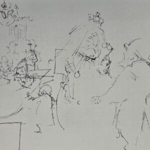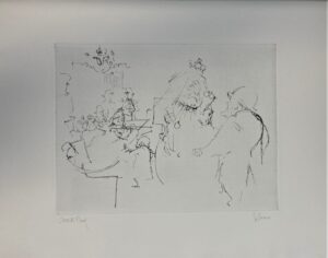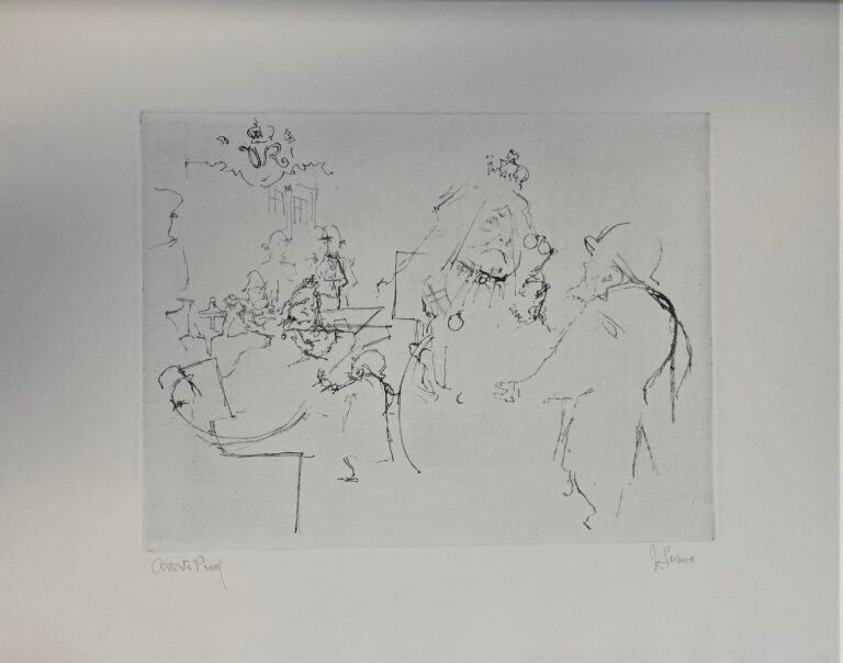 Berthold Brecht’s 1930 film Dreigroschen [The Threepenny Opera] introduced the world to the great musical standards “The Ballad of Mack the Knife” and “Pirate Jenny”, among others. More than that, it was a biting socialist critique of the capitalist world, and in that regard it resonated with Jack Levine, one of the great social critic artists in the mold of Philip Evergood, Leonard Baskin, and George Gropper. Levine was inspired by Dreigroschen—and his memories of truancies from school, occasions in which he would tour the erotic temptations of Boston—to make a suite of pictures, of which this etching is the 13th plate.
