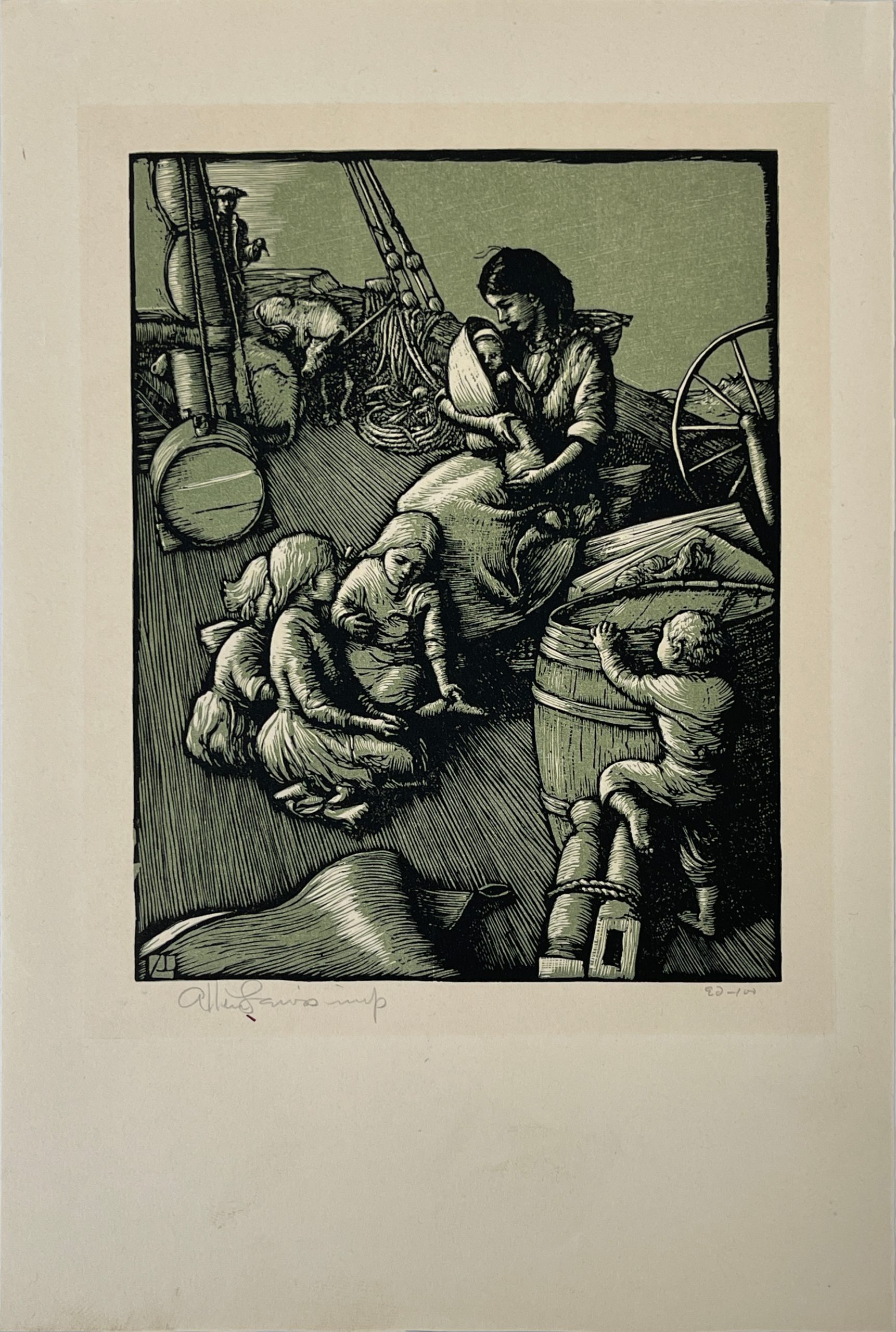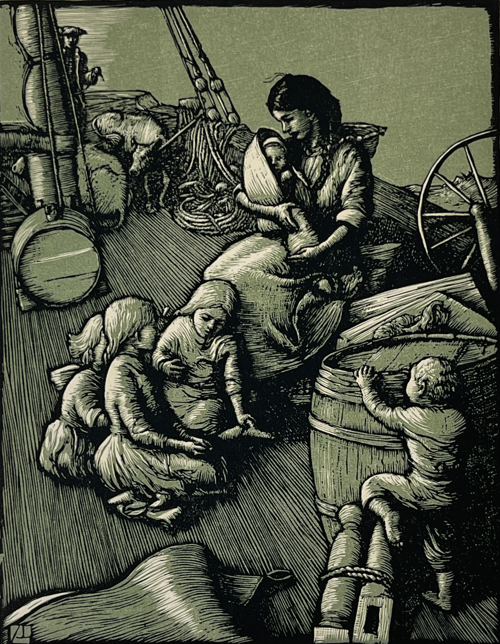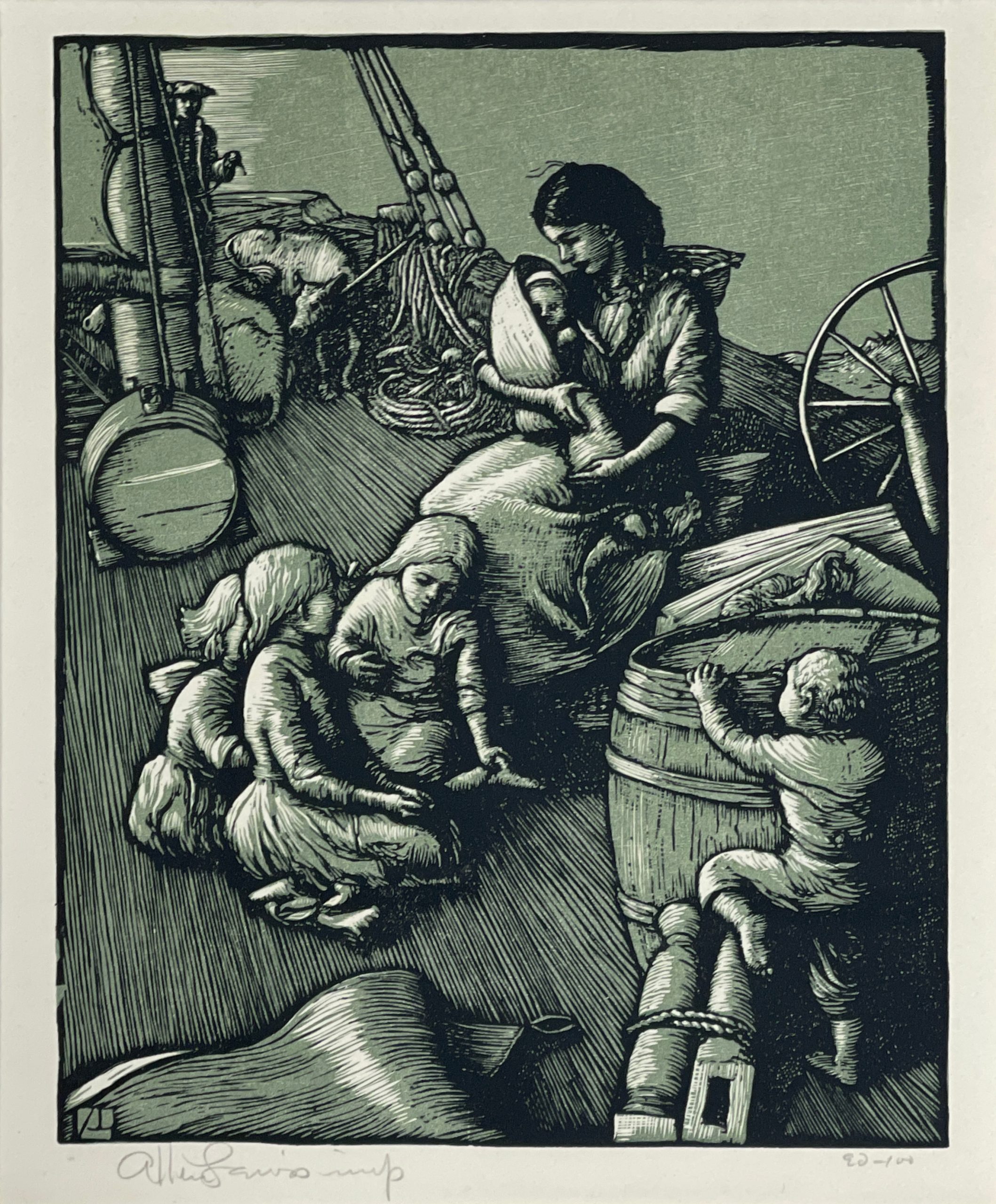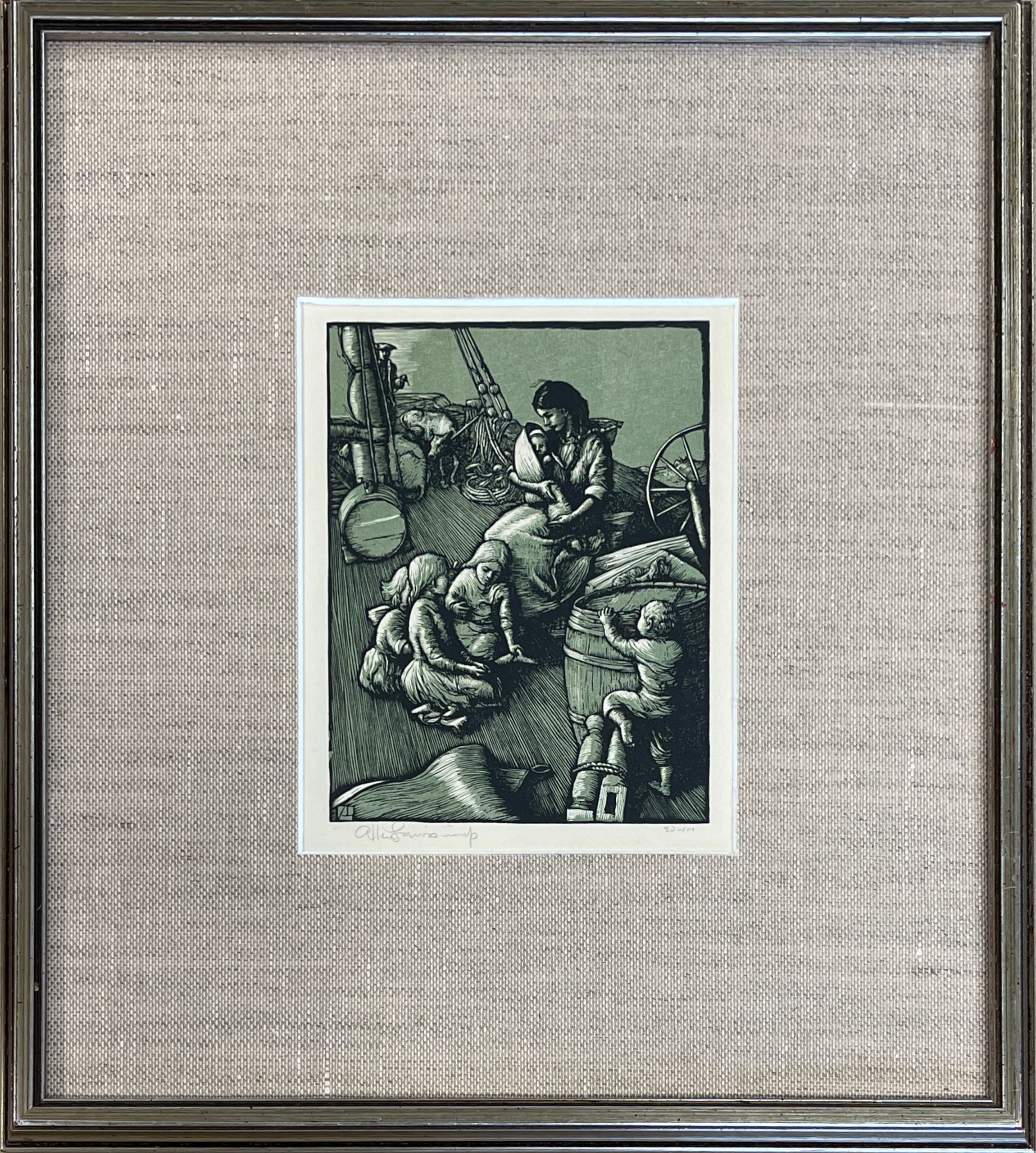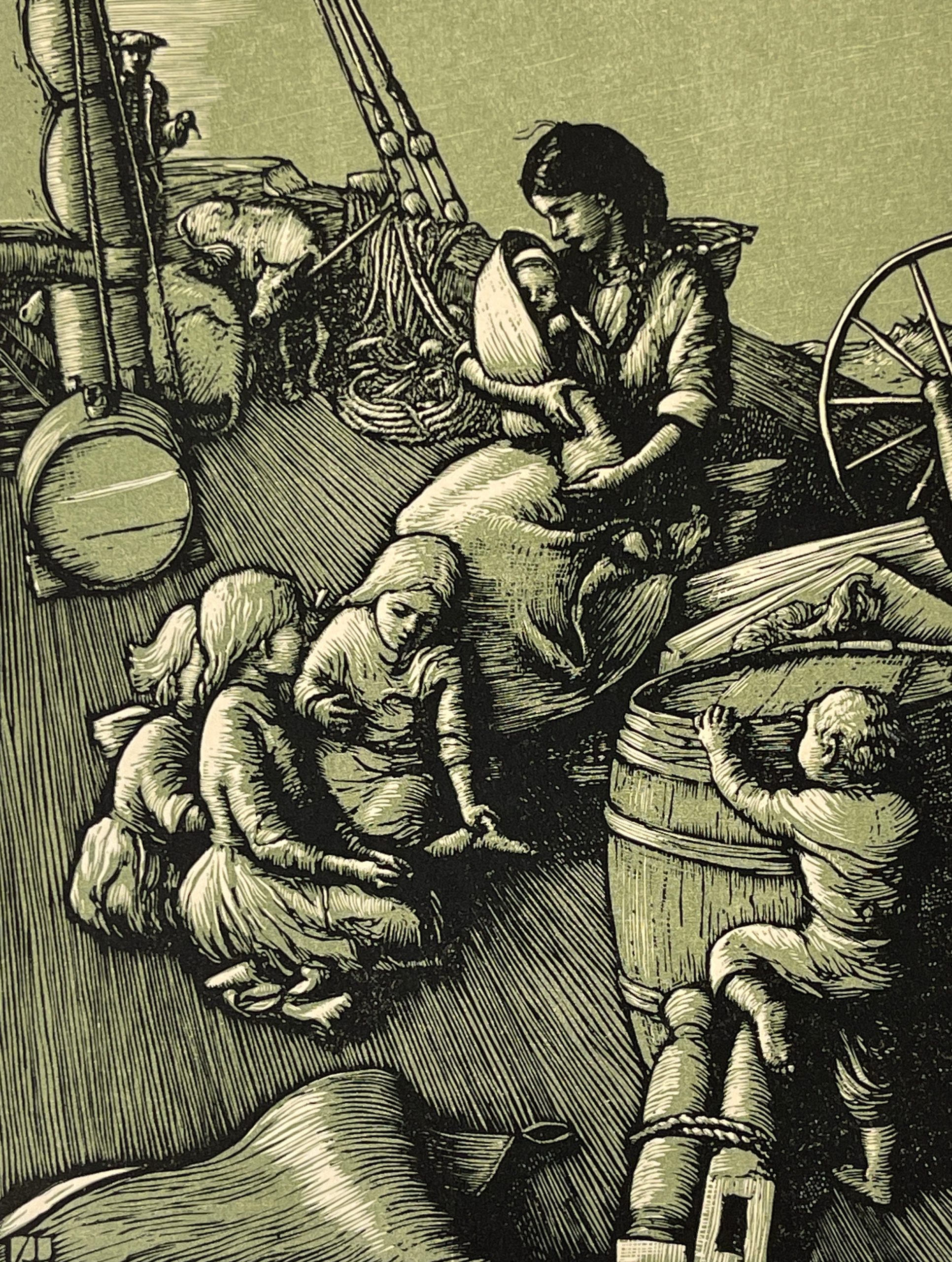 This color engraving was one of four commissioned to illustration Rachel Field’s famous 1931 book “Calico Bush”, a classic story of a French orphan in 18th Century America who indentured herself to a Maine family in exchange for food and shelter. This image was the frontispiece for the book. Custom matted and framed behind 99% UV-blocking Plexiglass using strictly conservation-grade materials.