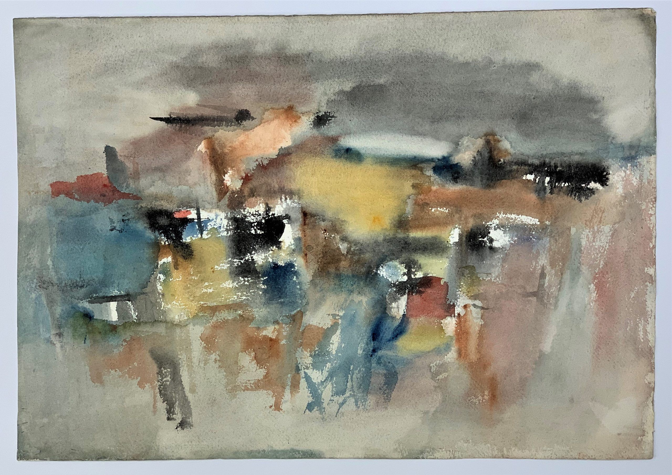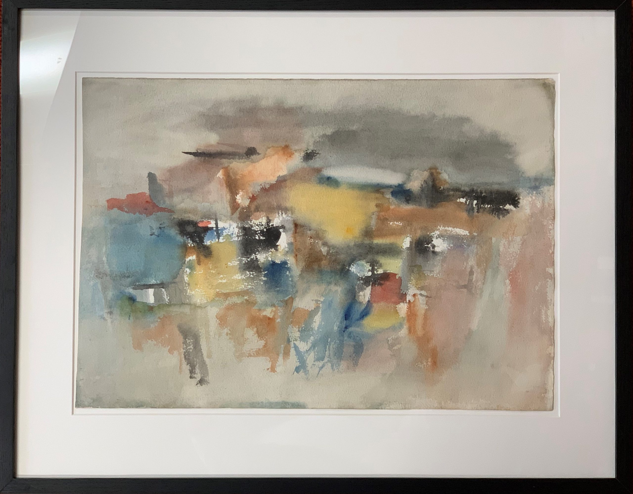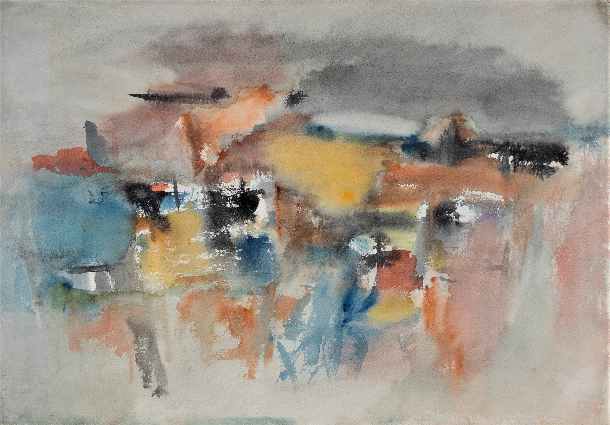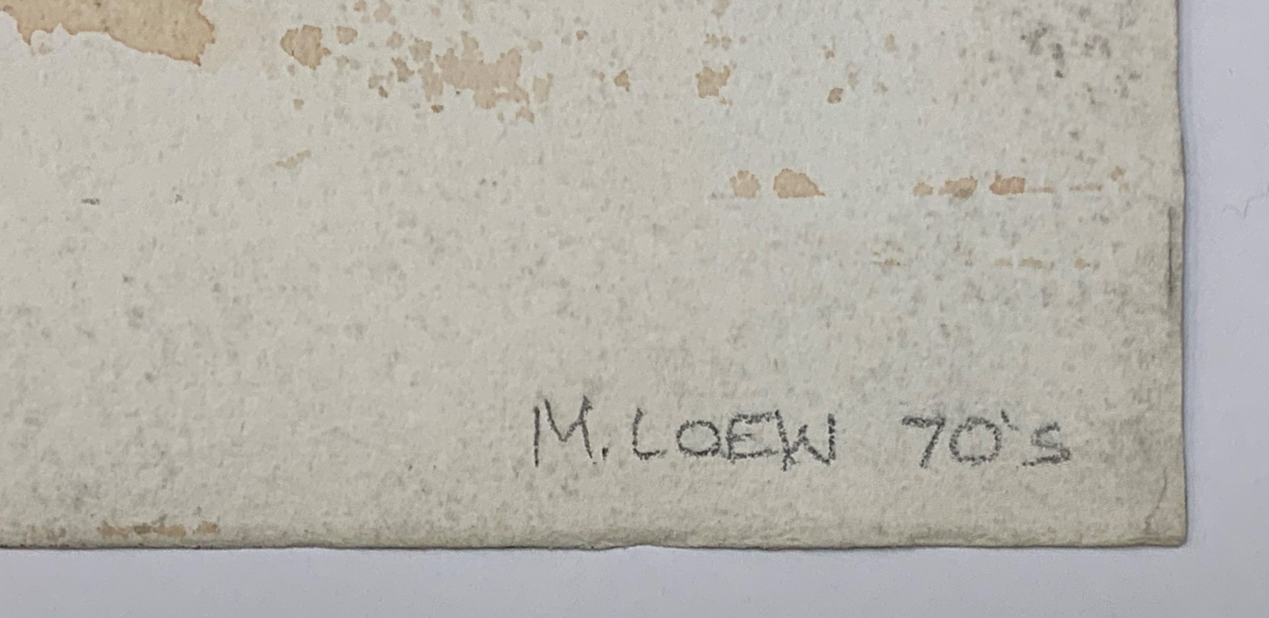 This watercolor, identified by Loew’s estate as 1970s, shows Loew at his best. His use of colors across the palette—dark and brooding and soft and pastel—created an evocative and compelling work. Loew is one of few abstractionists who paint abstractions of real items, though that is not always entirely clear to the viewer.