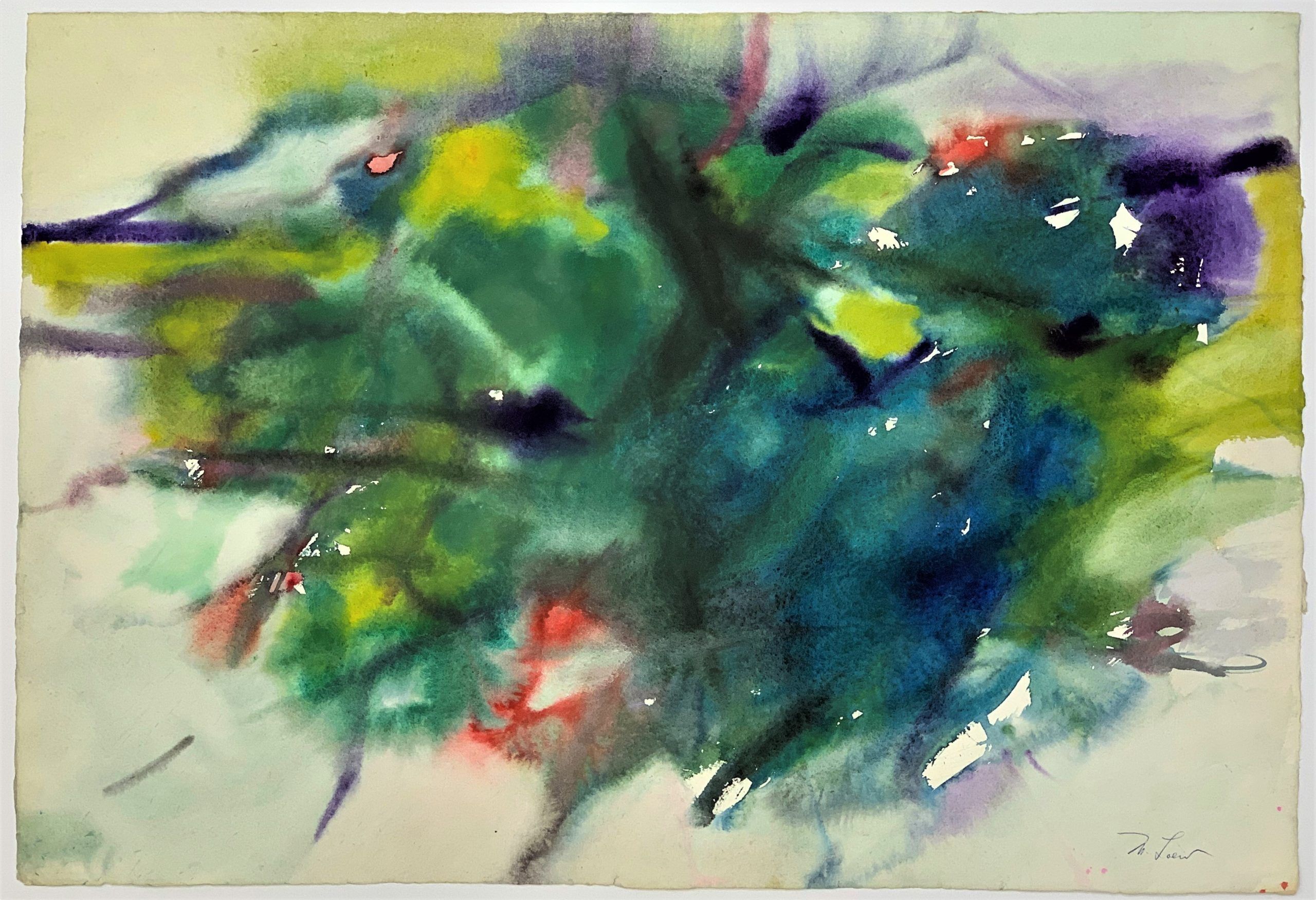 This watercolor, identified by Loew’s estate as 1970s, shows Loew at his best. His use of colors across the palette—dark and brooding and soft and pastel—created an evocative and compelling work. Loew is one of few abstractionists who paint abstractions of real items, though that is not always entirely clear to the viewer.
