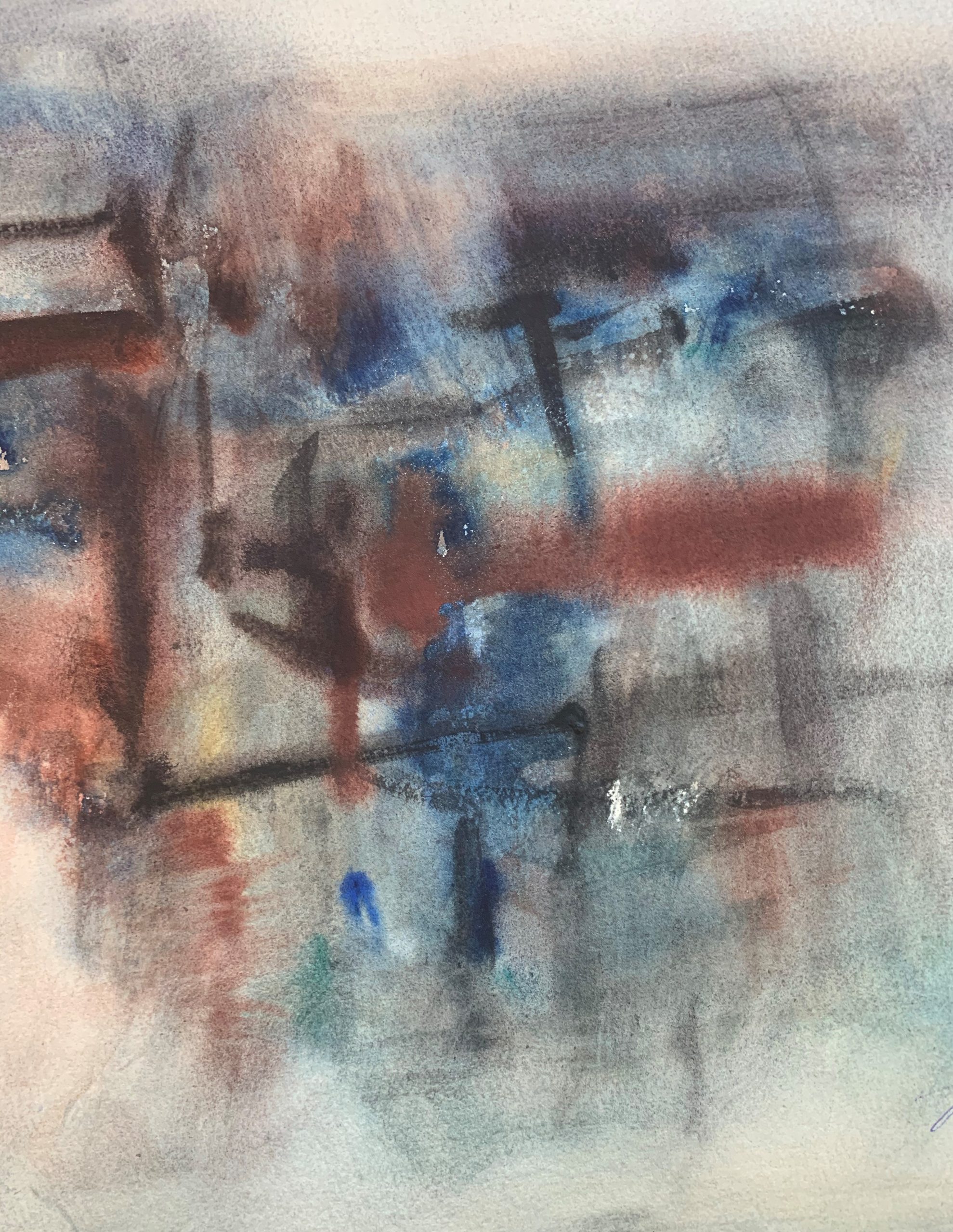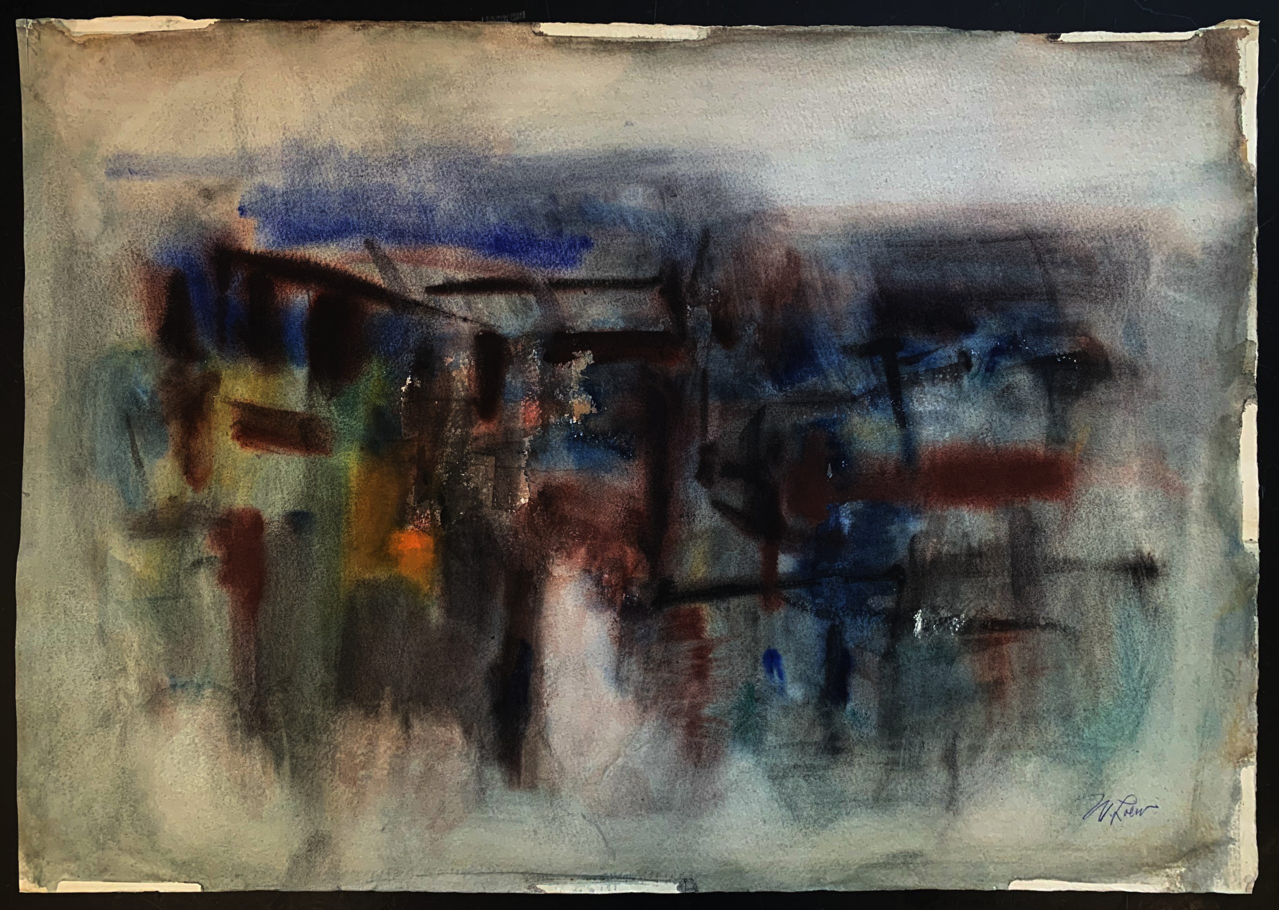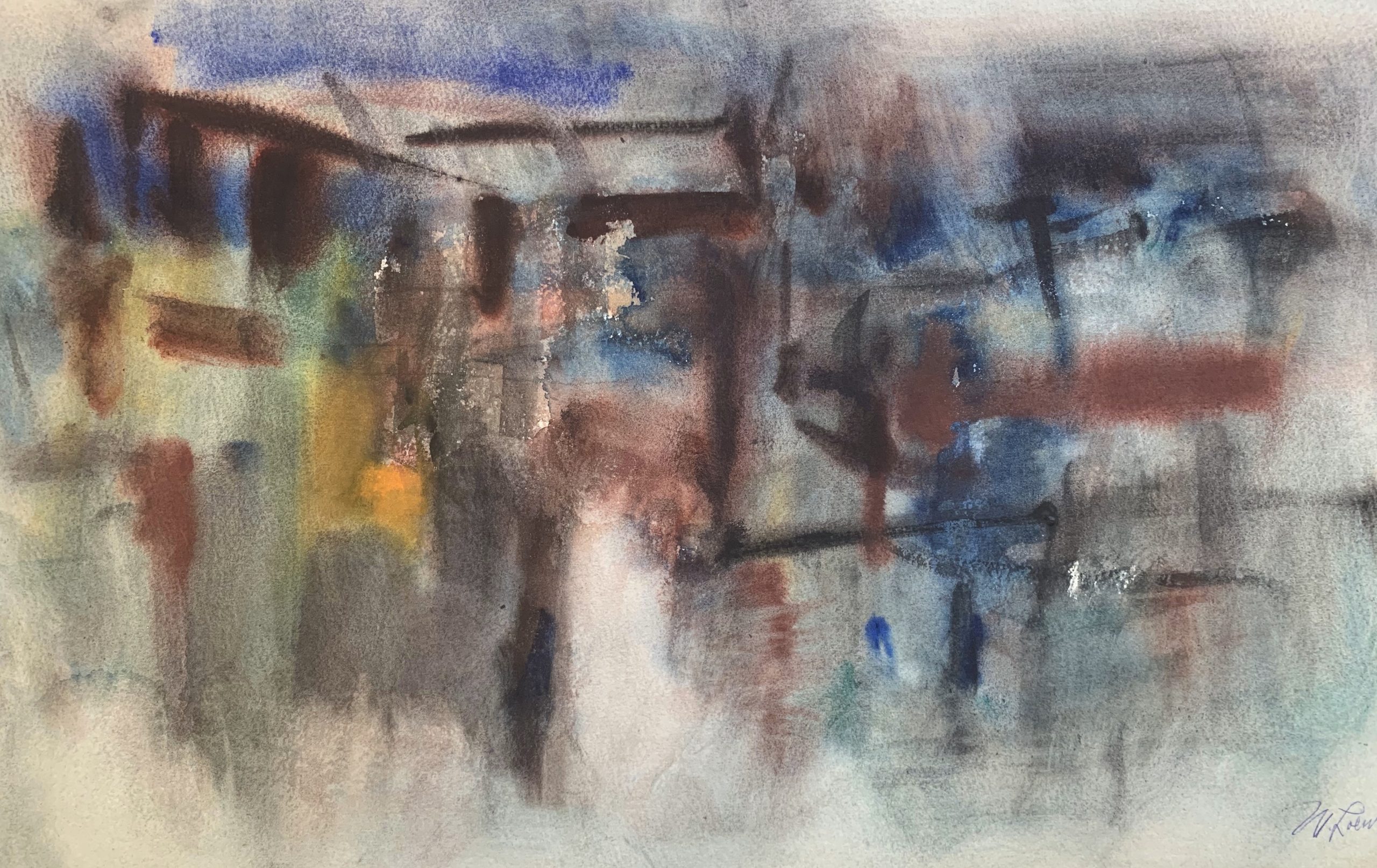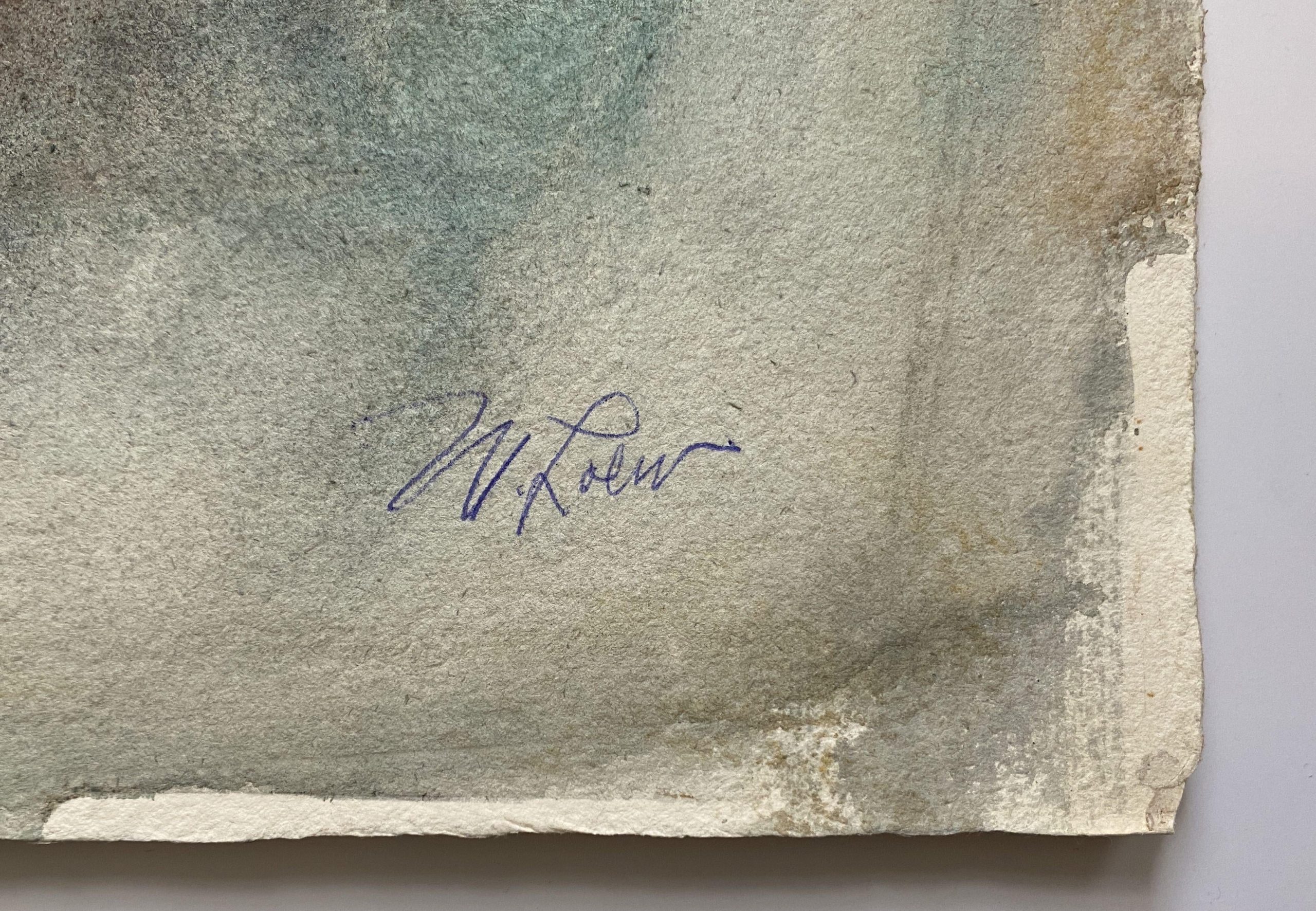 This watercolor, identified by Loew’s estate as 1970s, shows Loew at his best. His use of colors across the palette—dark and brooding and soft and pastel—created an evocative and compelling work. Loew is one of few abstractionists who paint abstractions of real items, though that is not always entirely clear to the viewer.