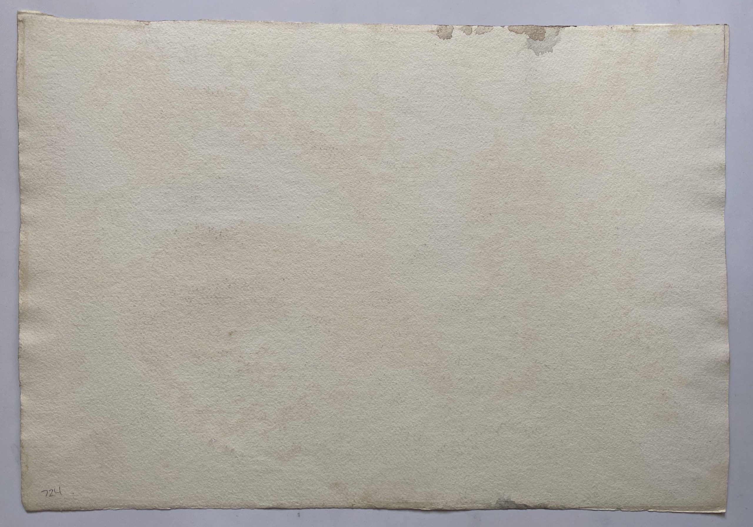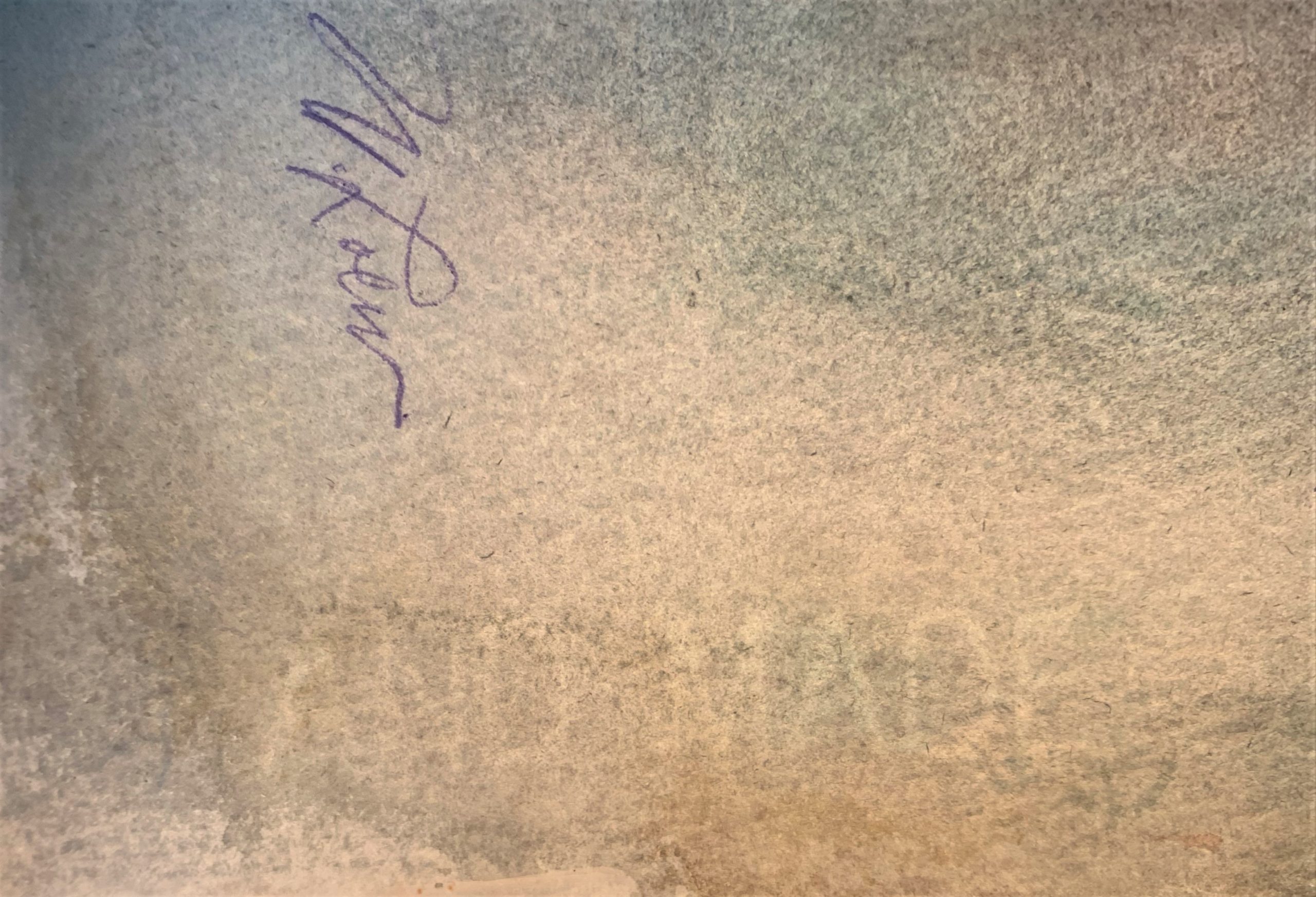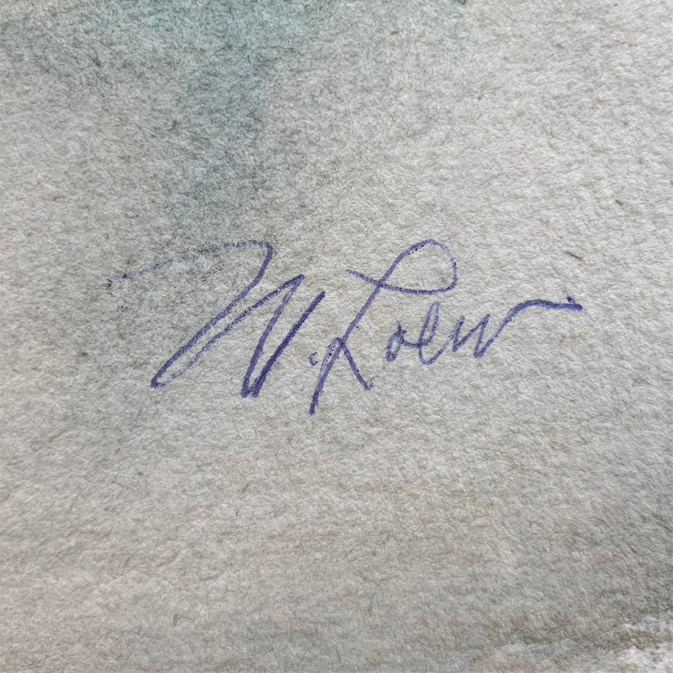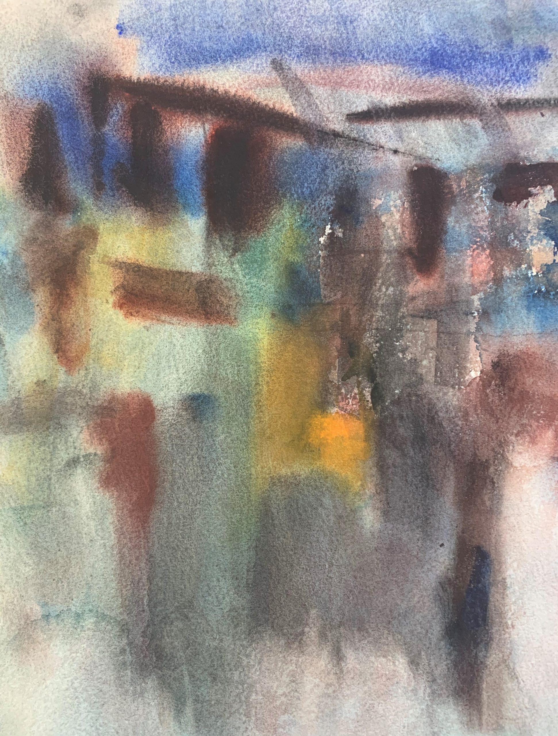 This watercolor, identified by Loew’s estate as 1970s, shows Loew at his best. His use of colors across the palette—dark and brooding and soft and pastel—created an evocative and compelling work. Loew is one of few abstractionists who paint abstractions of real items, though that is not always entirely clear to the viewer.