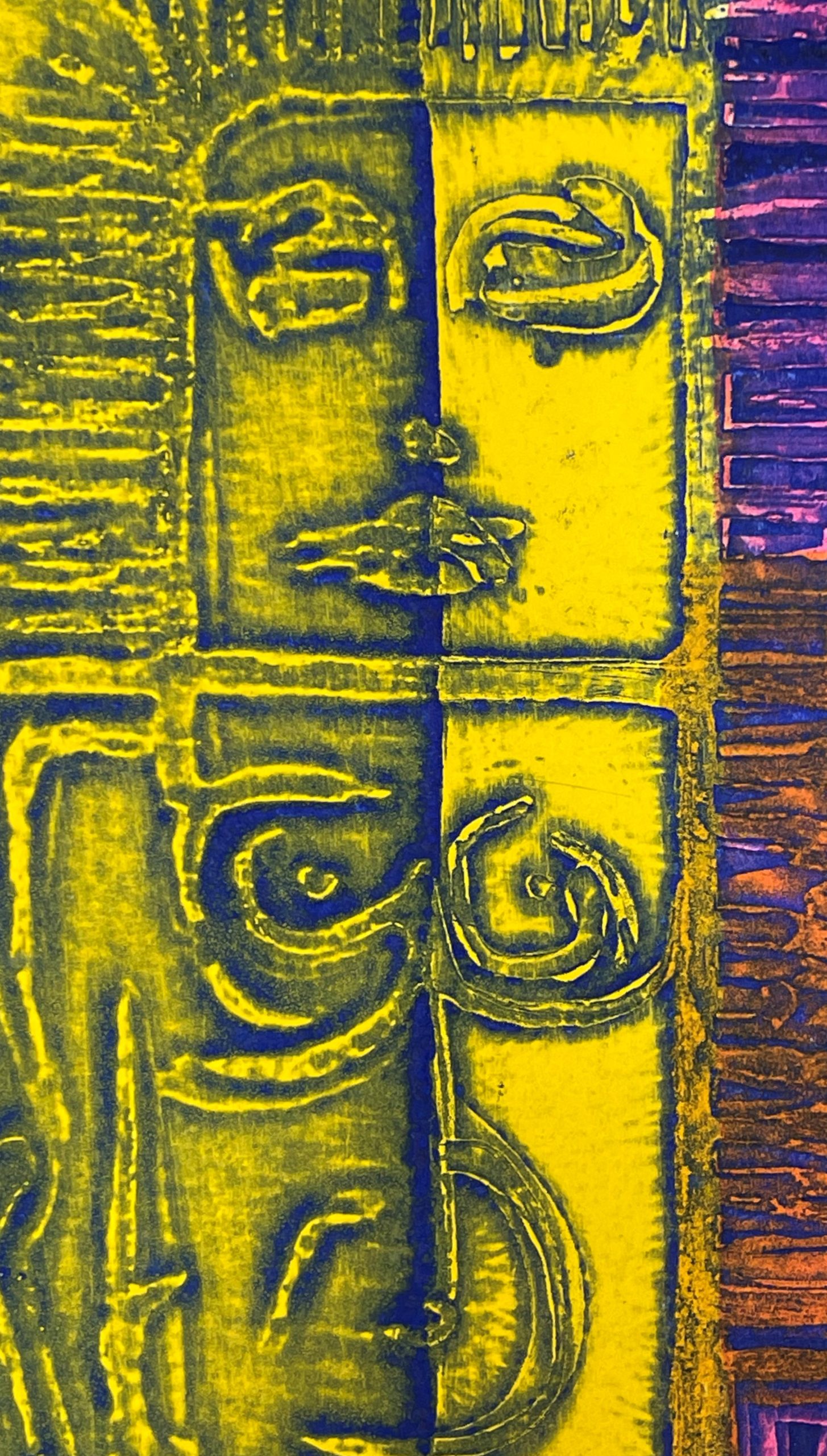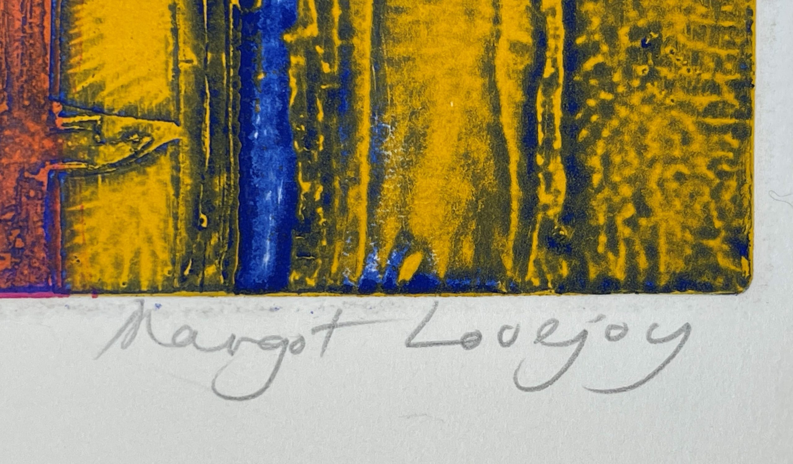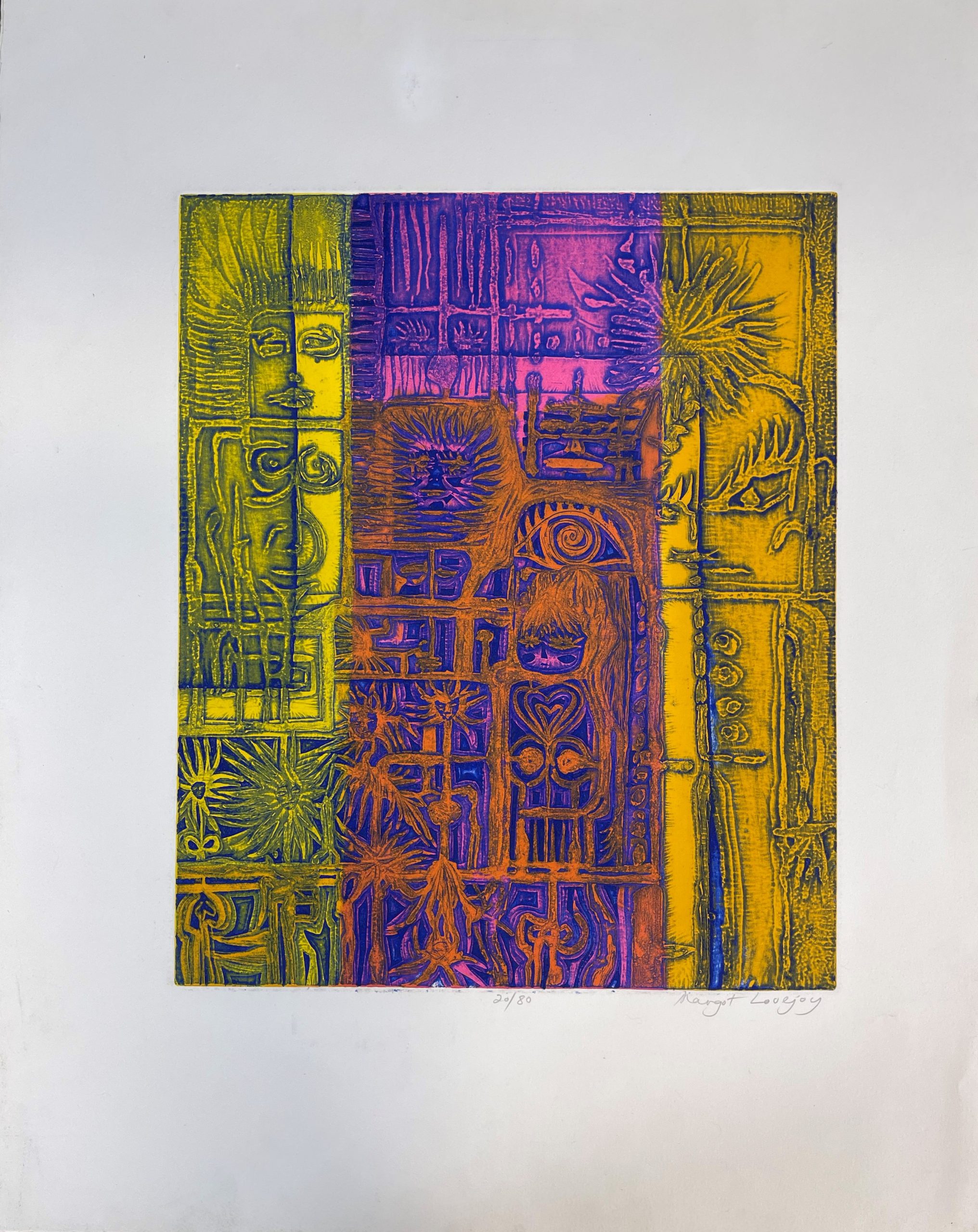 With rich colors laid thick on the paper and deeply impressed with the intaglio press, this picture is powerful and mystical. Margot Lovejoy was devoted to social justice activism and feminism; themes echoed in this work with totemic feminine figures almost hidden in the patterns.