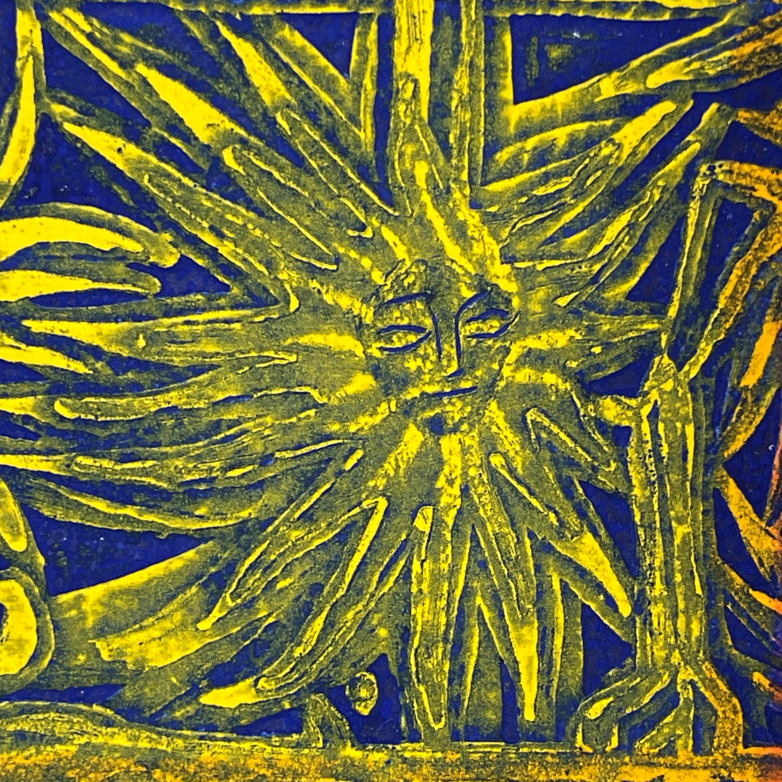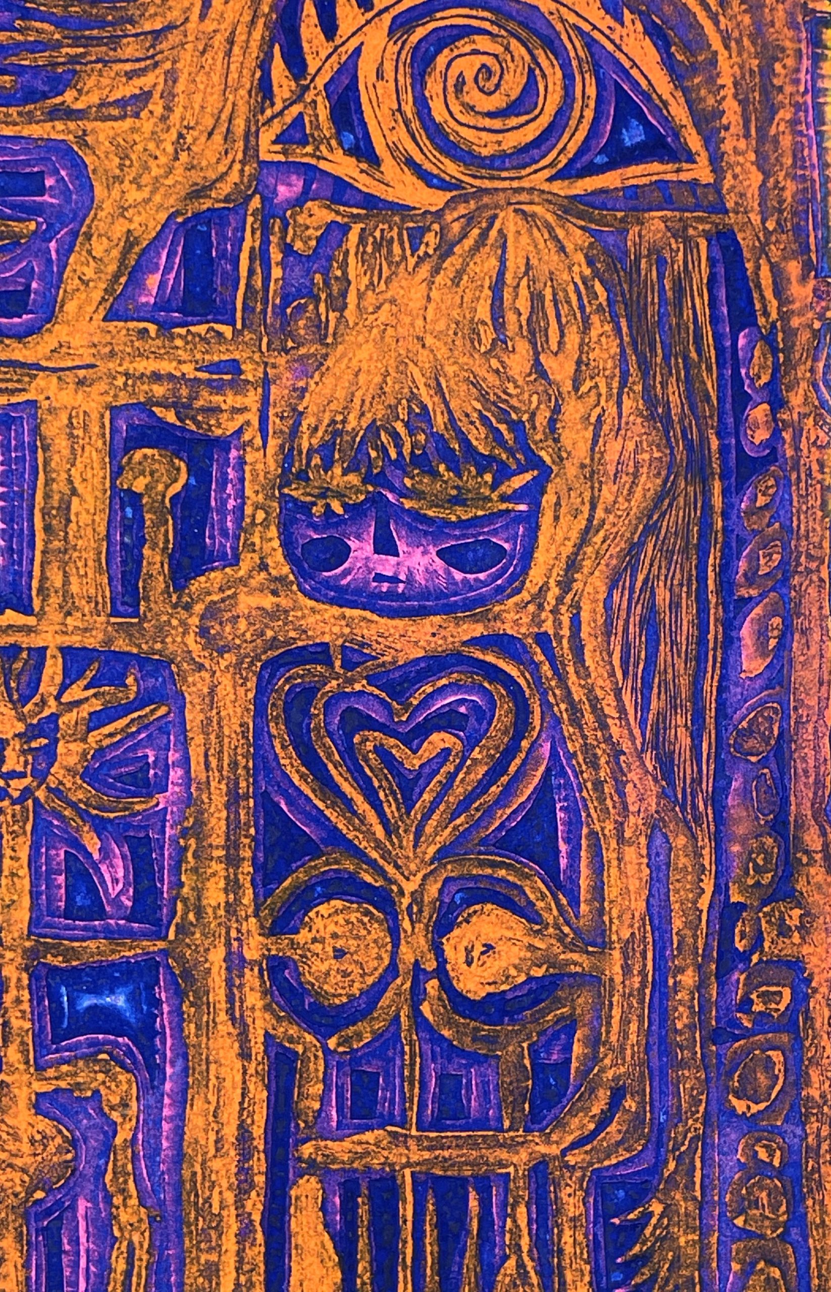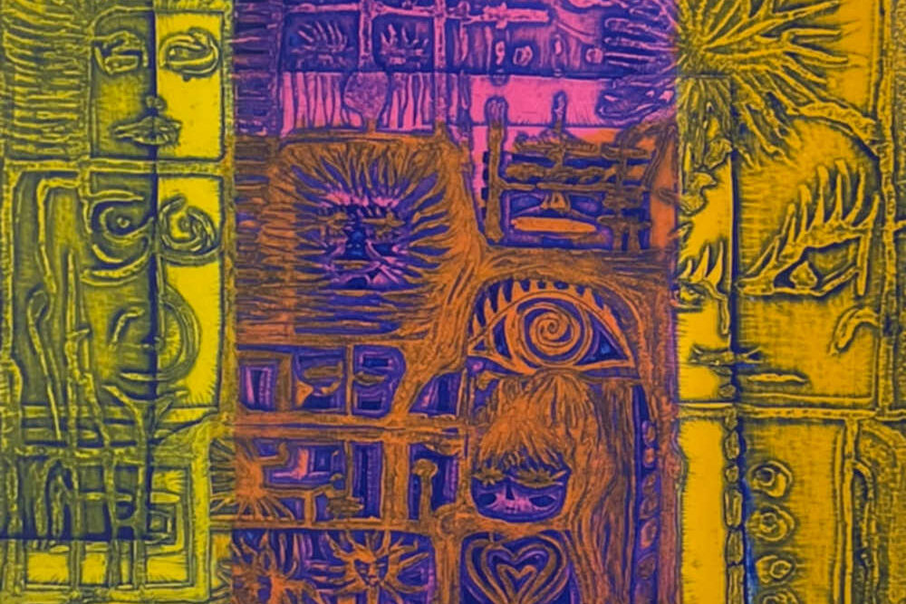 With rich colors laid thick on the paper and deeply impressed with the intaglio press, this picture is powerful and mystical. Margot Lovejoy was devoted to social justice activism and feminism; themes echoed in this work with totemic feminine figures almost hidden in the patterns.