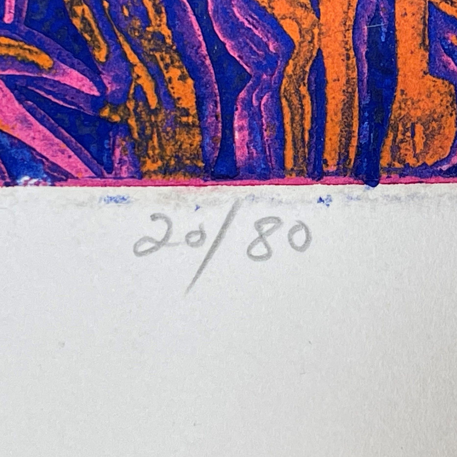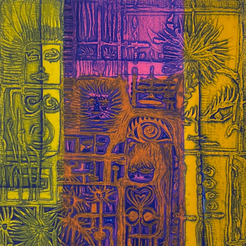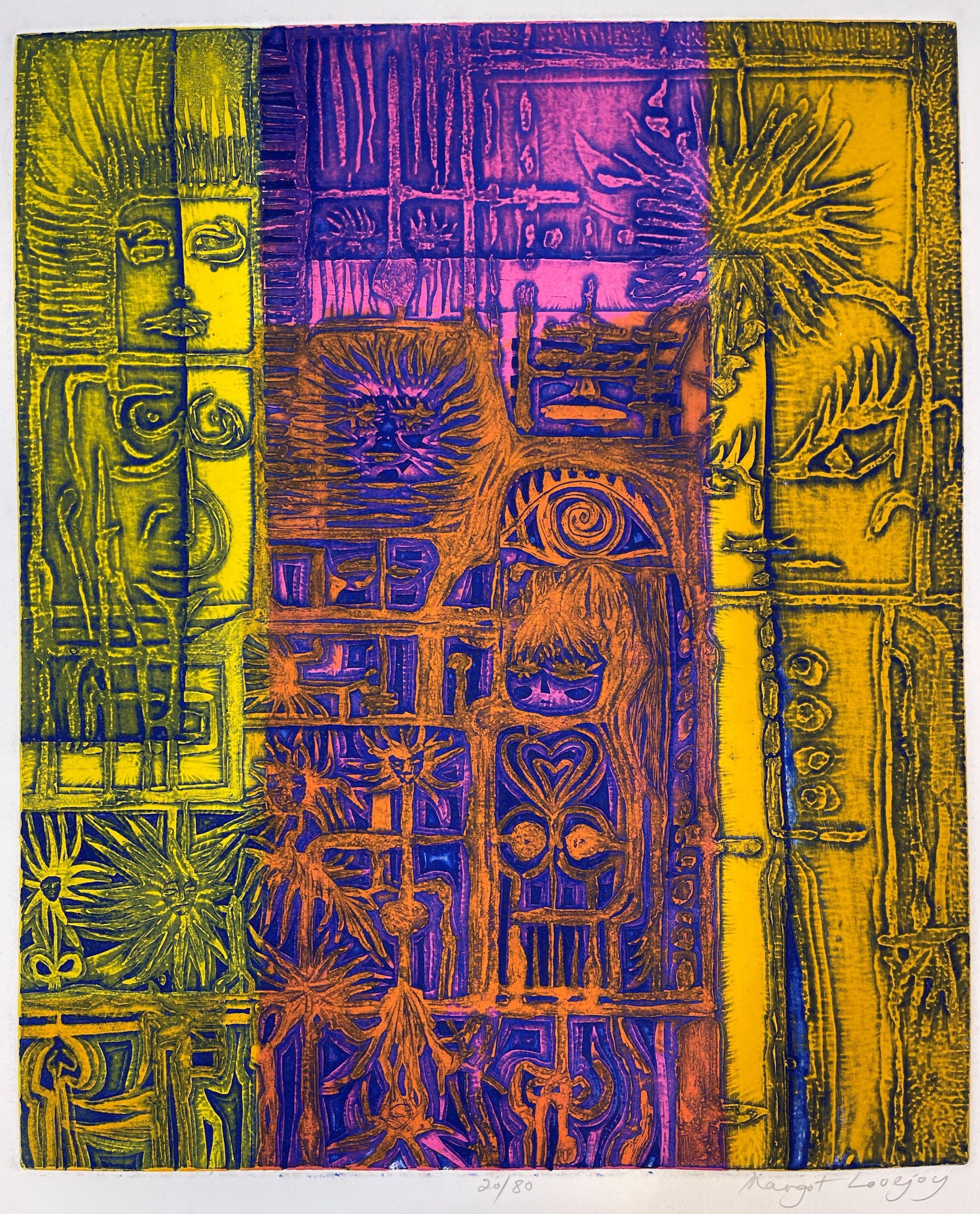 With rich colors laid thick on the paper and deeply impressed with the intaglio press, this picture is powerful and mystical. Margot Lovejoy was devoted to social justice activism and feminism; themes echoed in this work with totemic feminine figures almost hidden in the patterns.