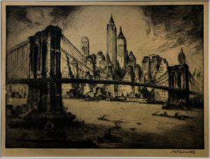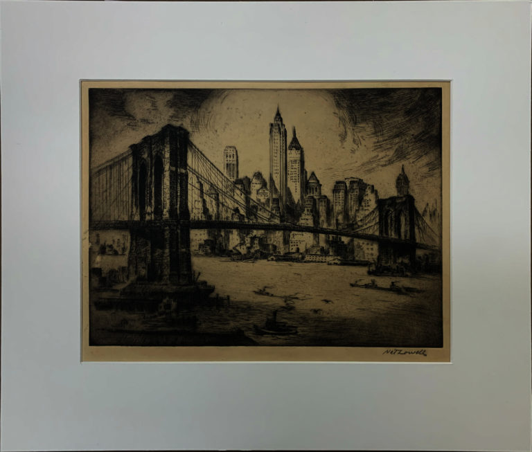 Nat Lowell devoted his extraordinary skills as a print-maker to documenting New York City and its landmarks. This work, of course, shows the Brooklyn Bridge and a view of the Manhattan skyline from the East River.