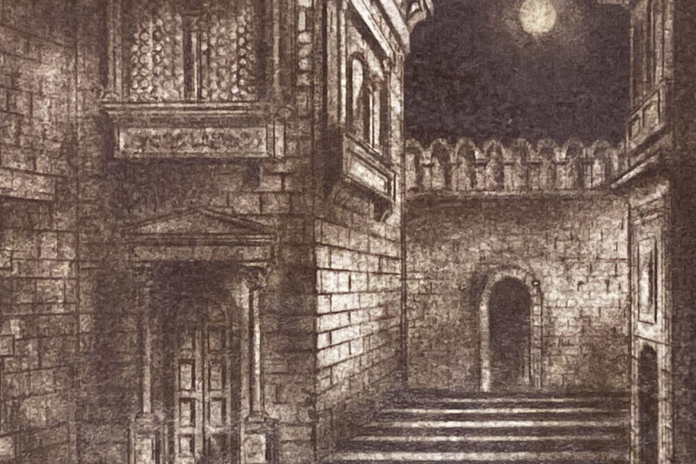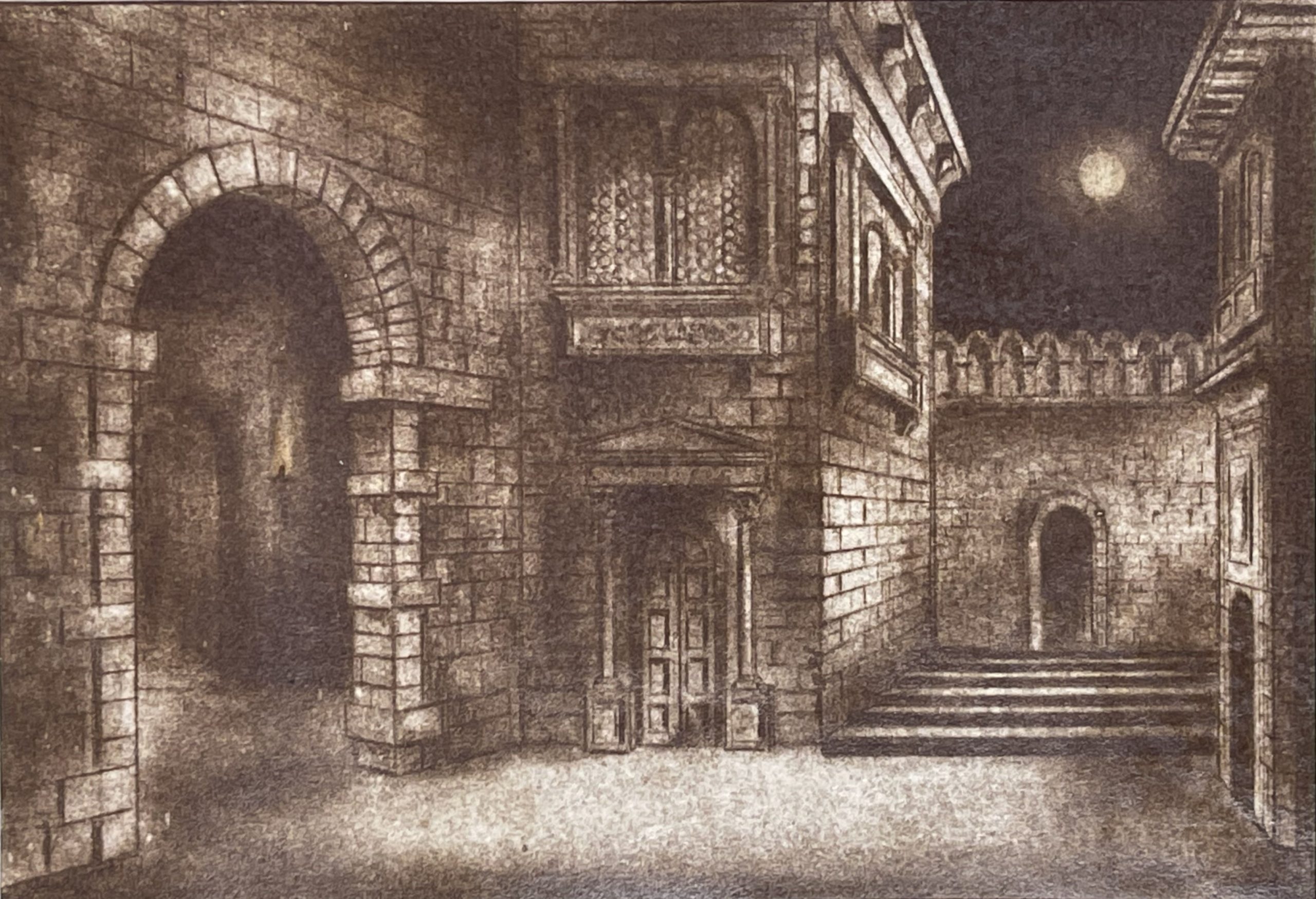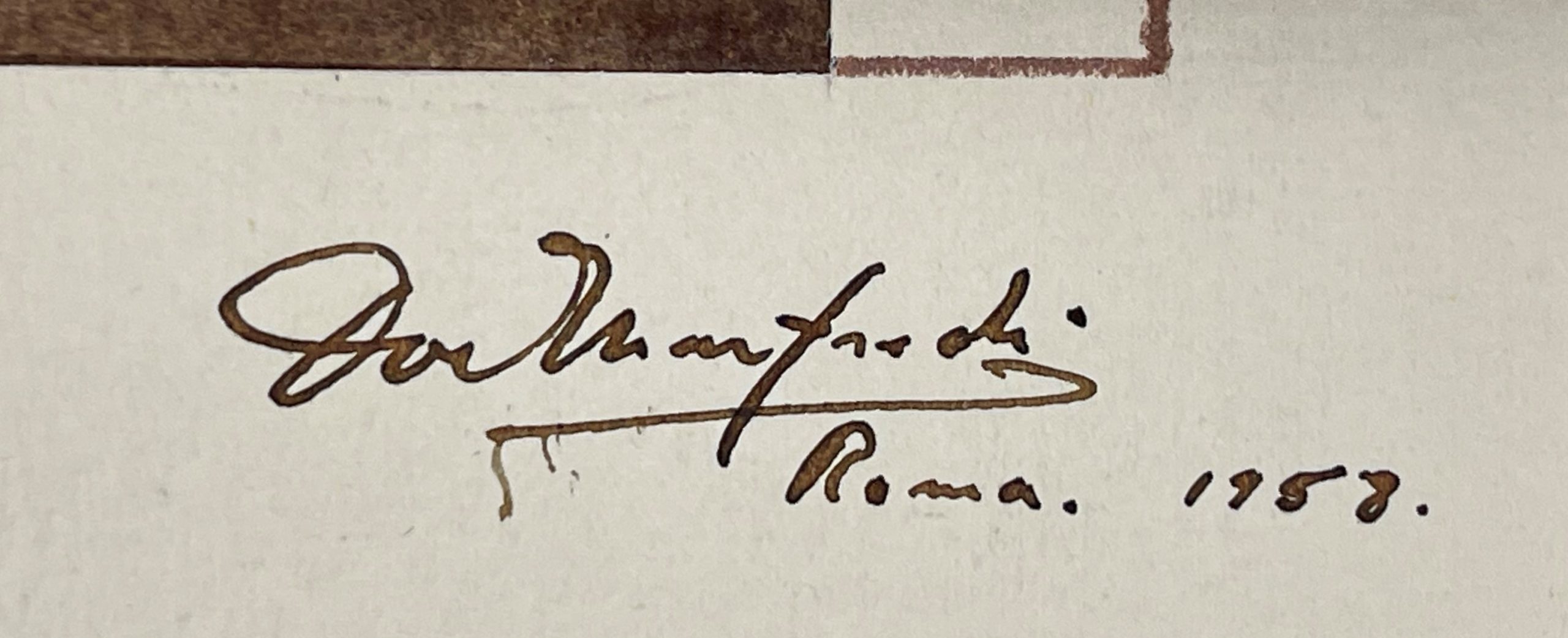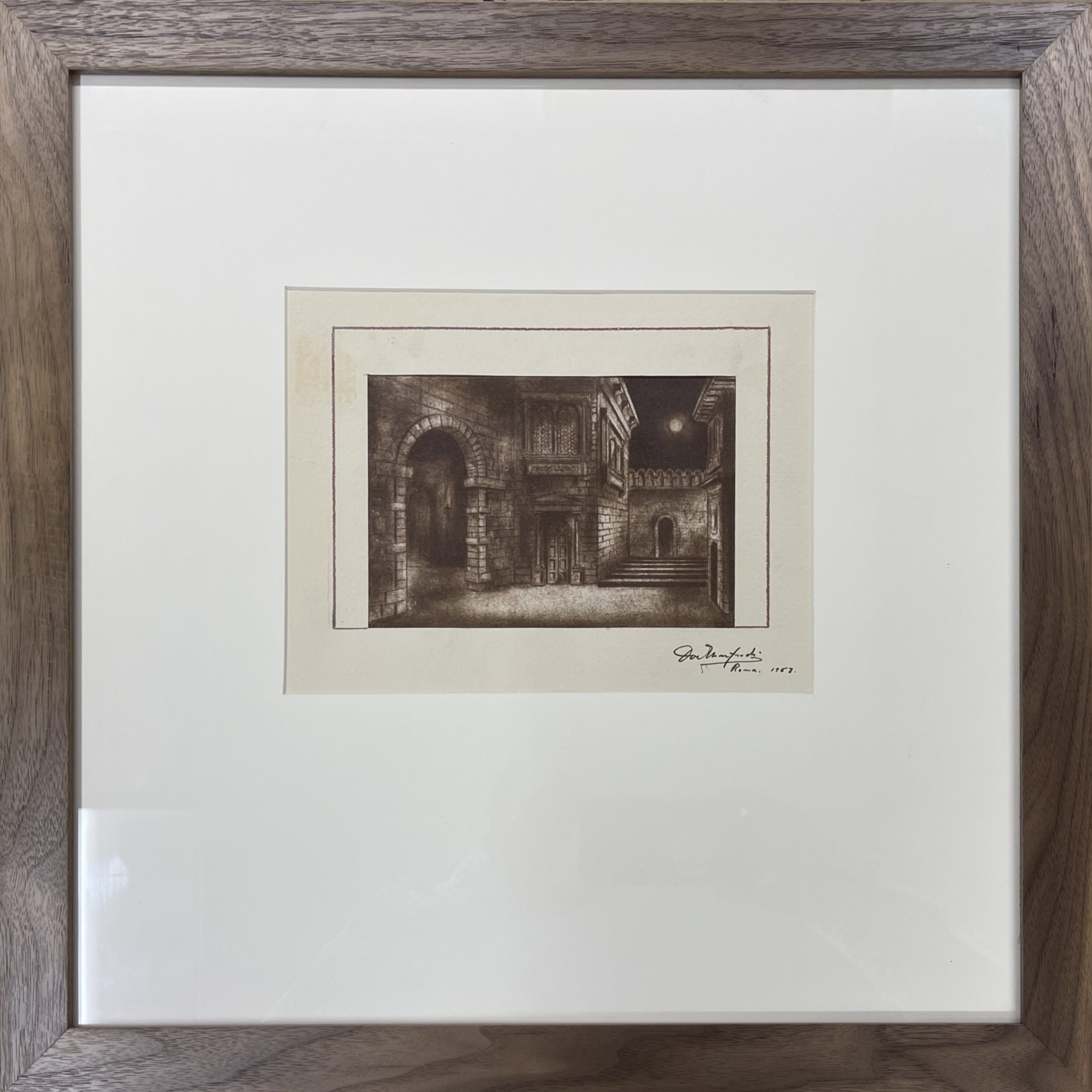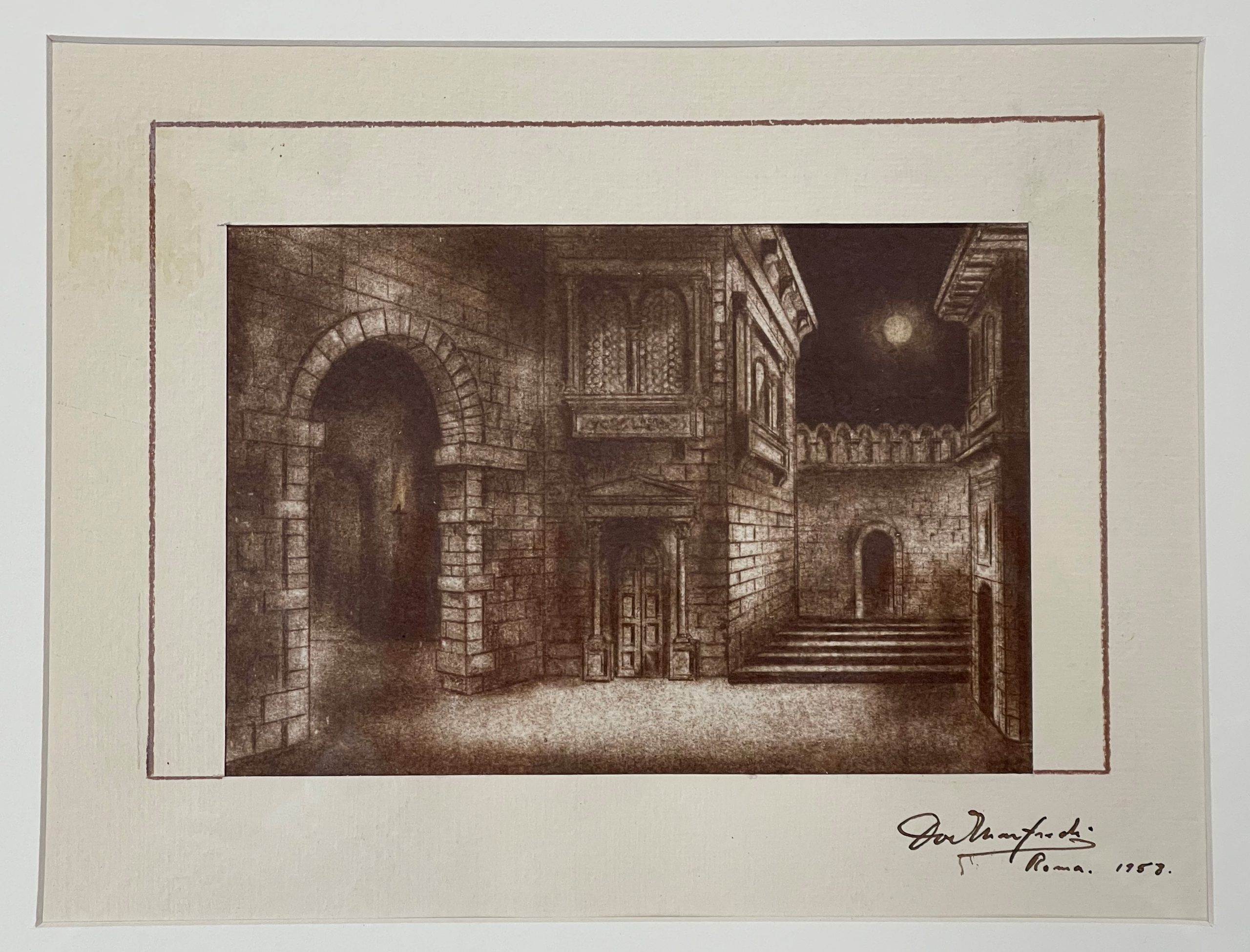 Dominic Manfredi was an artist, lauded by the New York Times as “highly imaginative” when he was only sixteen years old, but by the time he finished his education he had entered the field of set design. While he worked primarily on Broadway, he completed this work in Rome, likely for the 1959 production of Tosca at La Scala.