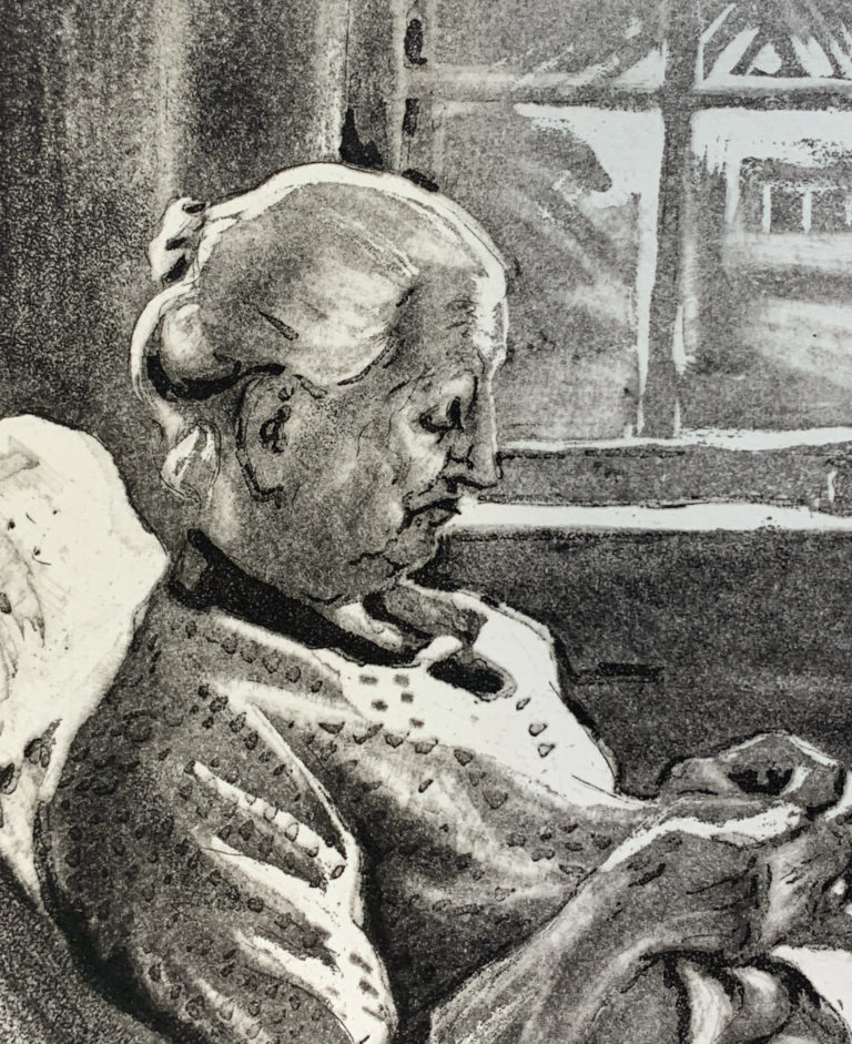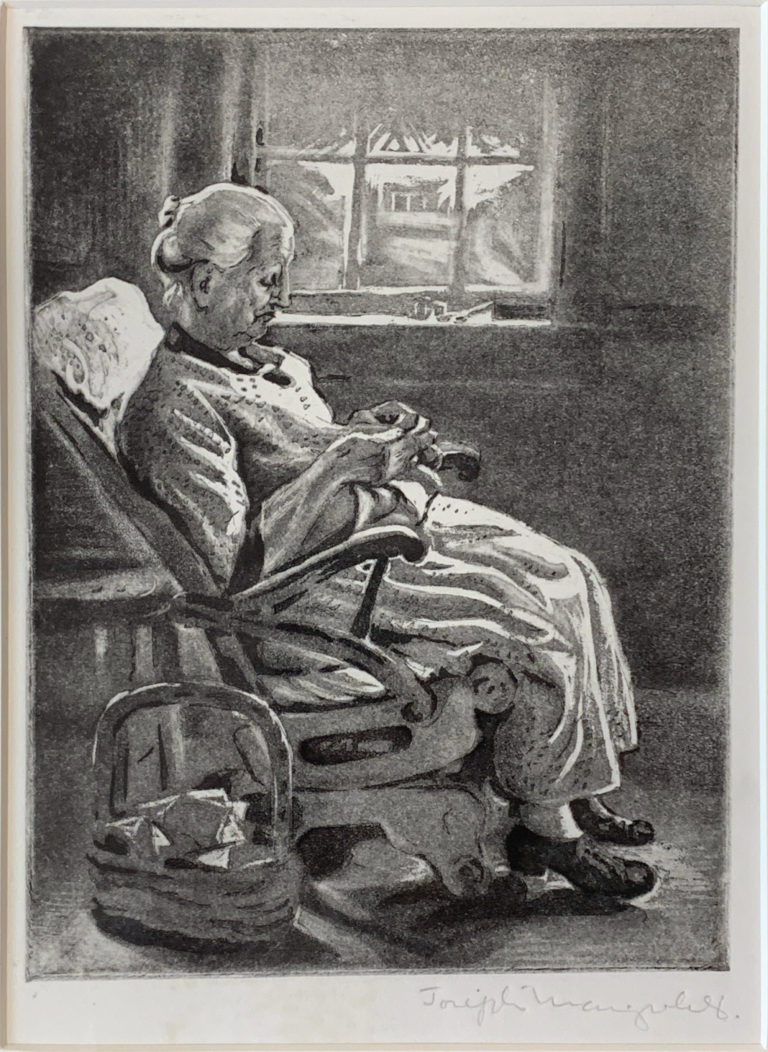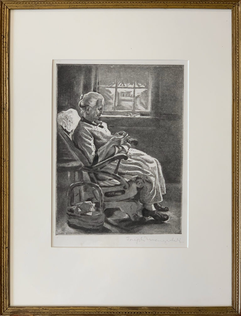 A masterful etching by Joseph Margulies, a universally-acknowledged master of the art. A white haired woman sitting in an easy chair by a window working on sewing.