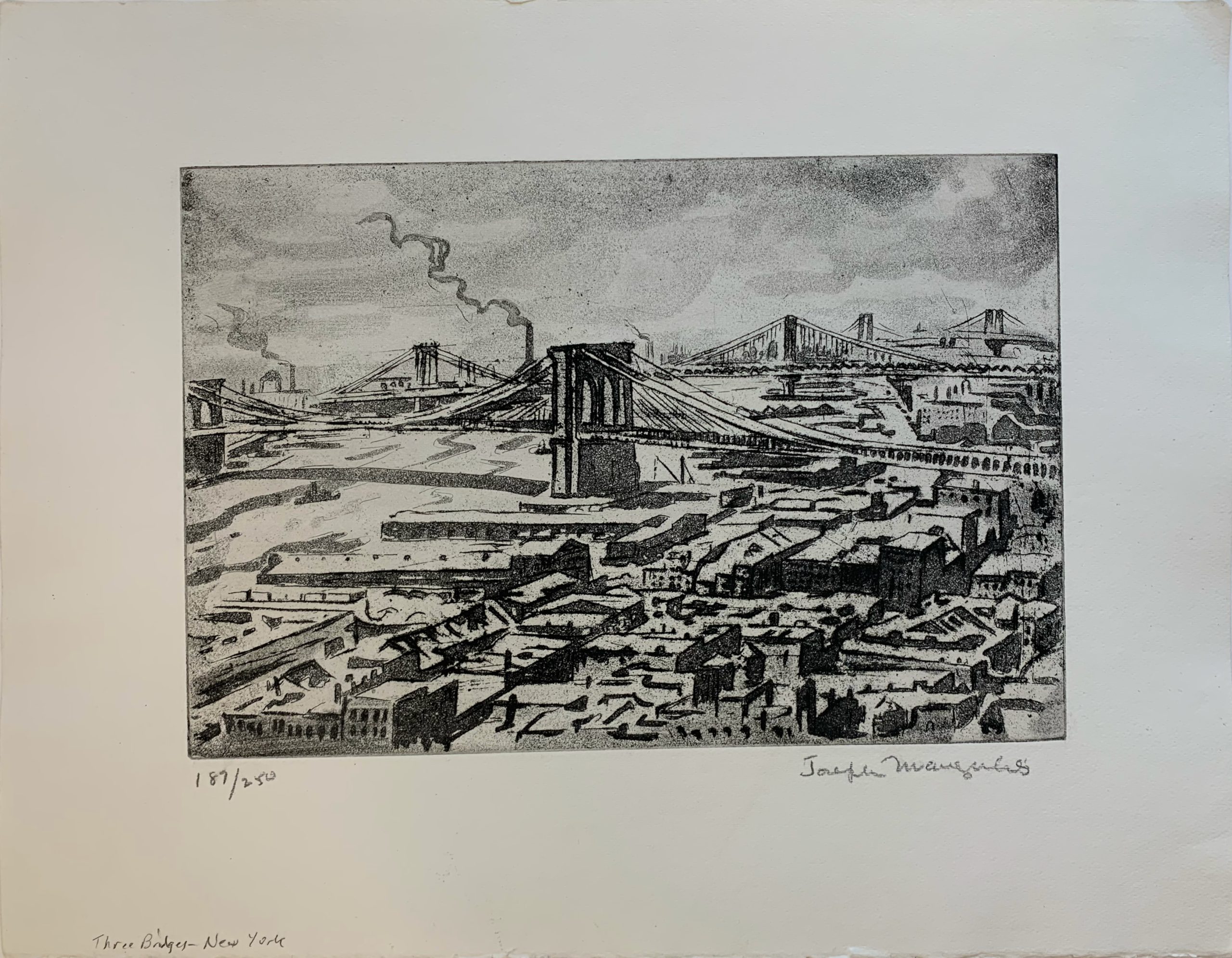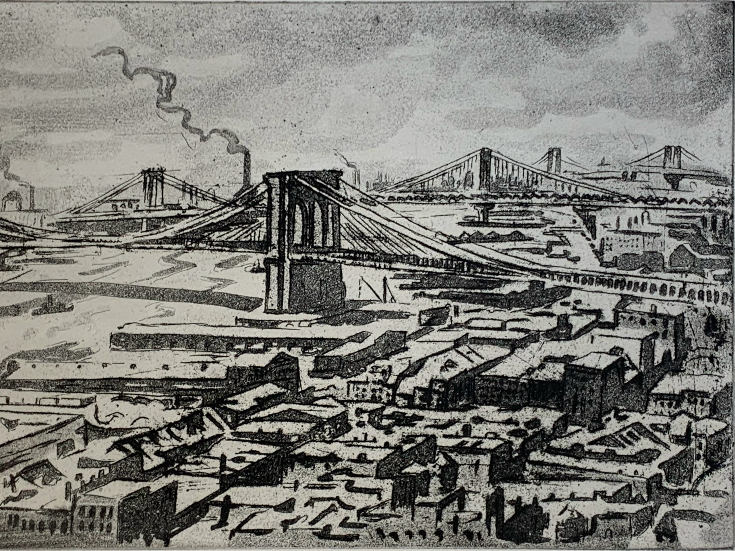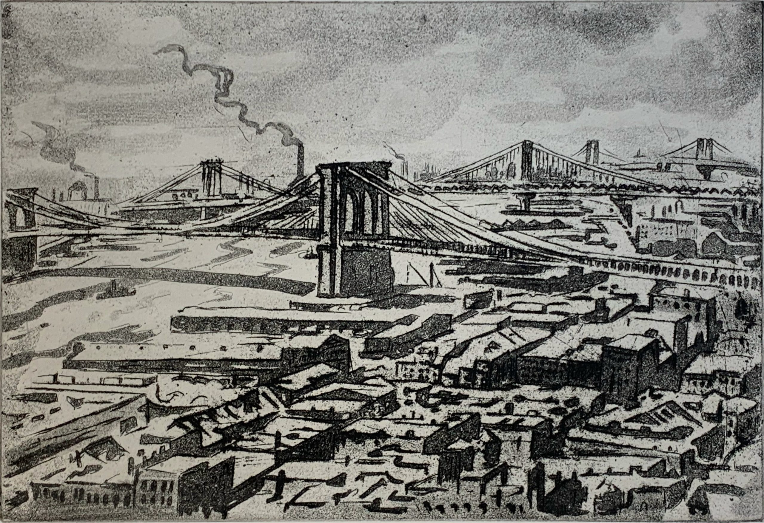 Joseph Margulies made multiple etchings of the bridges of New York; this is his only etching showing all three bridges. Margulies was not alone in finding New York bridges to be emblematic; they are many, including Nat Lowell’s moody picture of the Brooklyn Bridge.