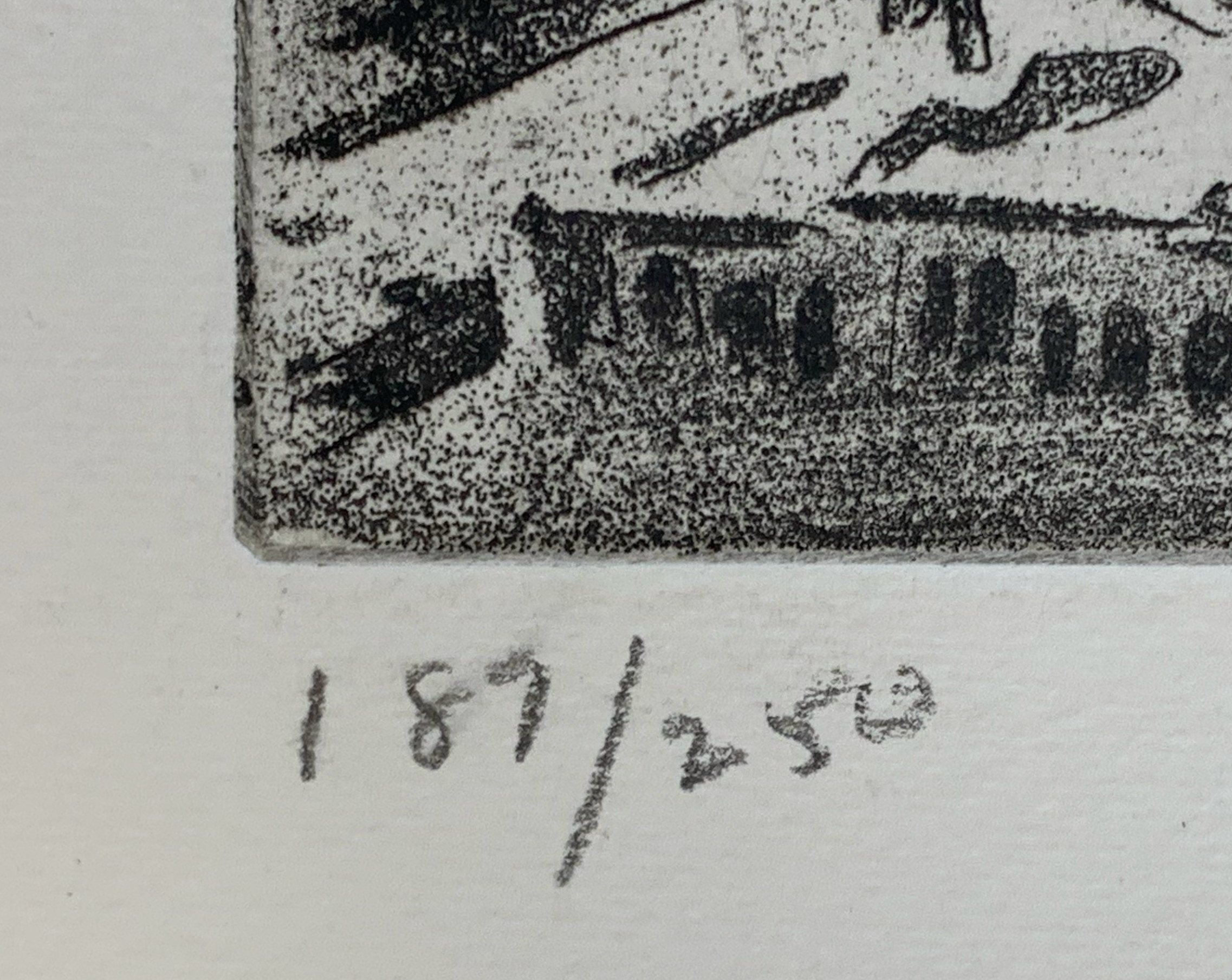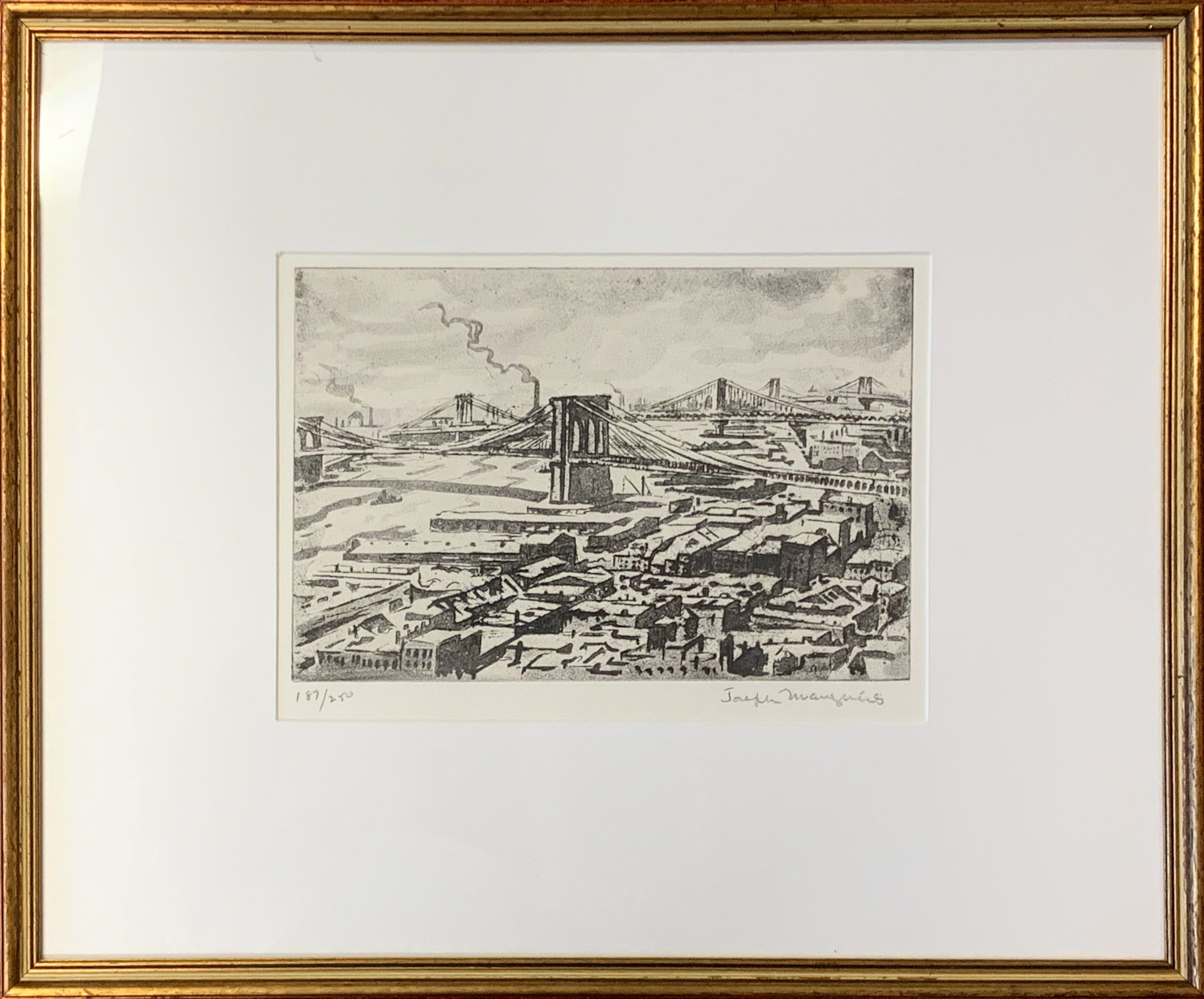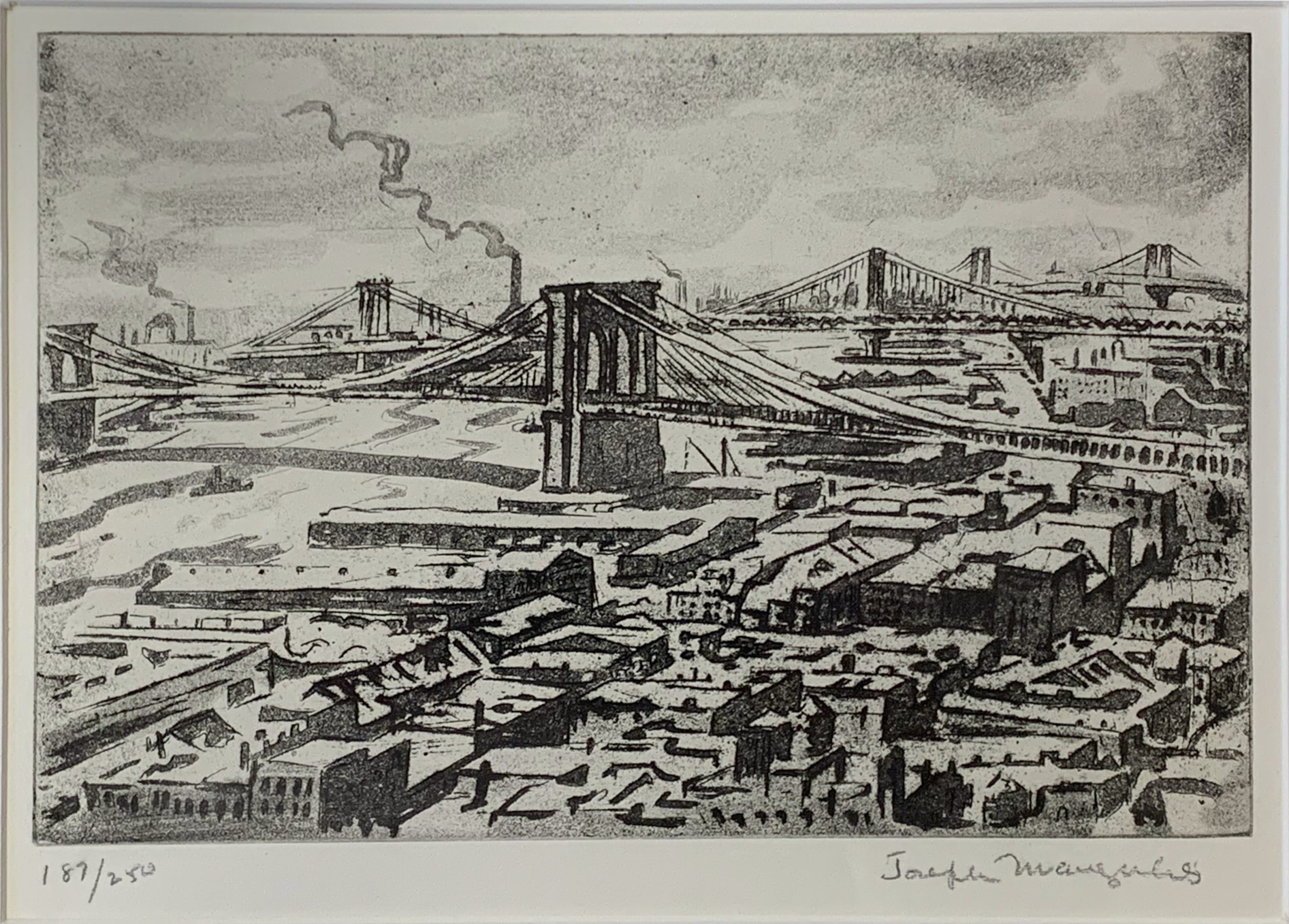 Joseph Margulies made multiple etchings of the bridges of New York; this is his only etching showing all three bridges. Margulies was not alone in finding New York bridges to be emblematic; they are many, including Nat Lowell’s moody picture of the Brooklyn Bridge.