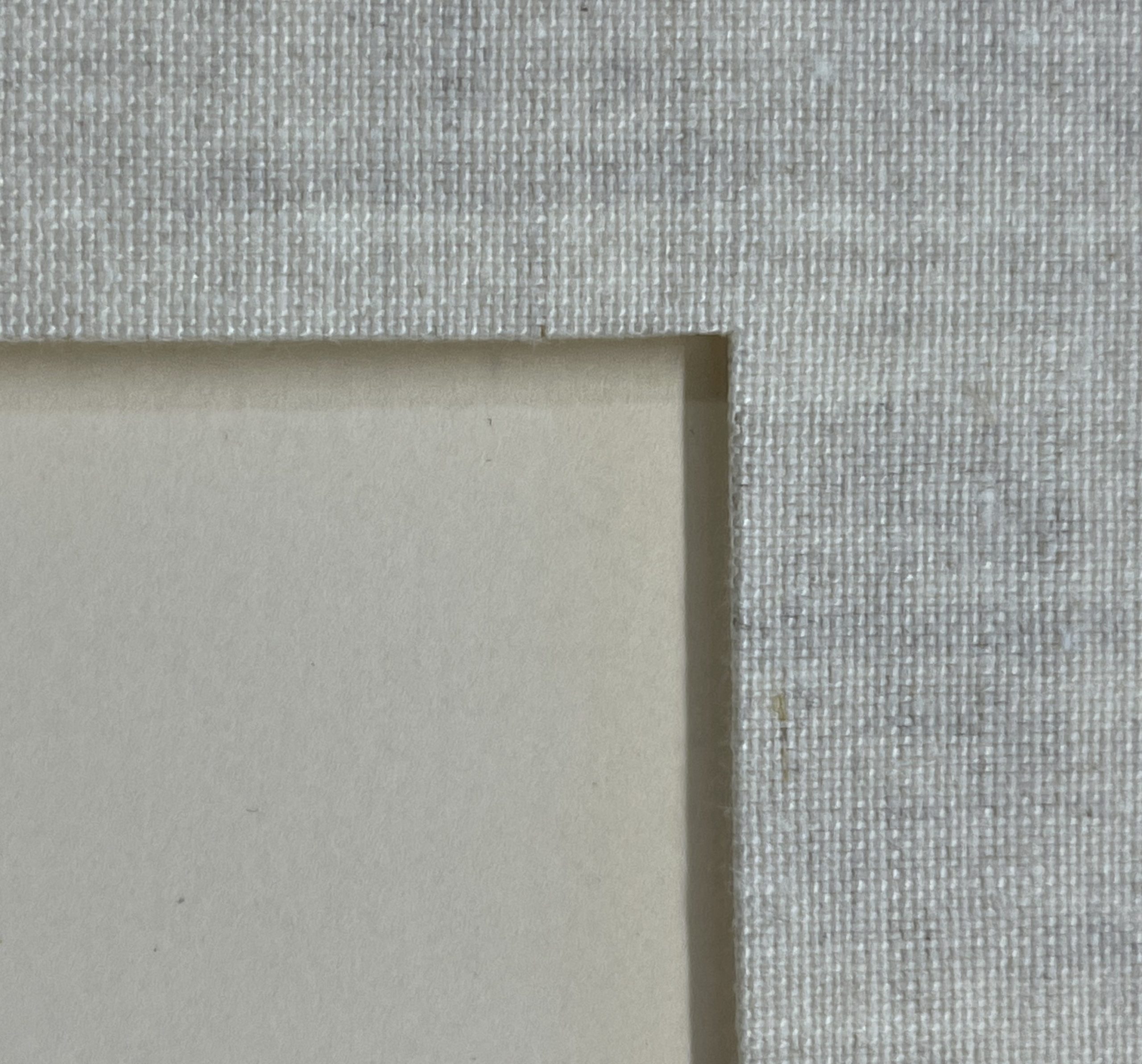 Custom framed in a solid wood frame with a fabric-wrapped mat behind 99% UV-blocking art glass using strictly conservation-grade materials.