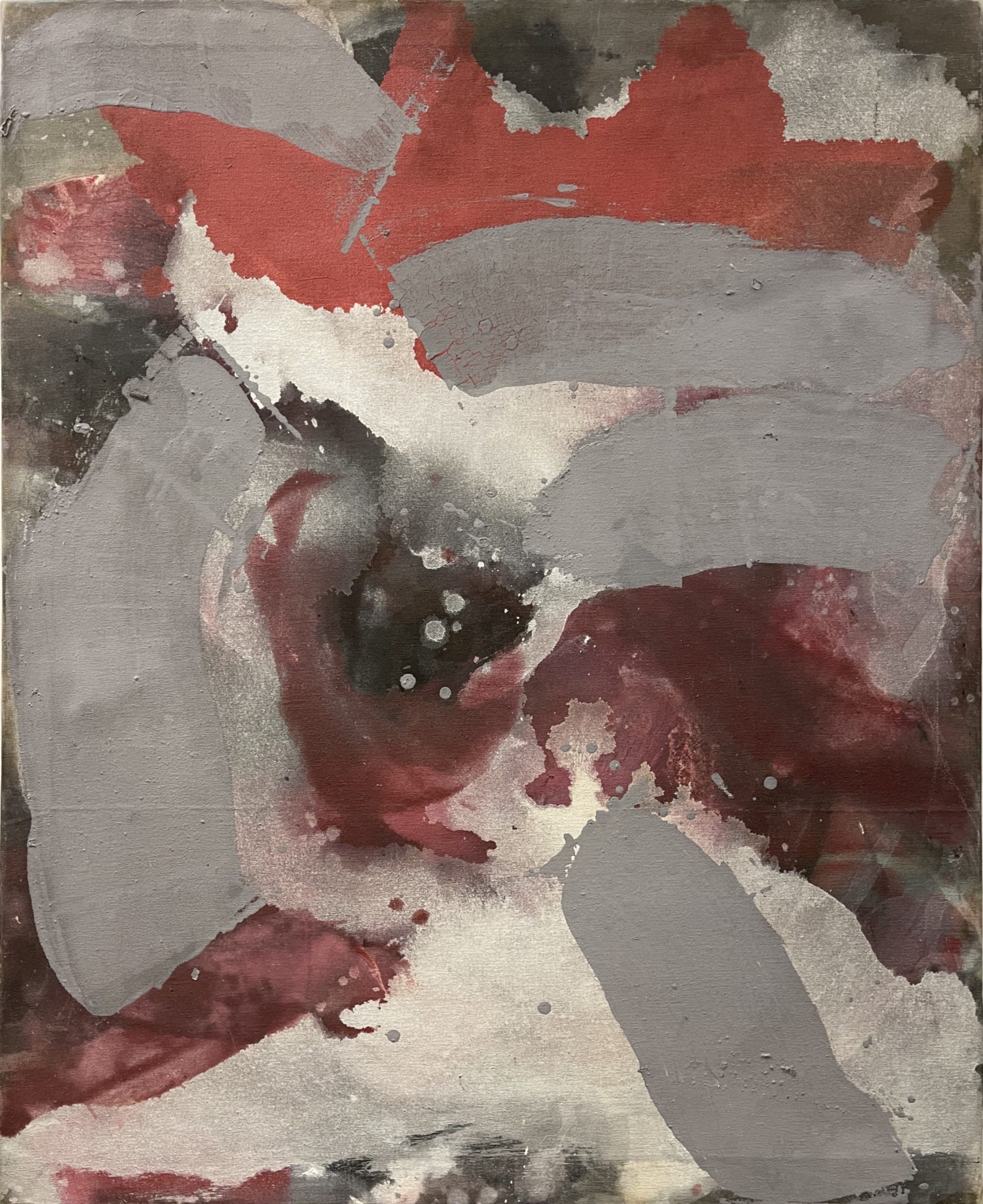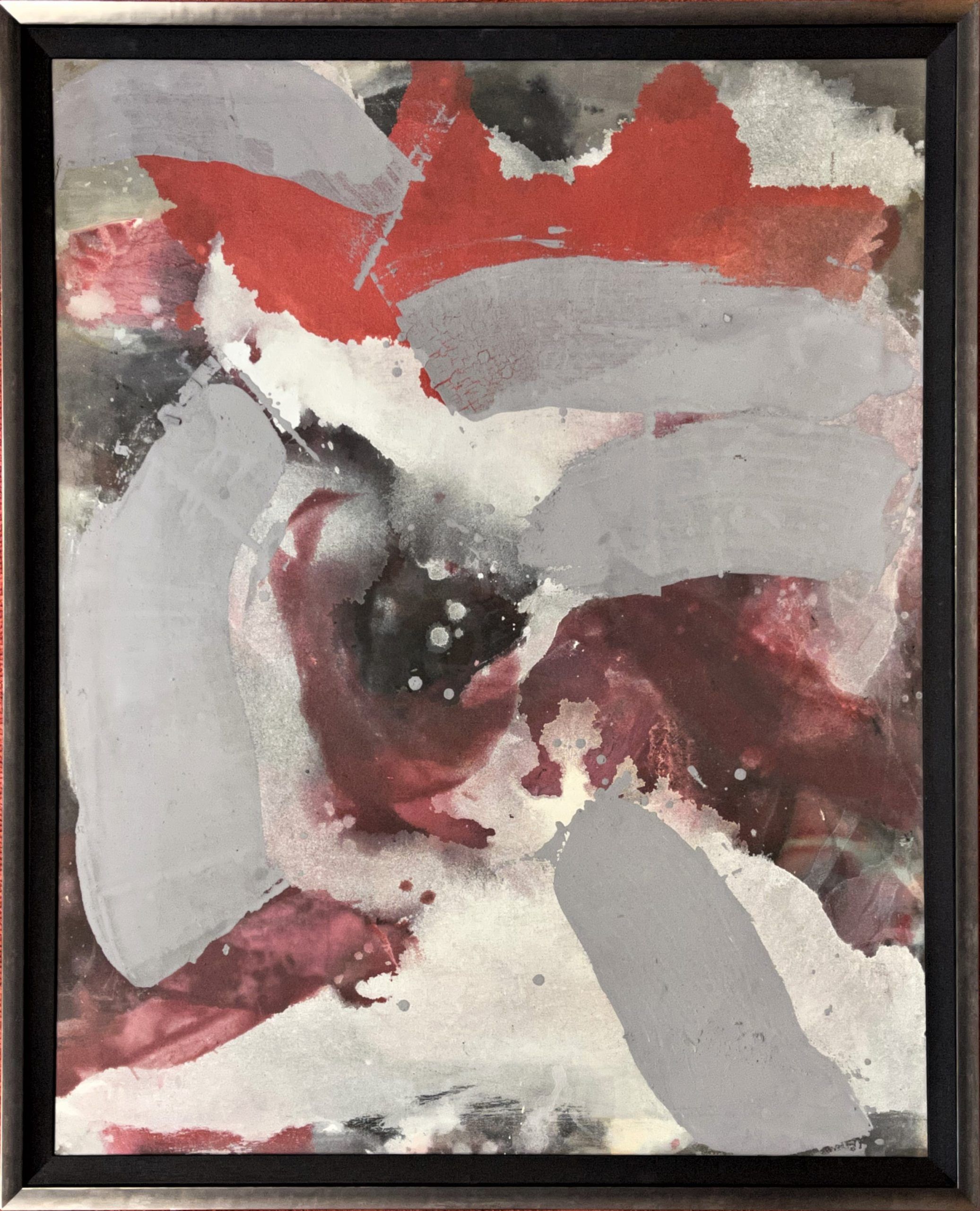 This untitled composition in Gray, Black, Red, White, and Cranberry is one of the very few of Mehring’s early works which remain extant. With layering of paint spread on an unprimed canvas, the work is simultaneously bright and dark, ordered and chaotic.