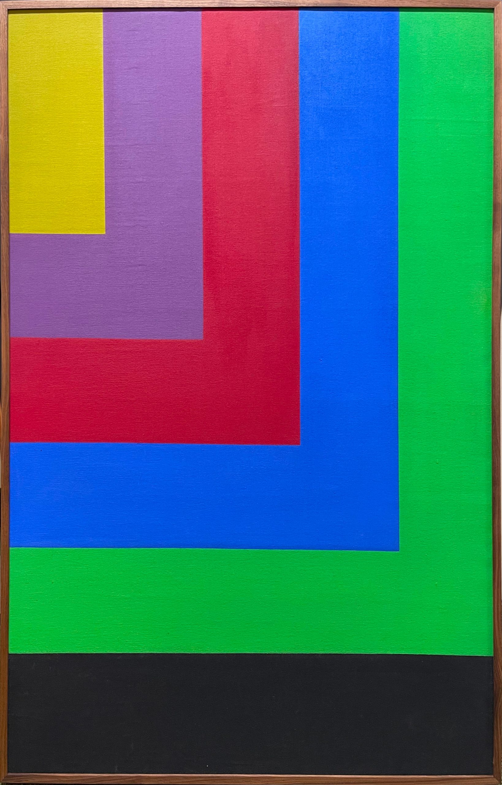 A magnificent work of hard-edged abstraction by one of the seminal Washington Color School painters, this example presented in bright, vibrant, and daring color. Its color and scale make it a showpiece. With an attractive provenance. Beautifully float-framed in a solid oiled Walnut frame.