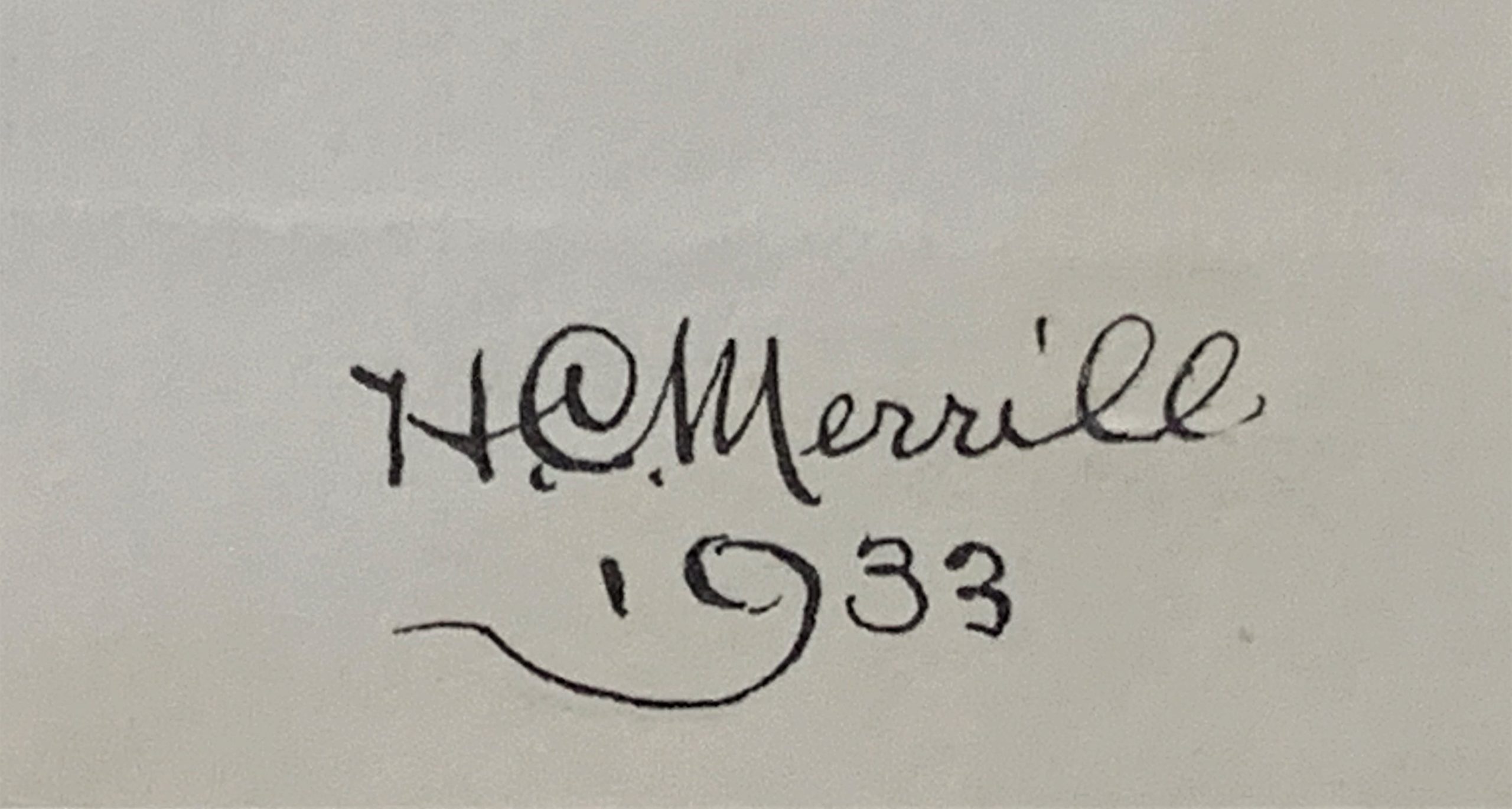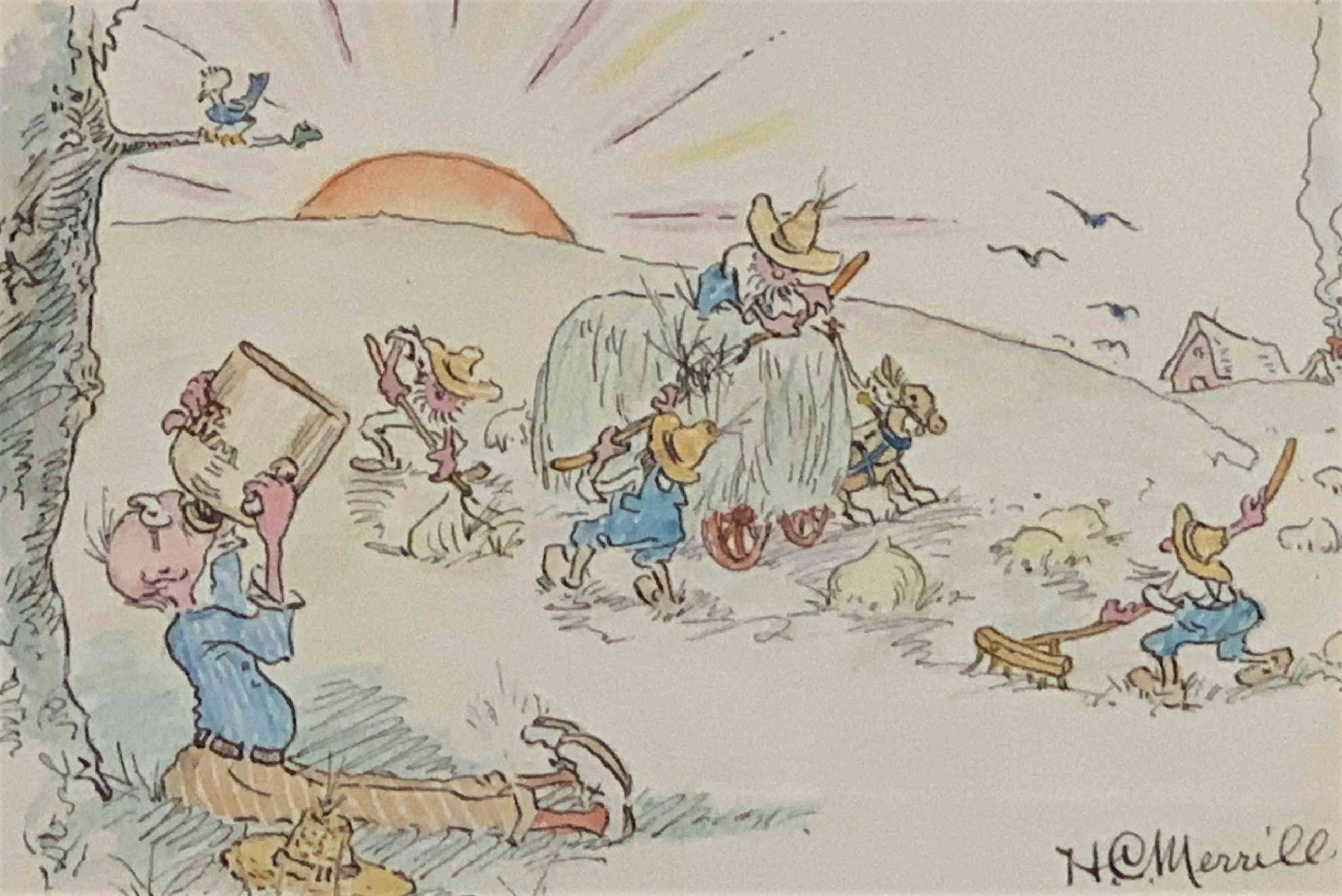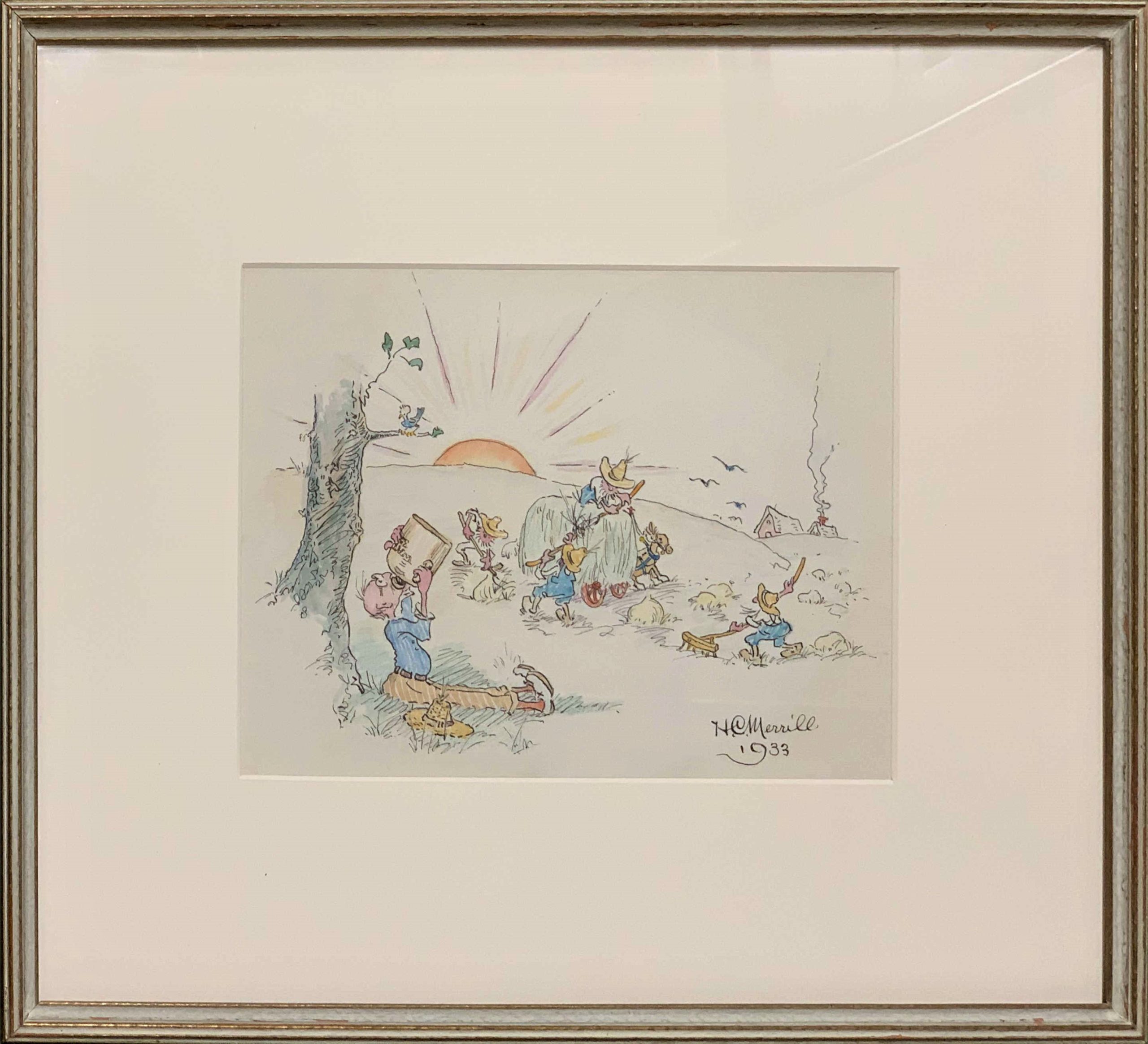 A humorous work by Hiram Campbell Merrill, an artist whose work more often focused on the beauty of nature.  Grandpa is enjoying the late afternoon, quenching his thirst, while his grandchildren do the farm’s work.  Finally made and finely framed by an accomplished pre-War printmaker.
