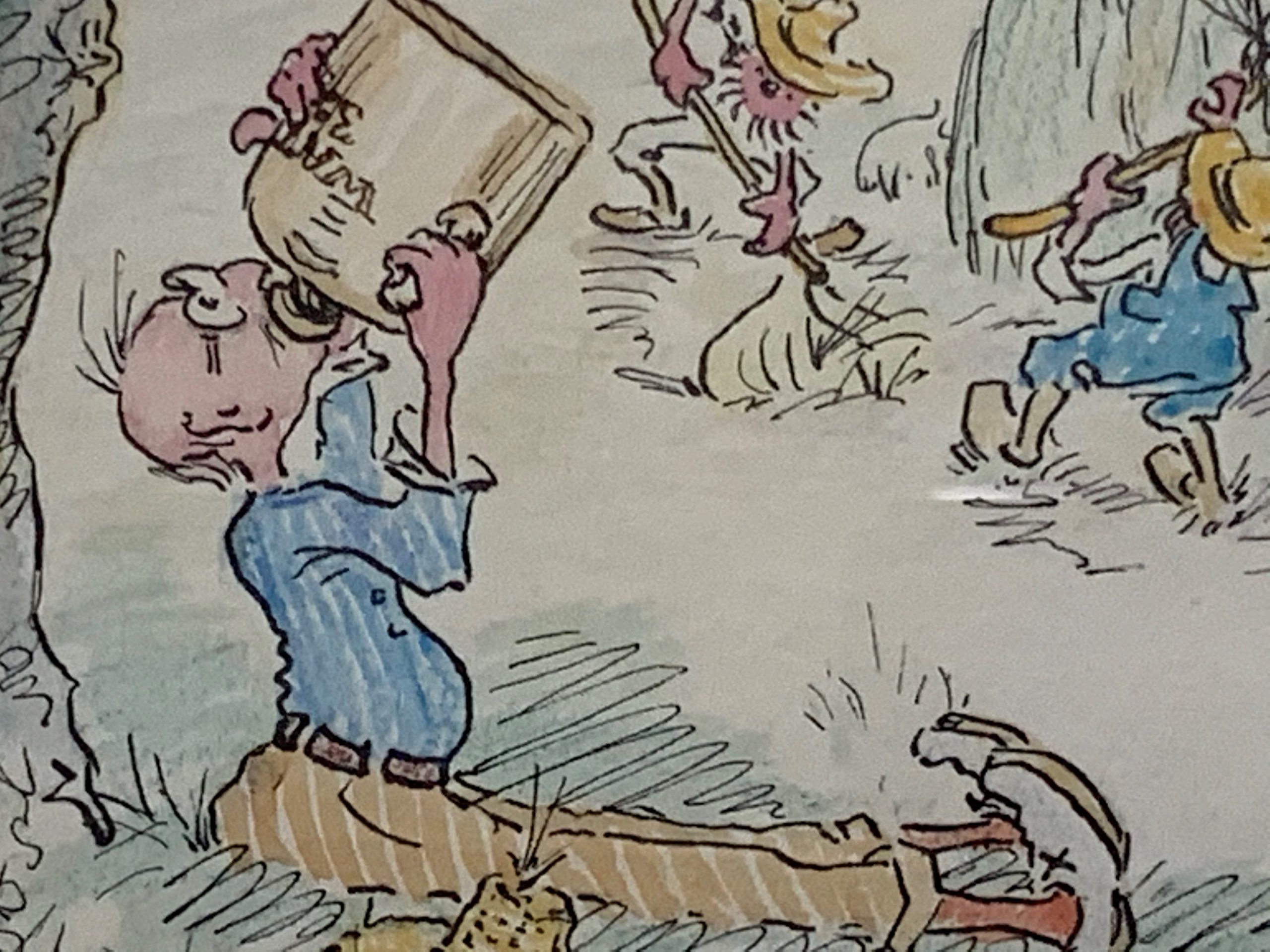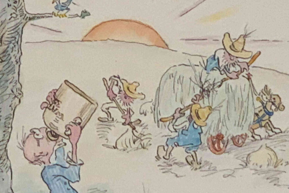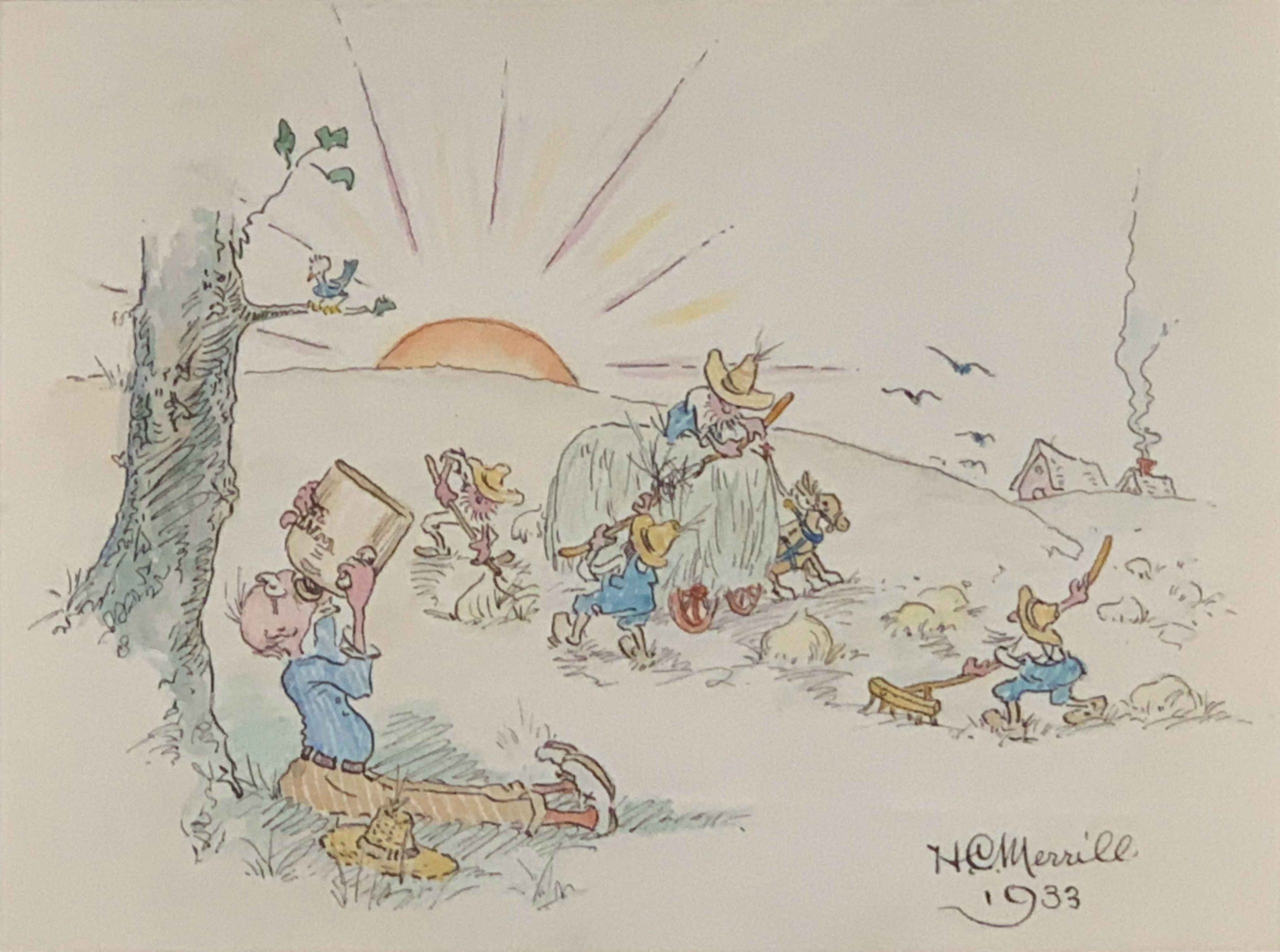 A humorous work by Hiram Campbell Merrill, an artist whose work more often focused on the beauty of nature.  Grandpa is enjoying the late afternoon, quenching his thirst, while his grandchildren do the farm’s work.  Finally made and finely framed by an accomplished pre-War printmaker.