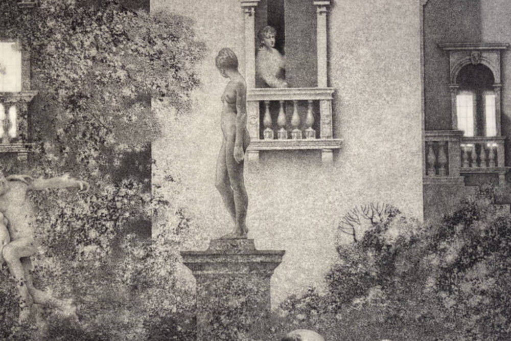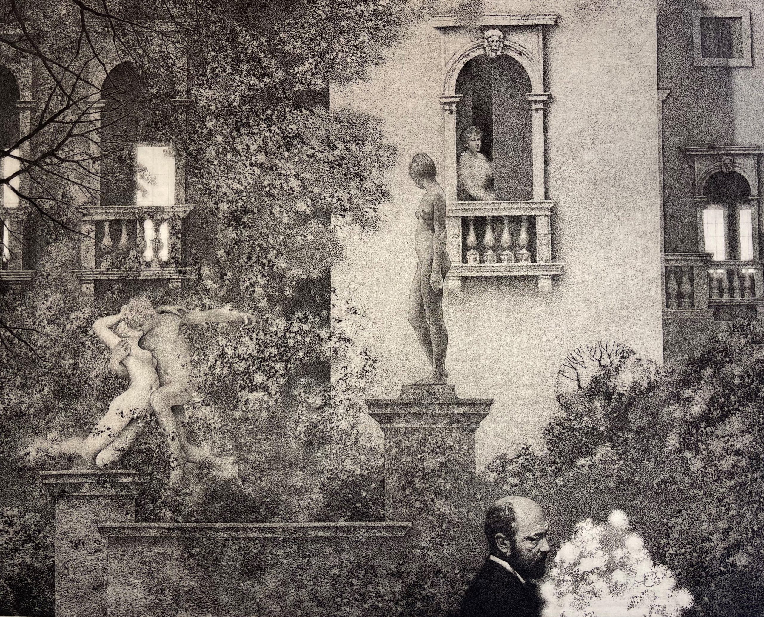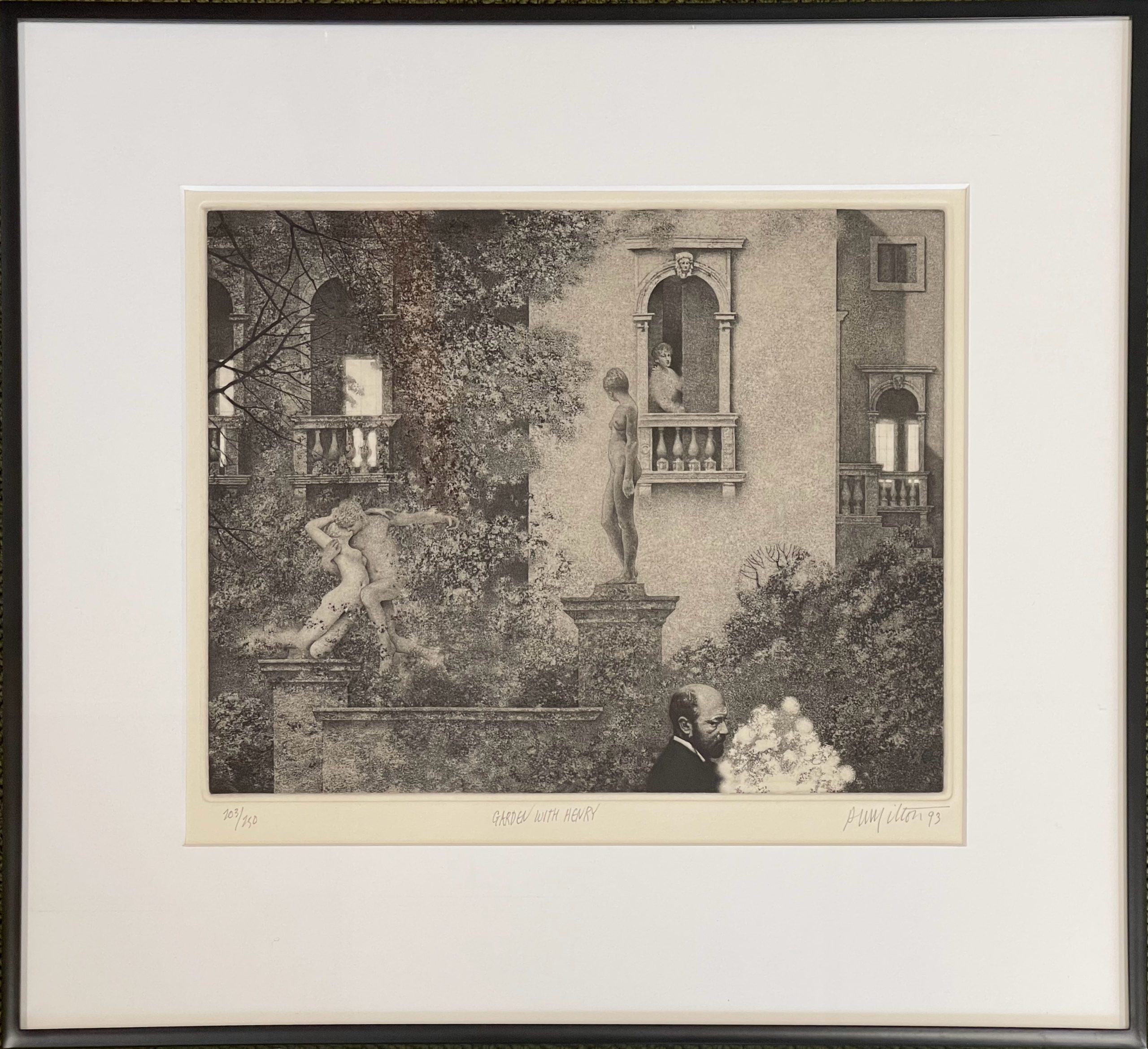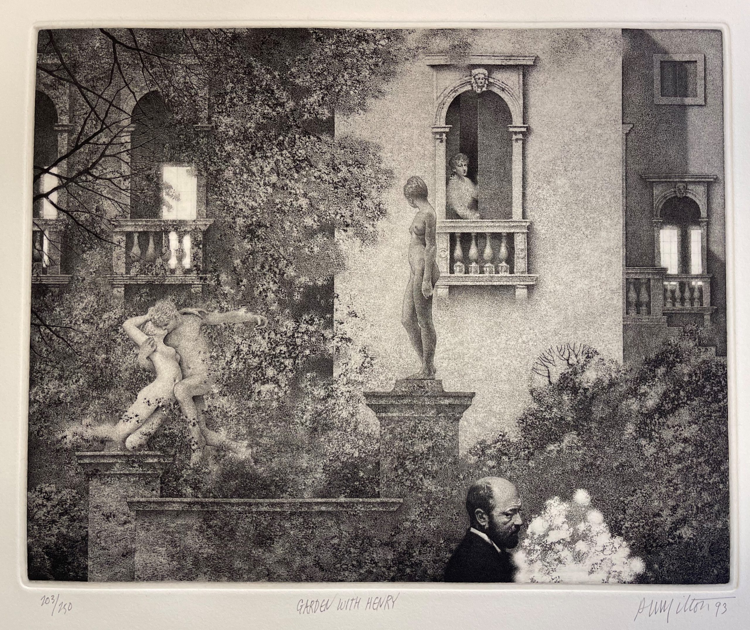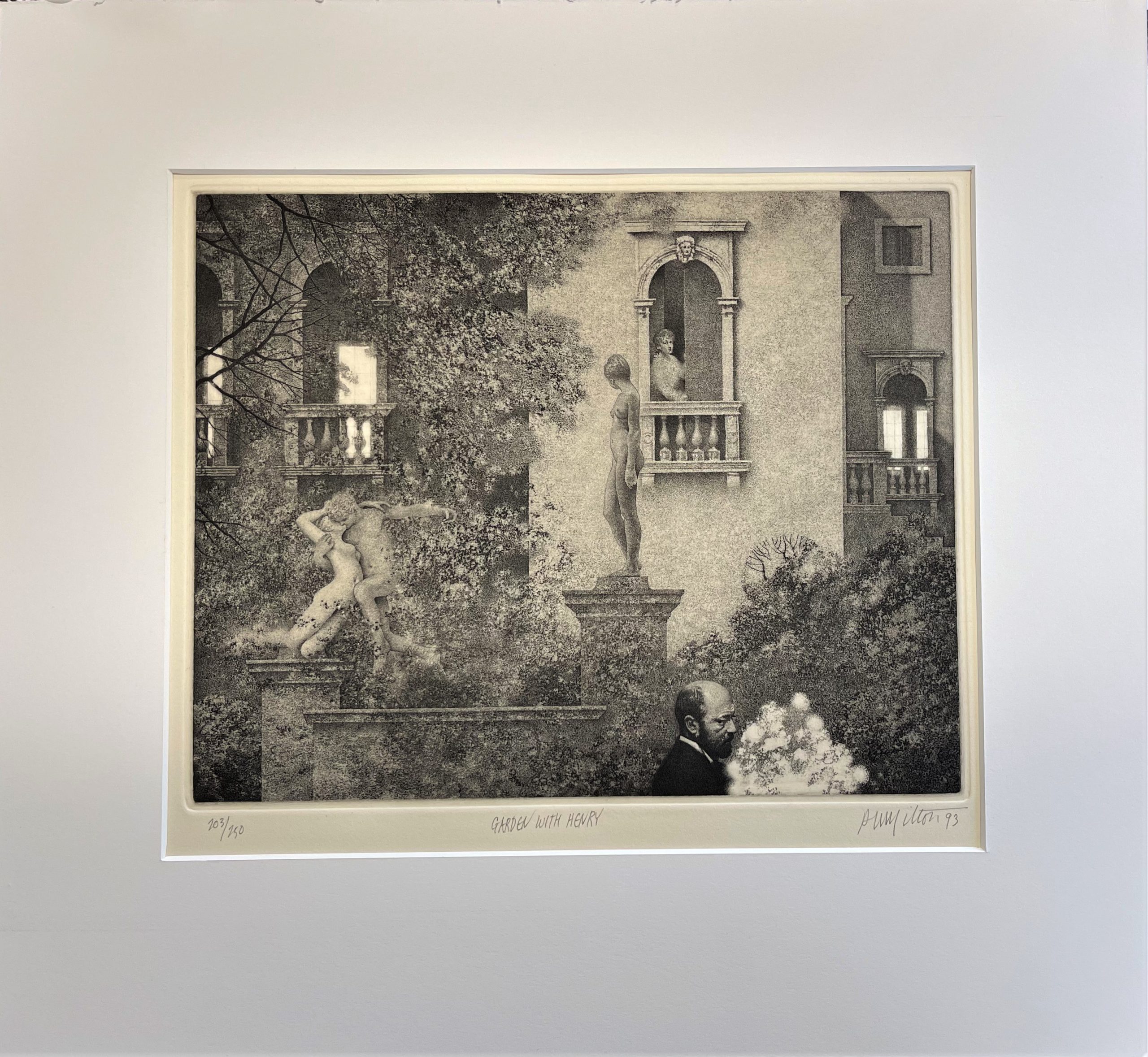 A haunting and melancholic picture of Henry in a garden. This print was specially made by Milton to accompany the Deluxe edition of the portfolio of drawings that Milton made to illustrate Henry James’ The Aspern Papers.