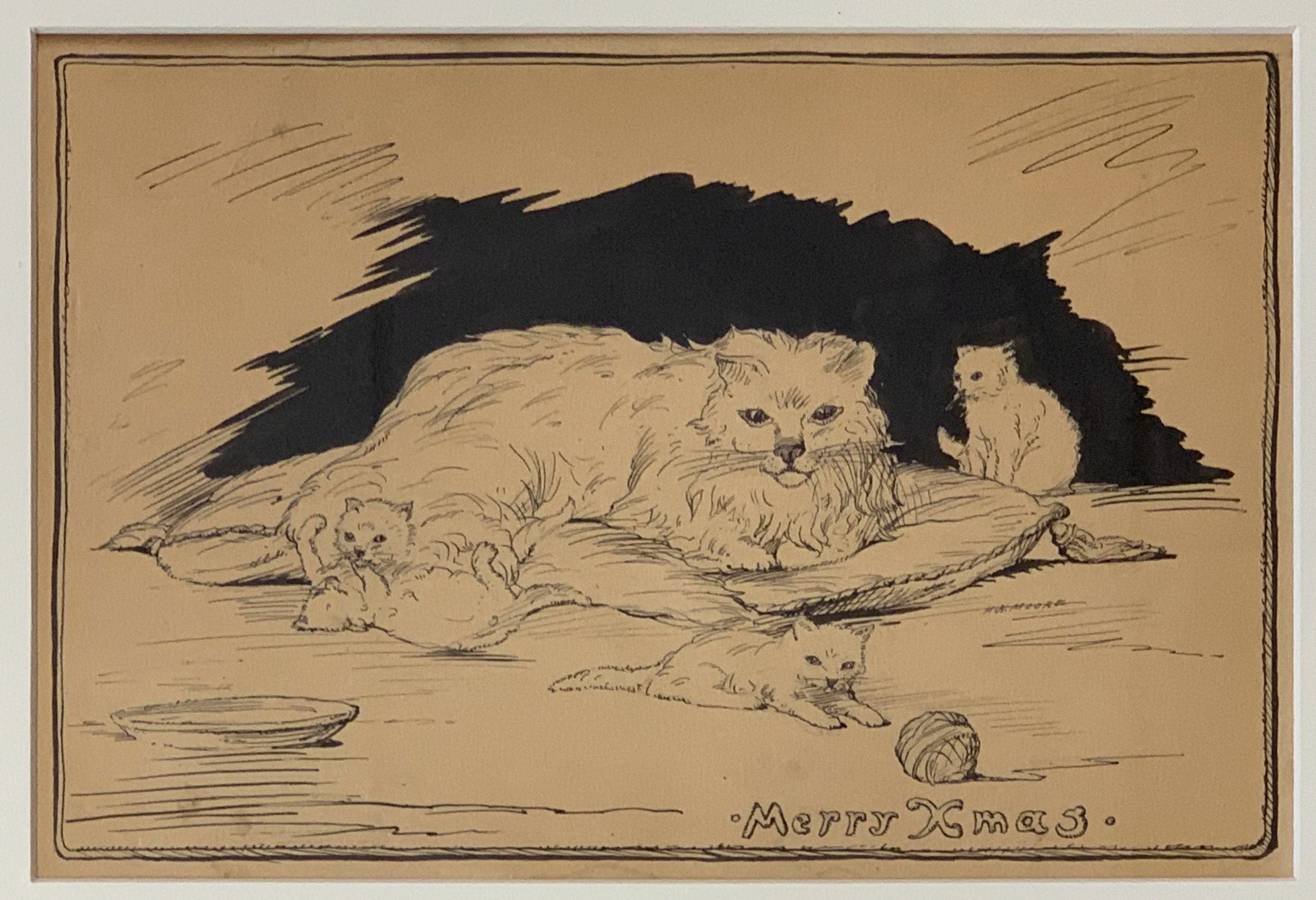 In 1934, when Henry Wadsworth Moore was about 55 years old, he sent someone a Christmas card, hand-drawn with pen and ink, depicting a mother cat on a cushion with four playful kittens. Inscribed on the reverse: “Xmas 1934 – To the dearest little sweetheart with deepest love and devotion, your own Pop”.