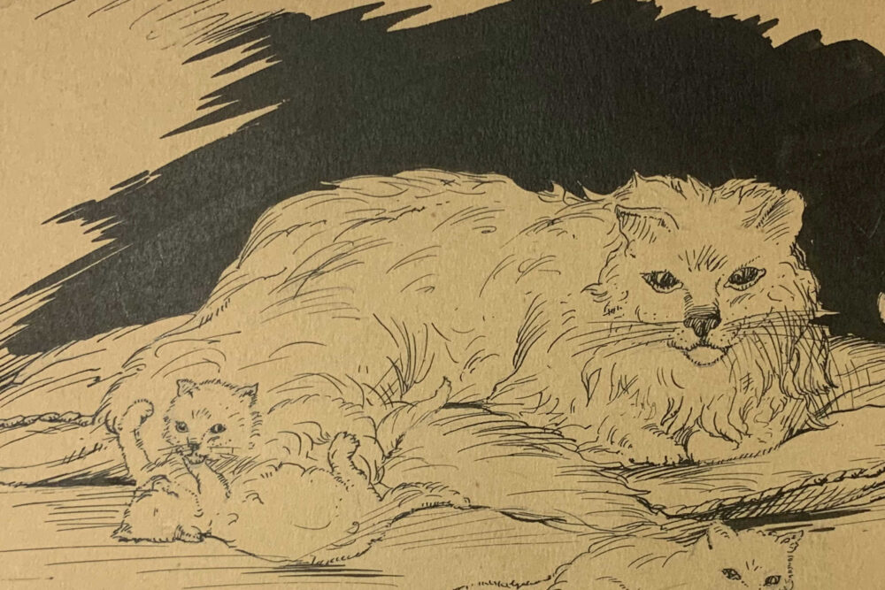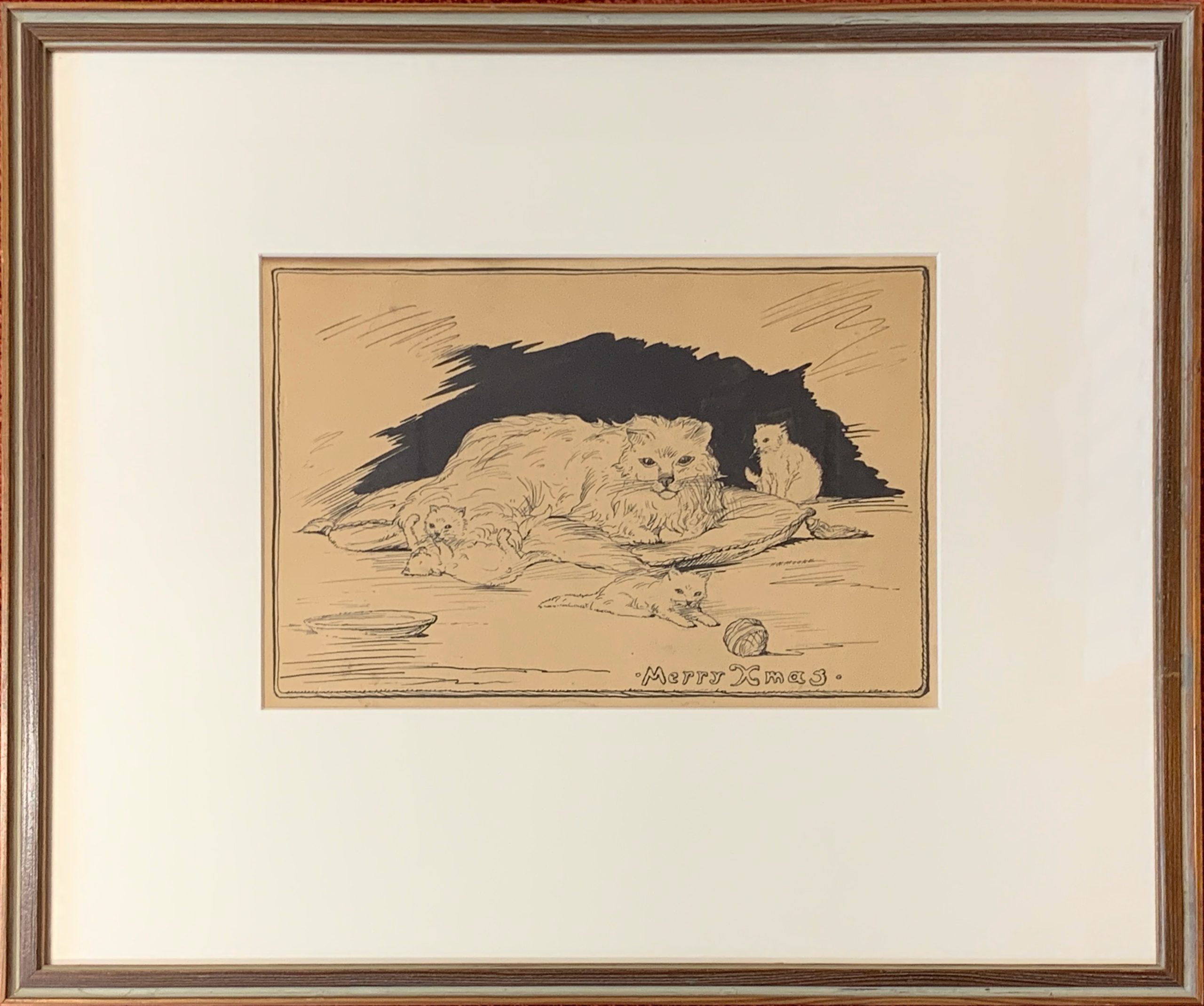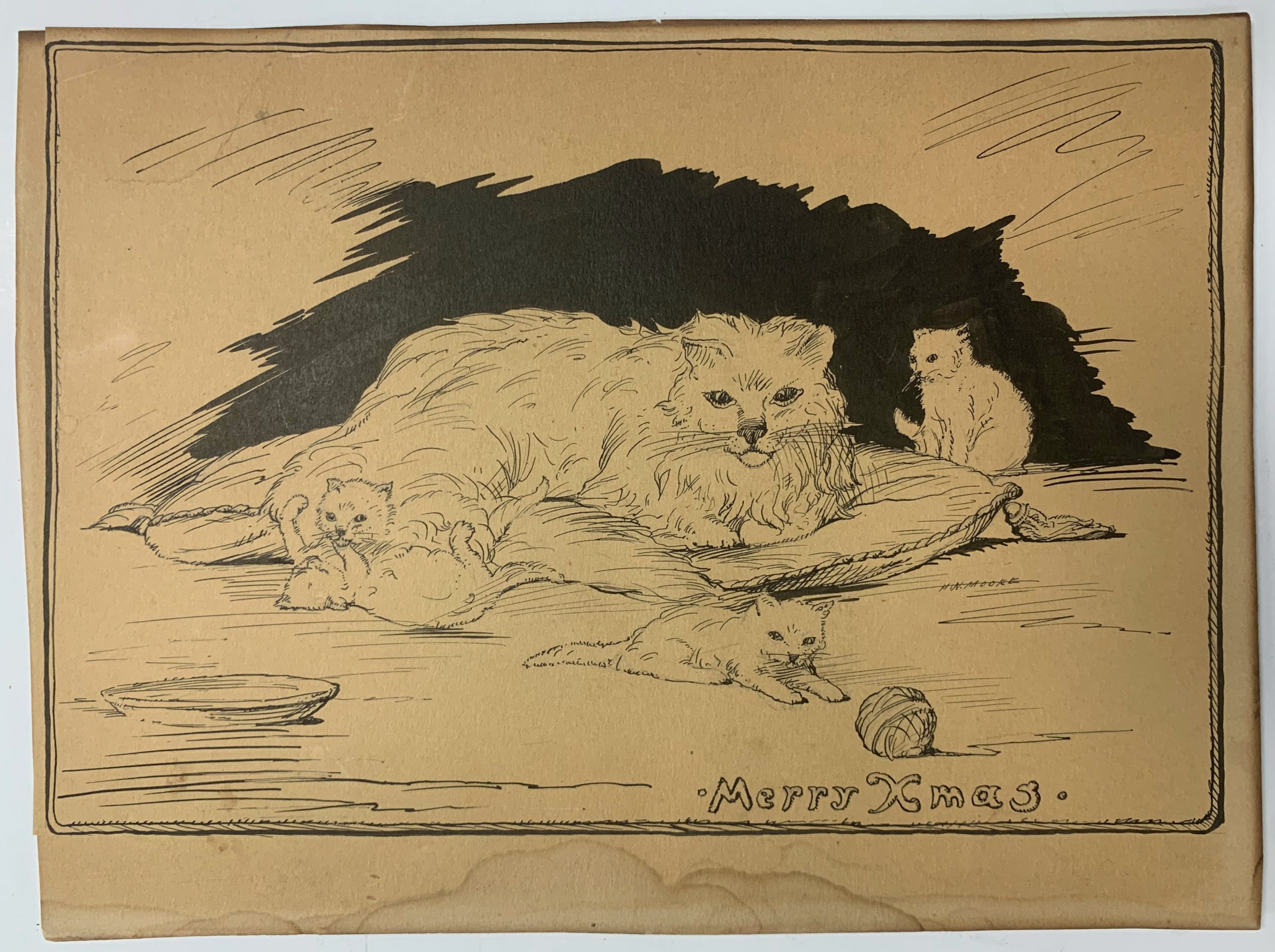 In 1934, when Henry Wadsworth Moore was about 55 years old, he sent someone a Christmas card, hand-drawn with pen and ink, depicting a mother cat on a cushion with four playful kittens. Inscribed on the reverse: “Xmas 1934 – To the dearest little sweetheart with deepest love and devotion, your own Pop”.