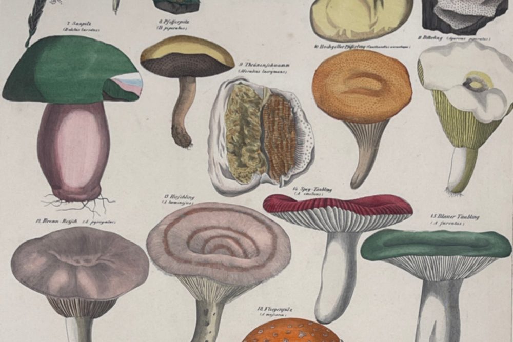 A beautifully printed lithograph showing mushrooms that are safe to eat. Published by Oken’s Natural History.