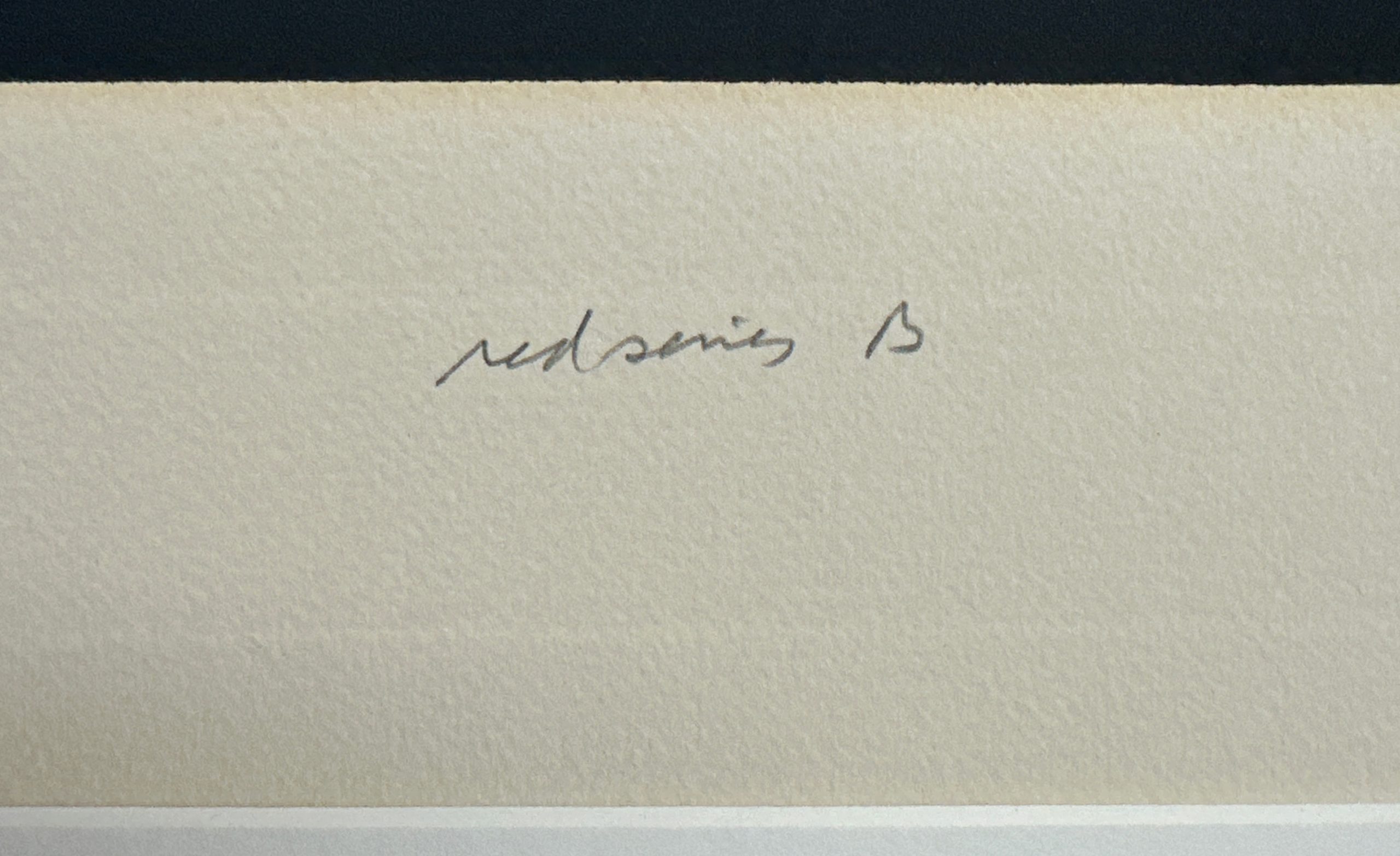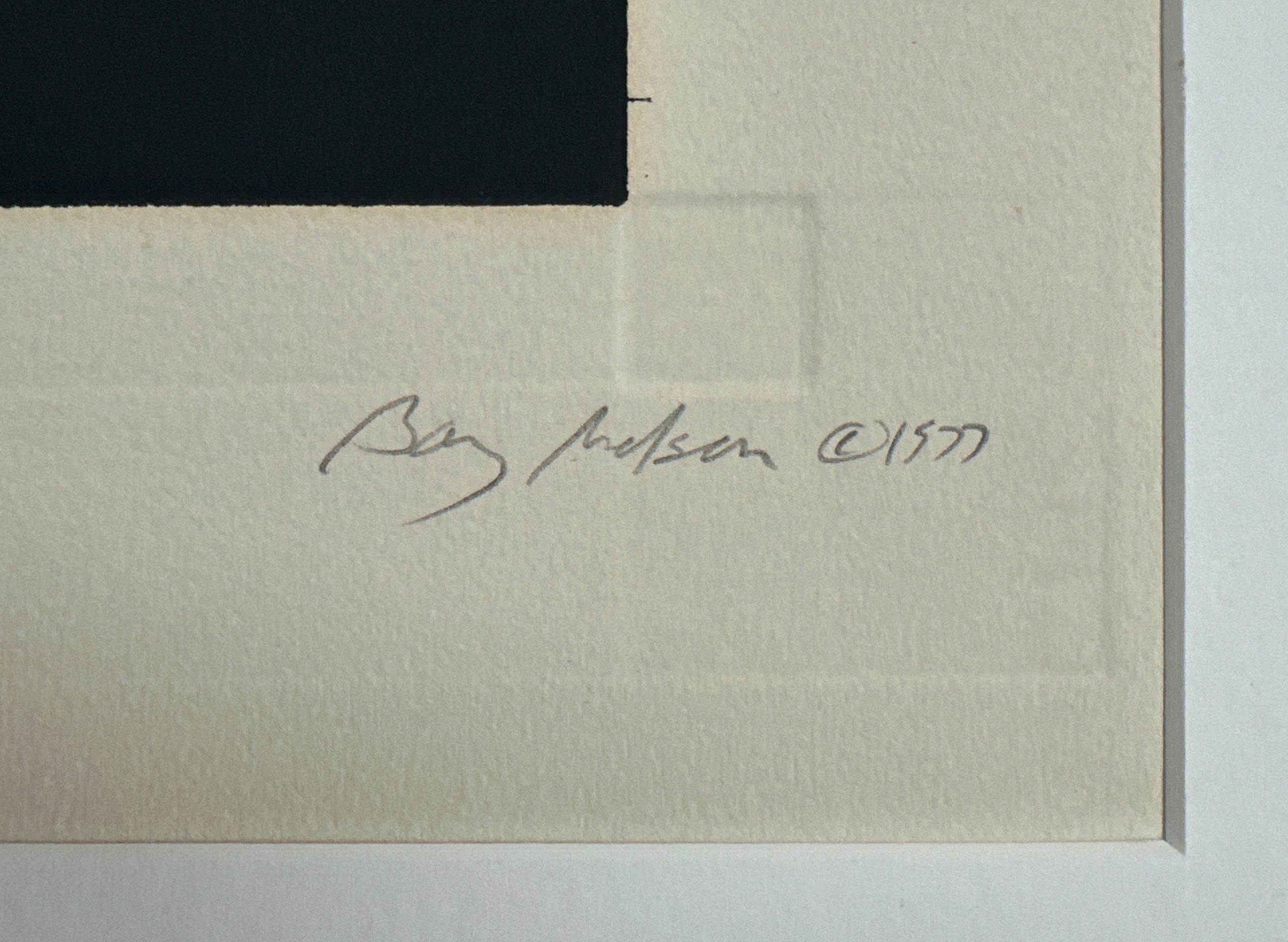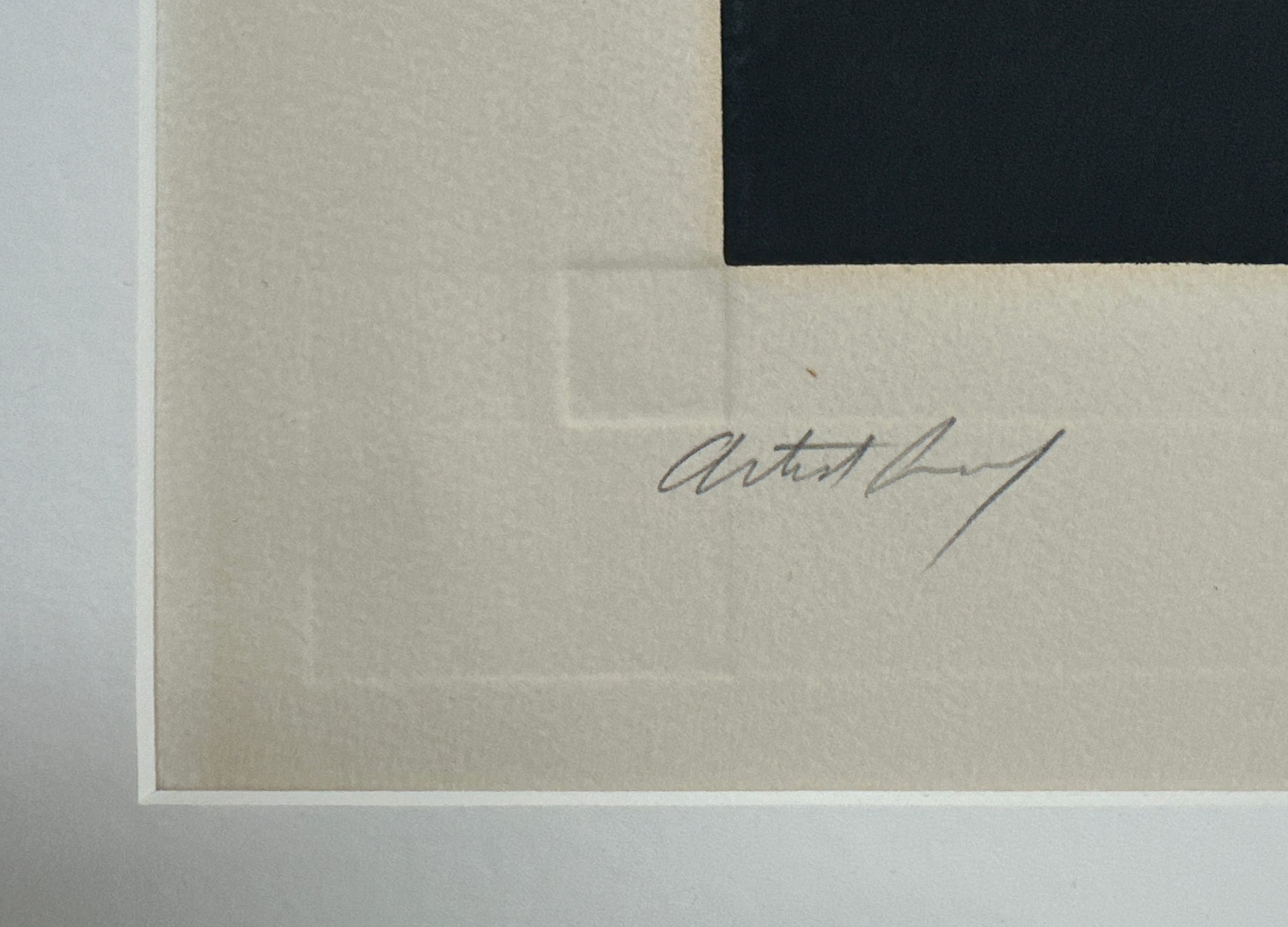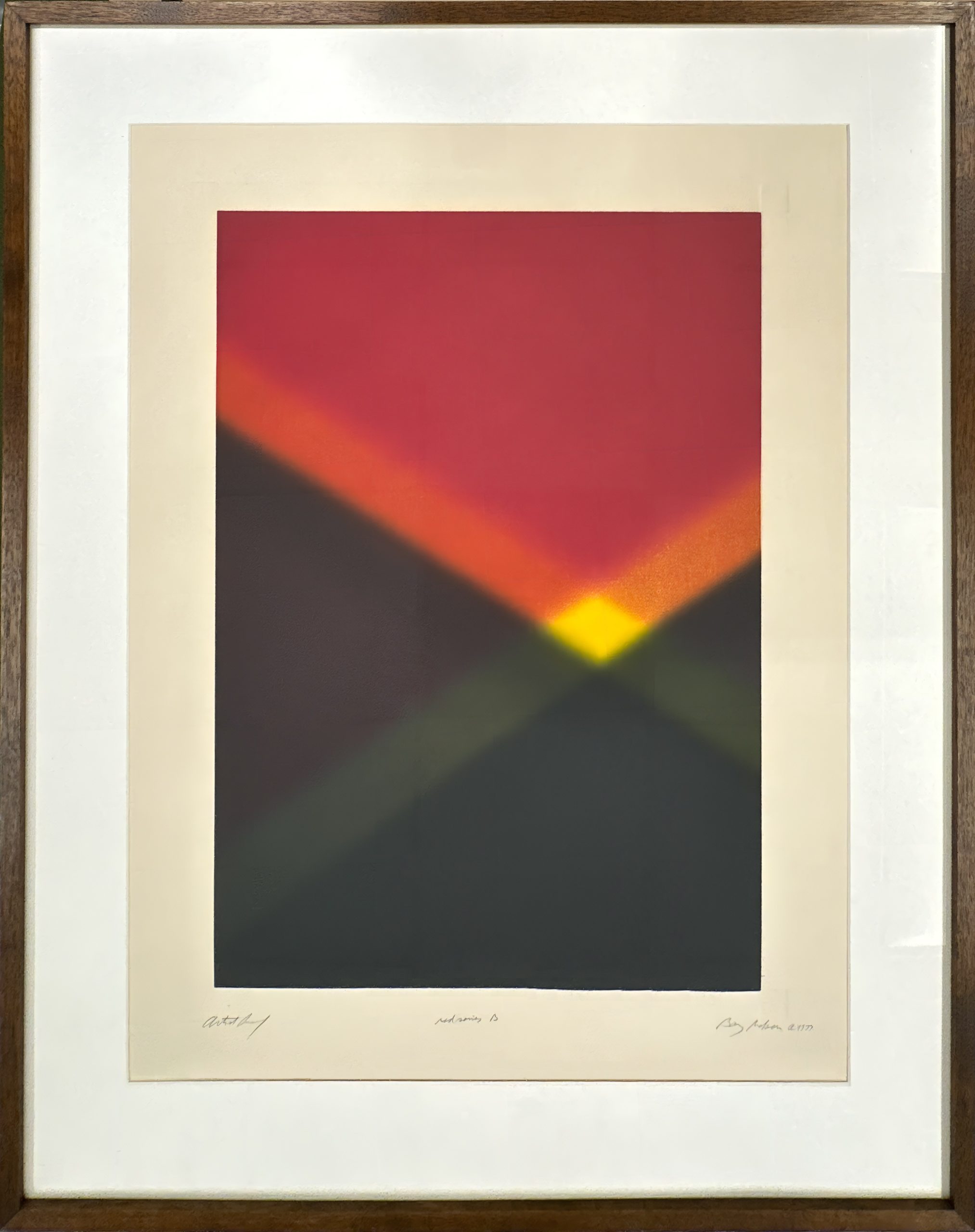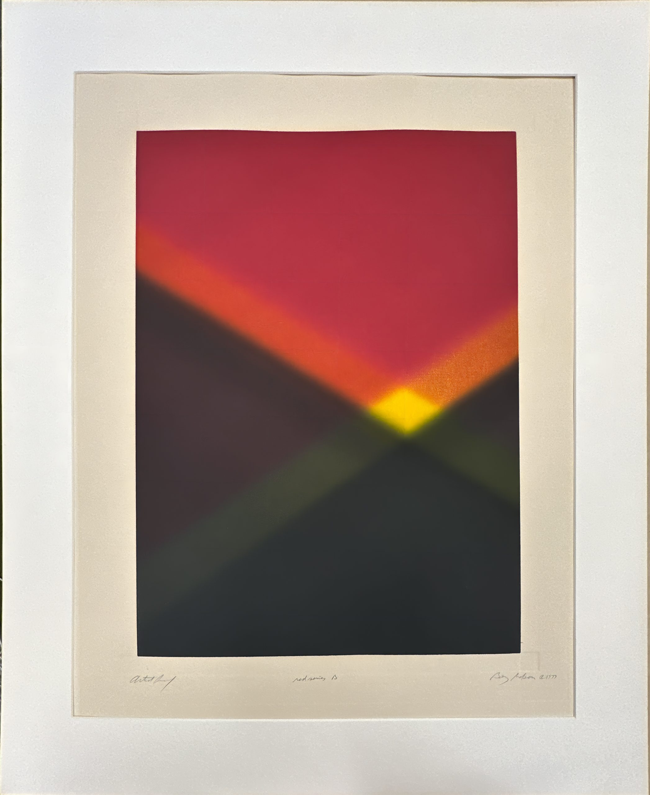 A prismatic aquatint etching with velvety gradience and intersecting beams of light, characteristic of Nelson’s study of the interaction of light and color. An Artist’s Proof preceding the edition of 50. Custom framed in a solid walnut frame using strictly conservation grade materials behind 99% UV-blocking art glass.