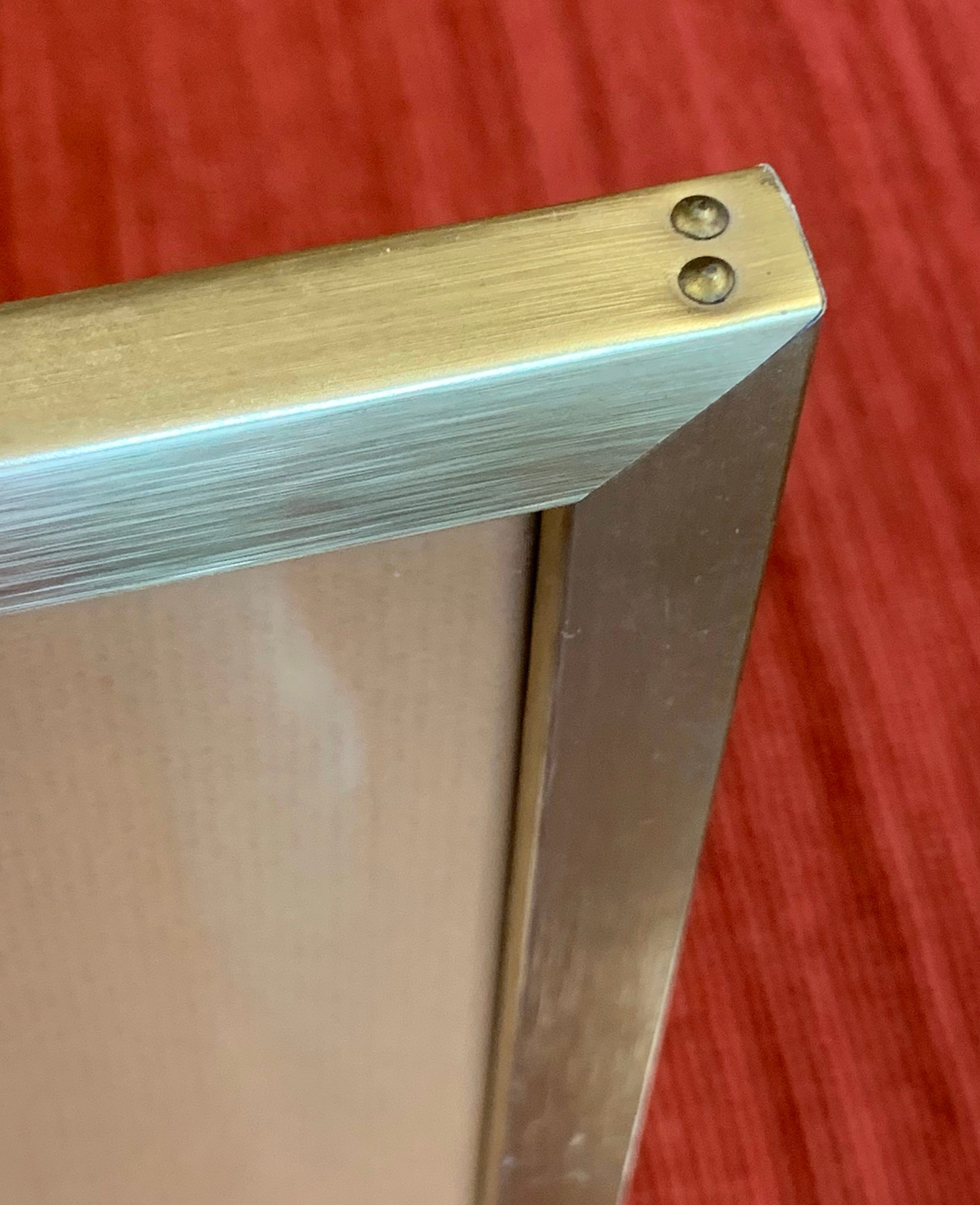 Framed and matted in a matte-gold metal frame, pinned on the corners. Apparently conservation materials.