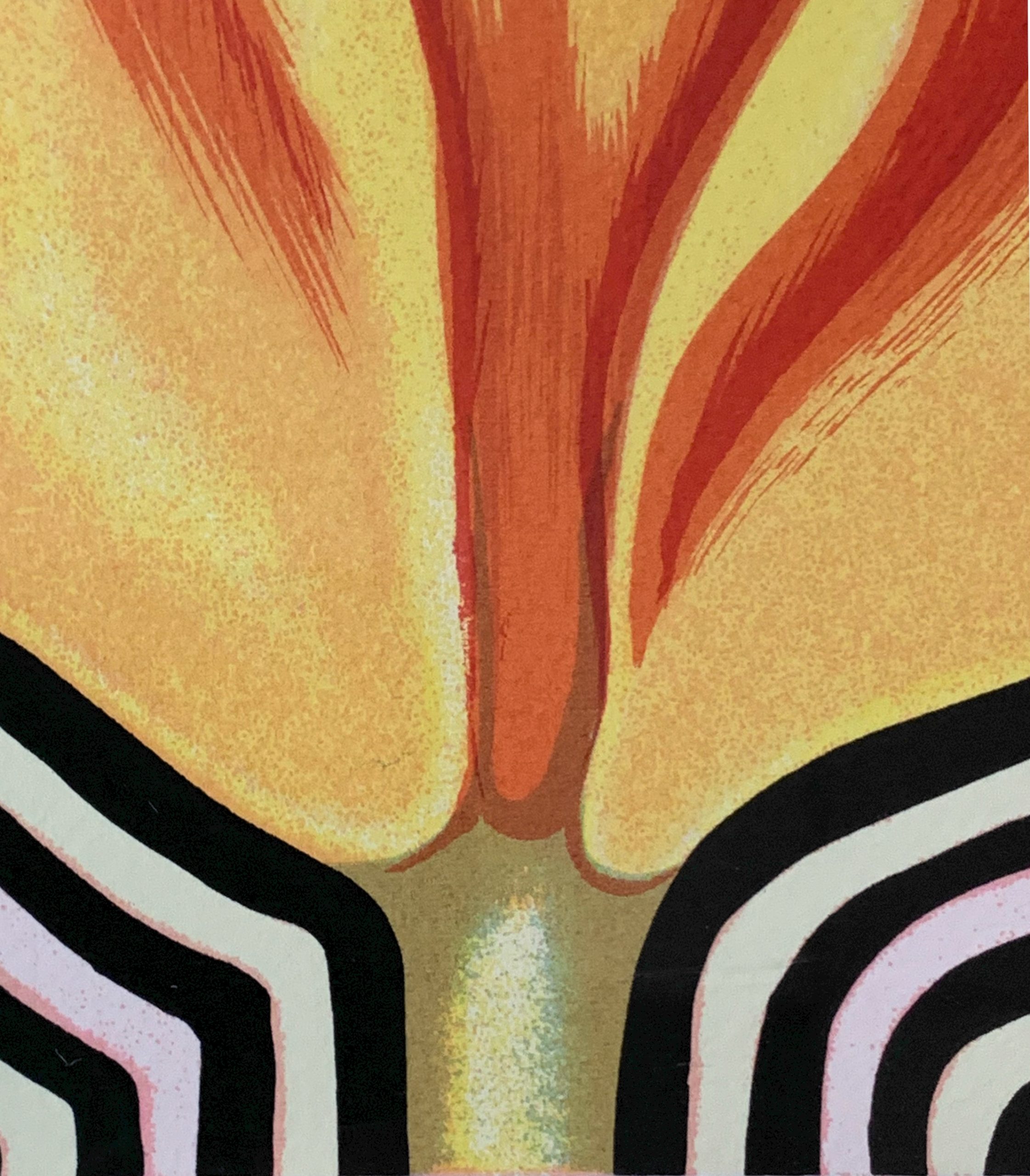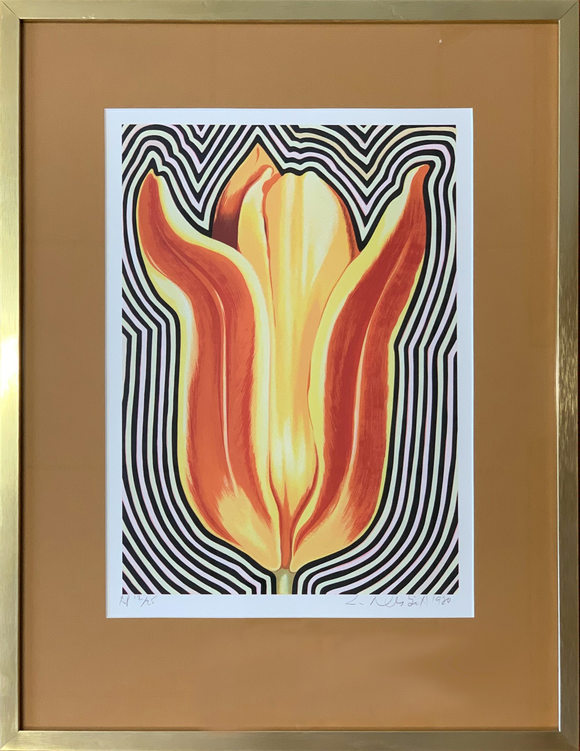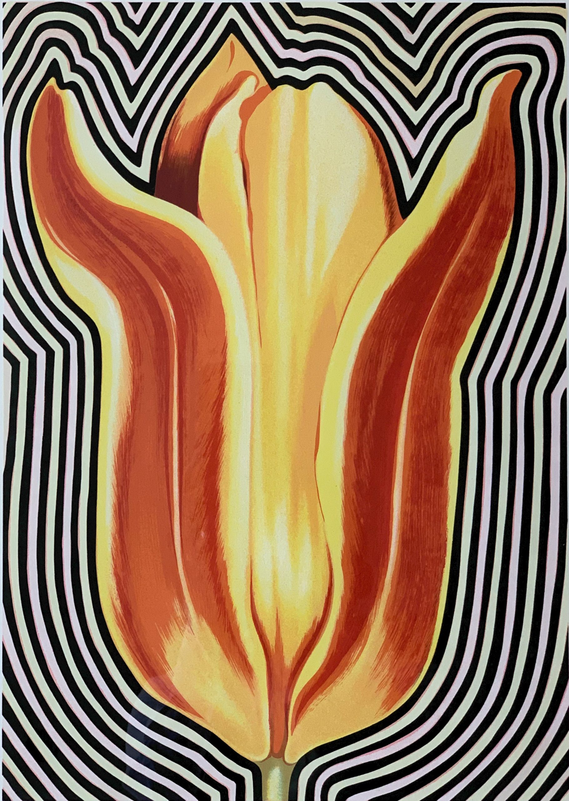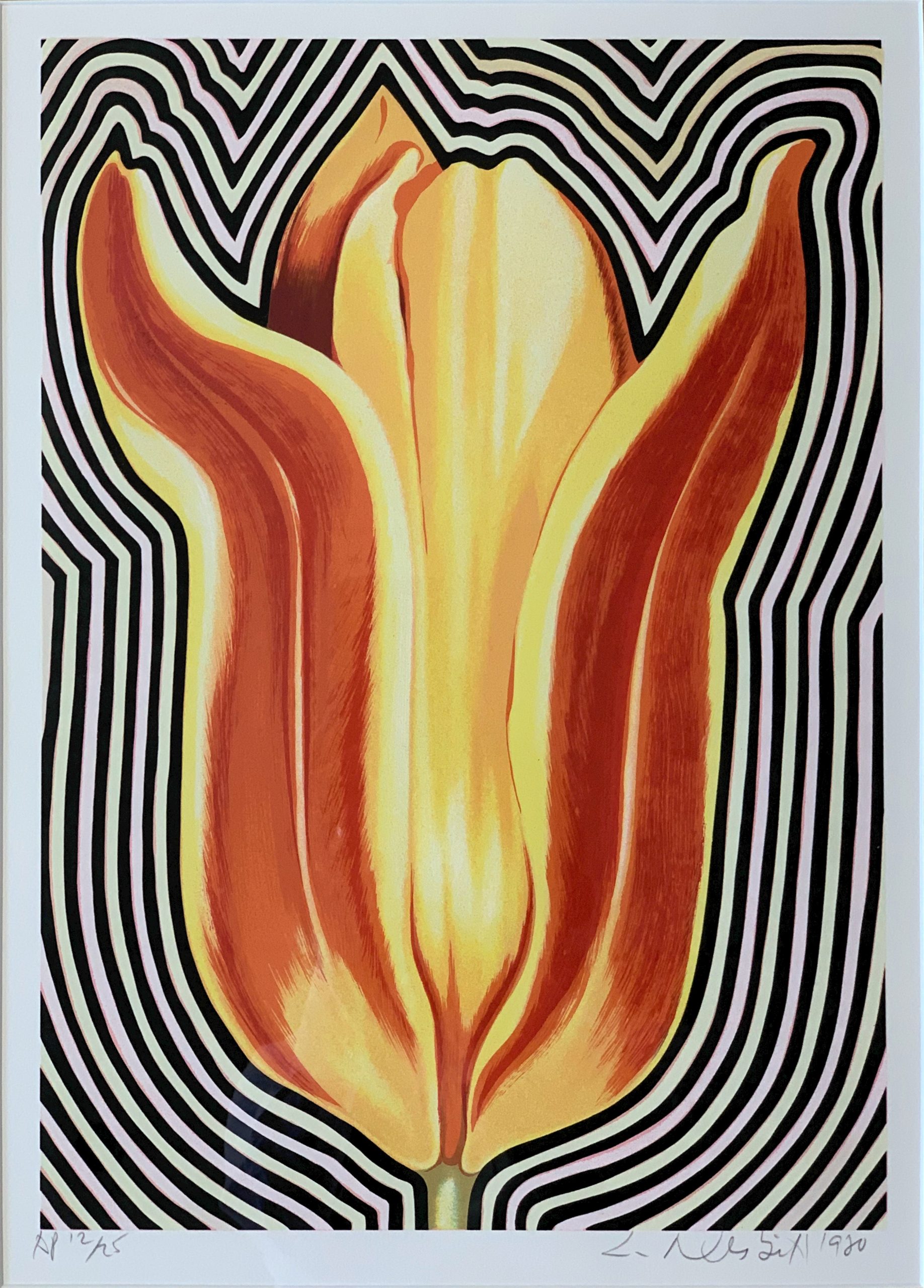 The Iris, the Tulip, and the Lily are the three flower images with which I work from all directions. Specifically, the so-called “Electric Flower Series” began in 1973, first in drypoint prints, then in my paintings and drawings. I have always been interested in the geometric structure of the flower and in this case, its ability to throw out musical or electric reverberations.
