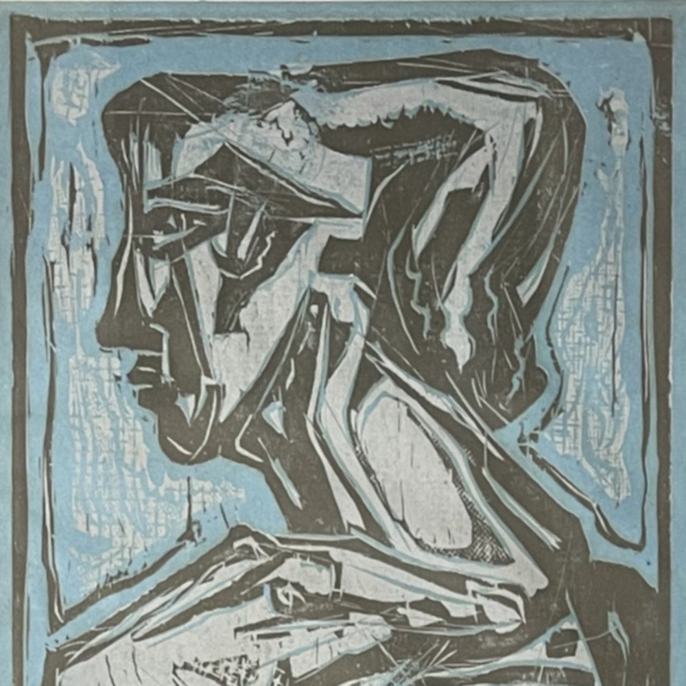 Woodcut in brown and white ink on blue wove paper