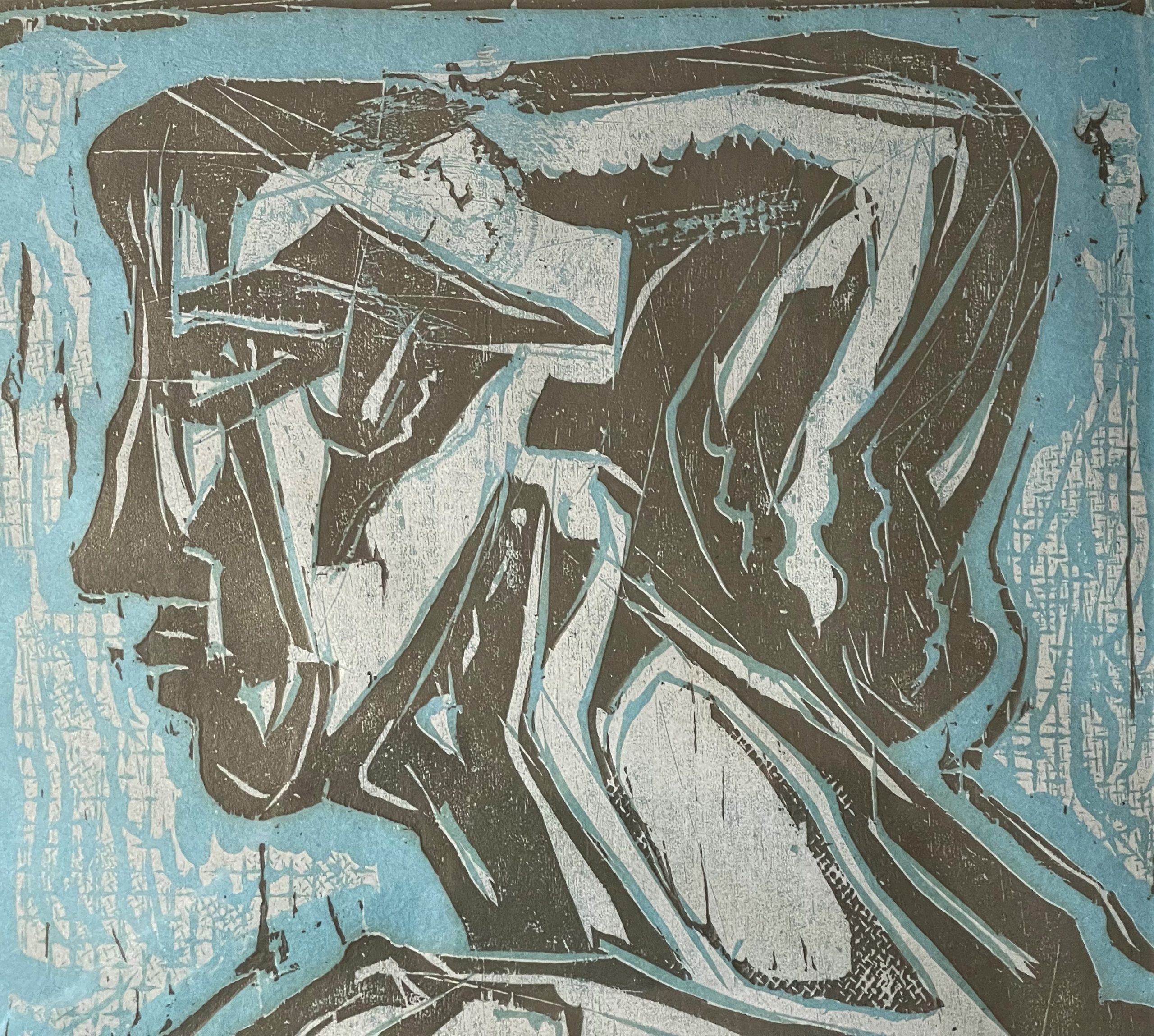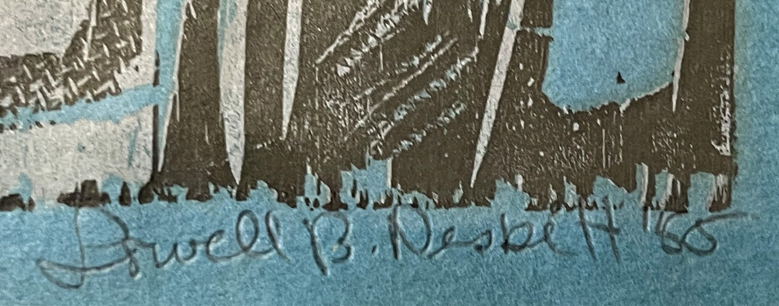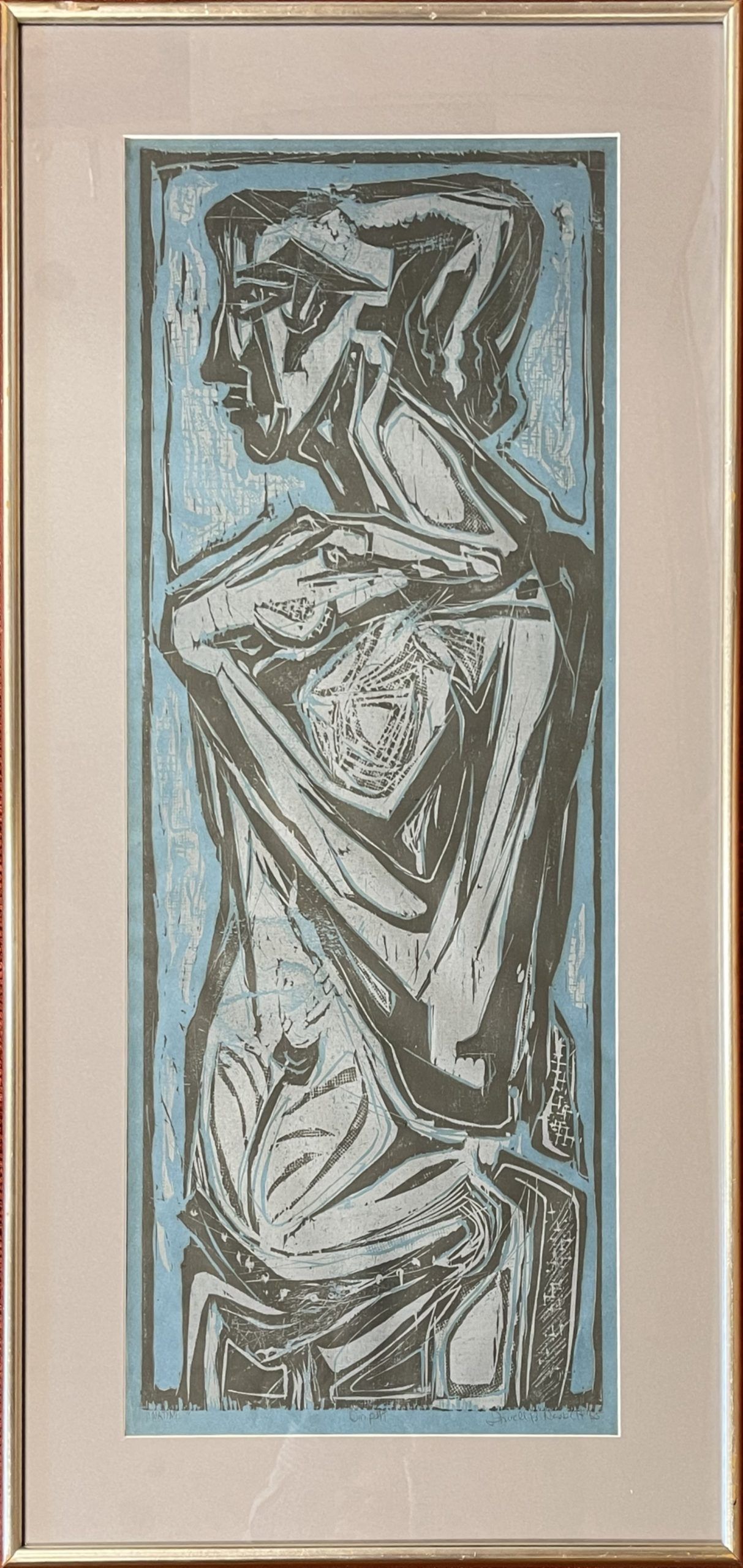 This is an uncommon early work by Lowell Nesbitt, who would later become famous for his large-scale pictures of flowers. A remarkably interesting lightly-abstracted image of a person. This impression was pulled by Nesbitt himself (as signified by the “Imp” written next to the editioning). This picture was matted and reframed in its original frame behind 99% UV-filtering art glass using strictly conservation-grade materials.