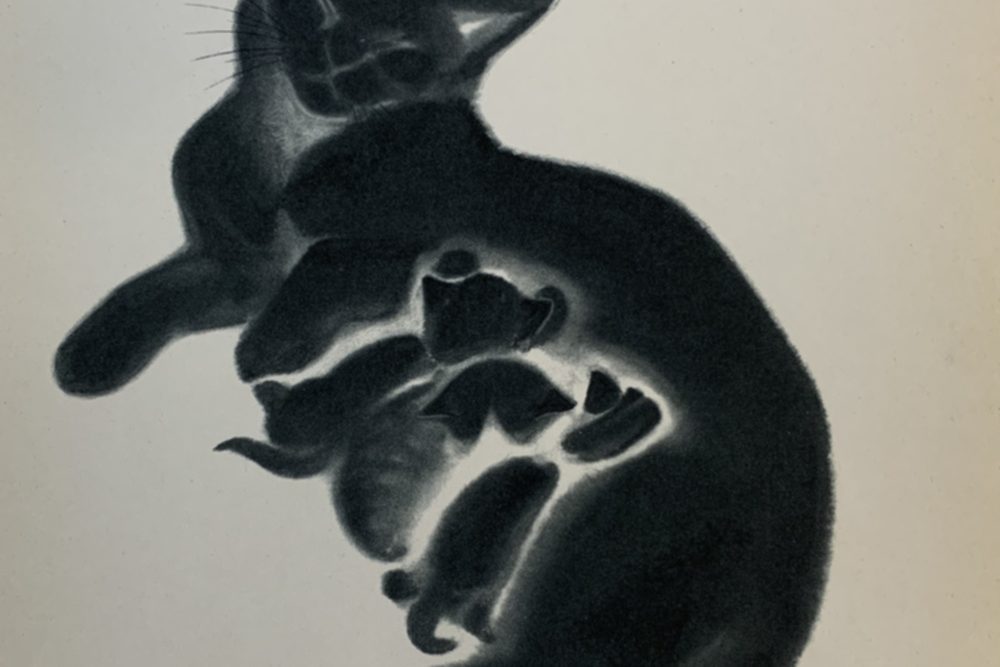 Clare Turlay Newberry wrote and illustrated seventeen children’s books—all but three of which were about cats, and nearly all taken from real life. Four of her books were honored with the Caldecott award. This print is a fine reproduction of Newberry’s watercolor painting with crayon of 1940, used to illustrate her Caldecott-winning book, April’s Kittens, published in 1943 by Harper & Brothers. It is a formal portrait of a not-formal animal (or maybe a not-formal portrait of a formal animal?); it is adorable and beautifully executed at the same time.
