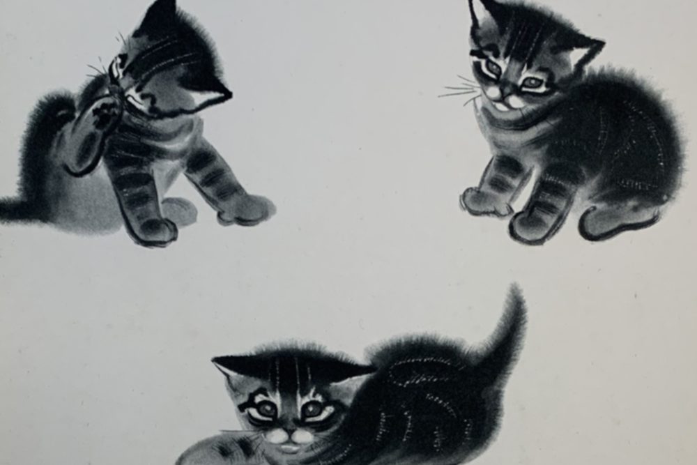 Clare Turlay Newberry wrote and illustrated seventeen children’s books—all but three of which were about cats, and nearly all taken from real life. Four of her books were honored with the Caldecott award. This print is a fine reproduction of Newberry’s watercolor painting with pen-and-ink of 1936, used to illustrate the end-papers of her , Caldecott-winning book, April’s Kittens, published in 1943 by Harper & Brothers. It is a formal portrait of a not-formal animal (or maybe a not-formal portrait of a formal animal?); it is adorable and beautifully executed at the same time.