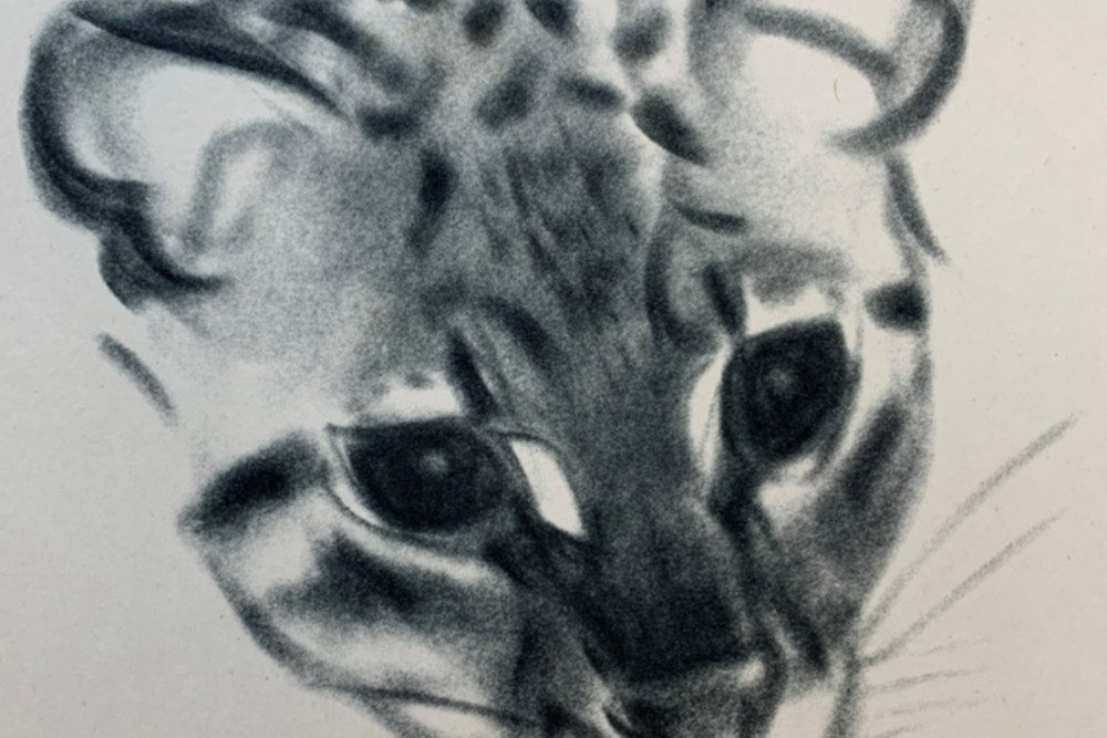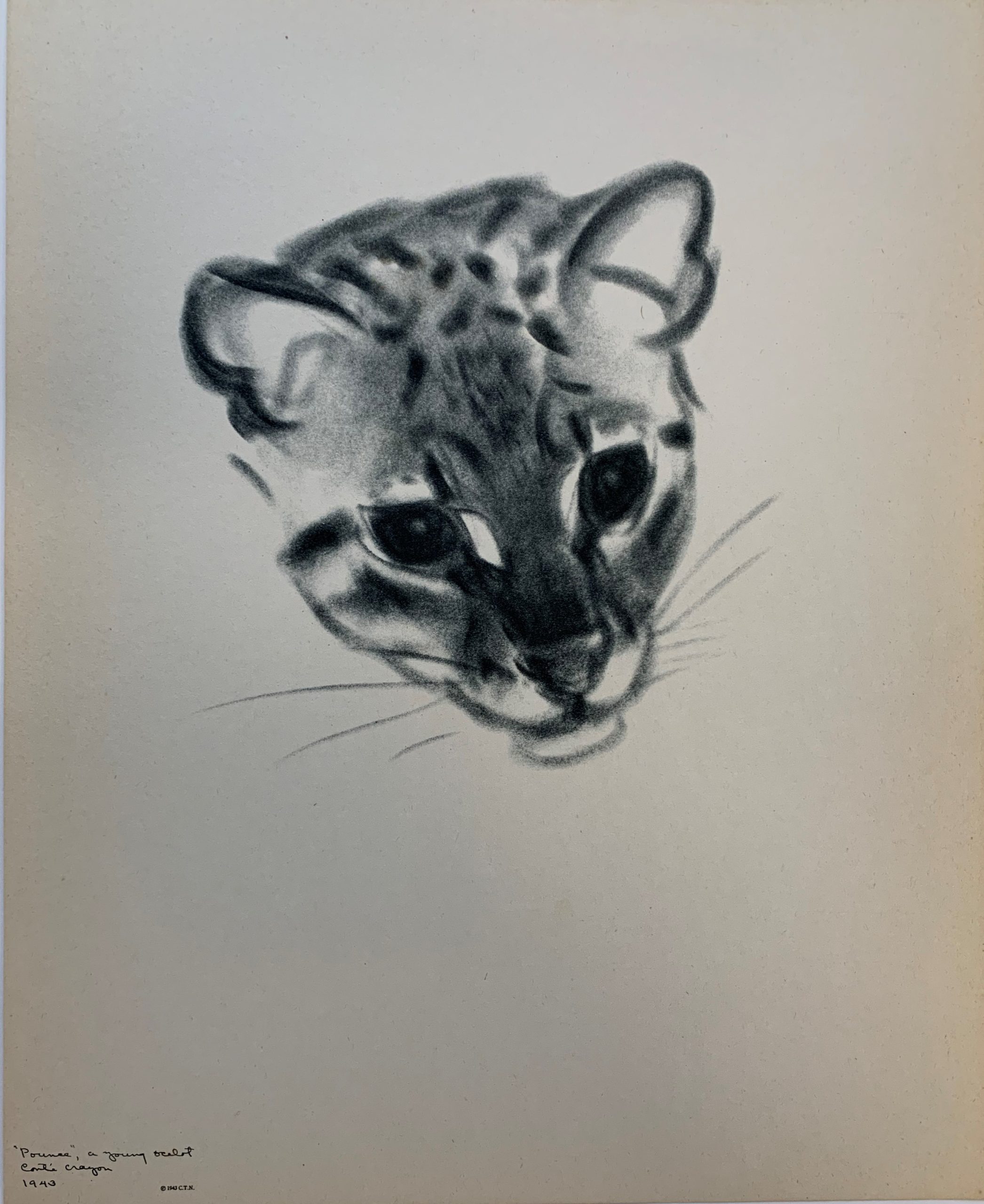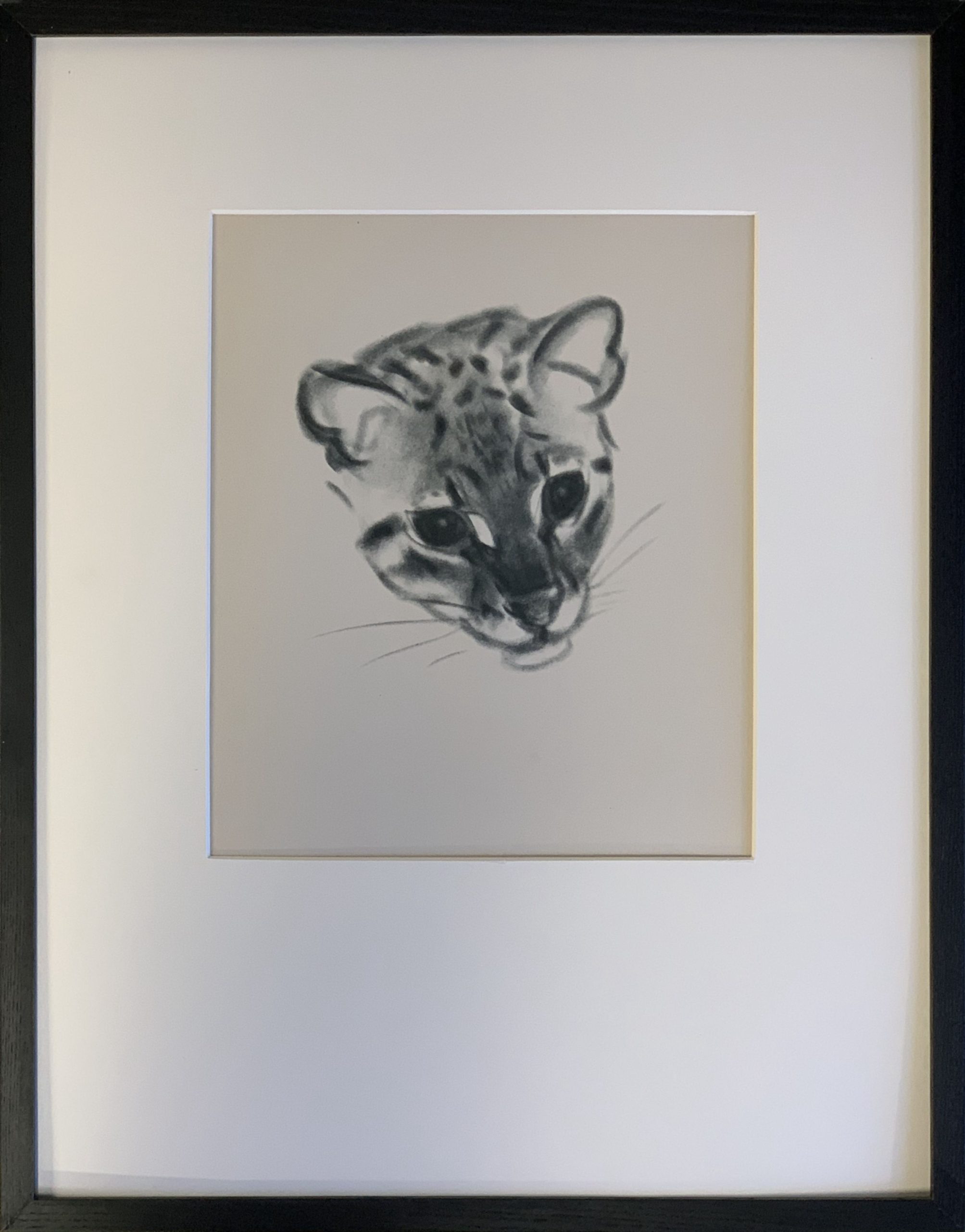 Clare Turlay Newberry wrote and illustrated seventeen children’s books—all but three of which were about cats, and nearly all taken from real life. Four of her books were honored with the Caldecott award. This print, published in 1943 by Harper & Brothers, is a fine reproduction of Newberry’s watercolor and crayon drawing of the same year illustrating her Caldecott-winning book, April’s Kittens. It is a formal portrait of a not-formal animal (or maybe a not-formal portrait of a formal animal?); it is adorable and beautifully executed at the same time.