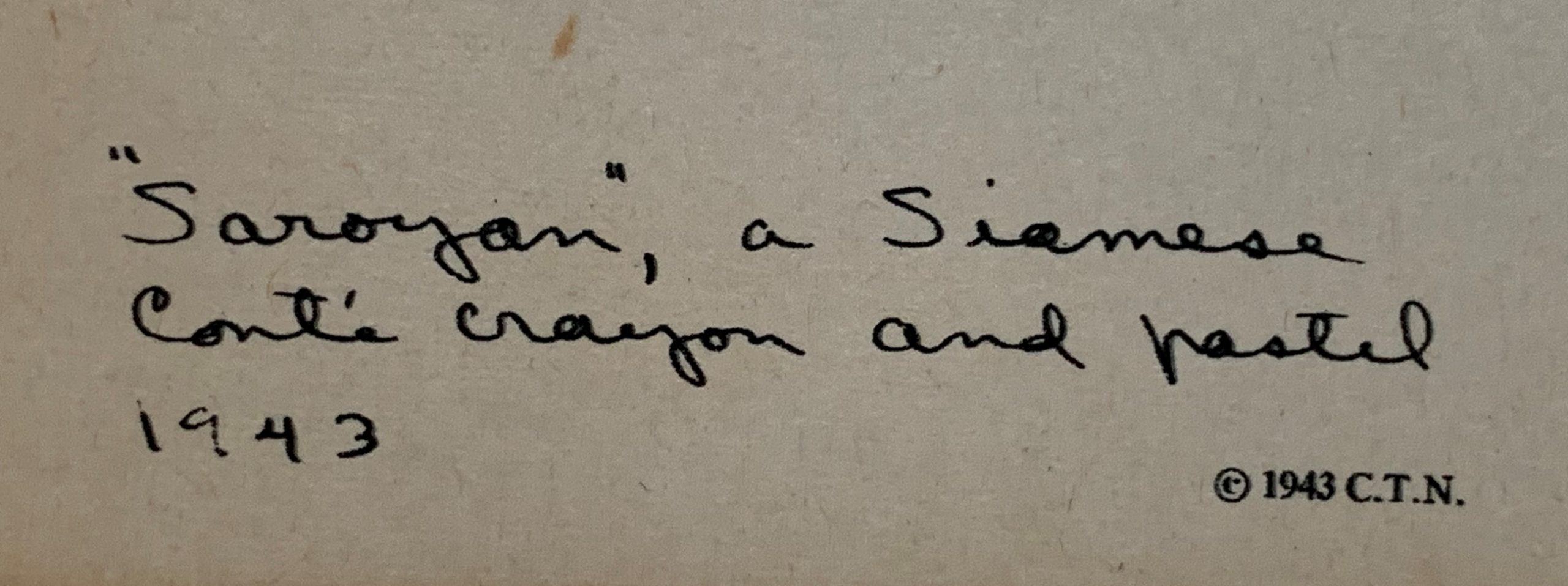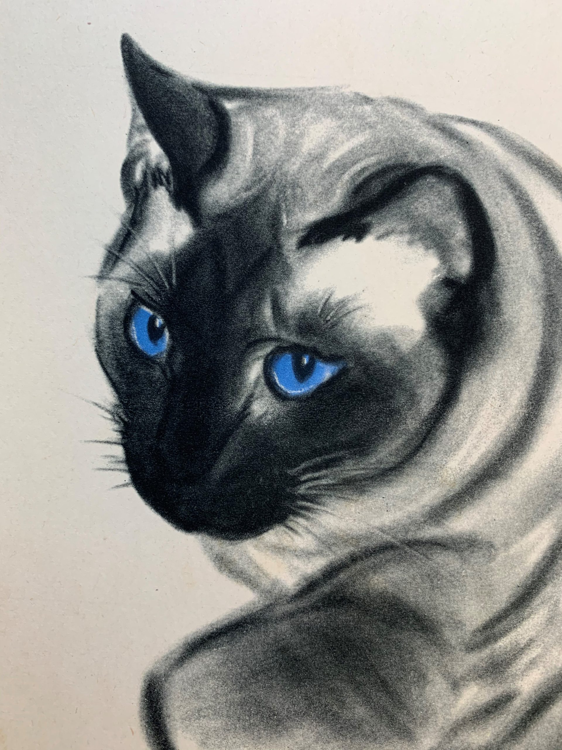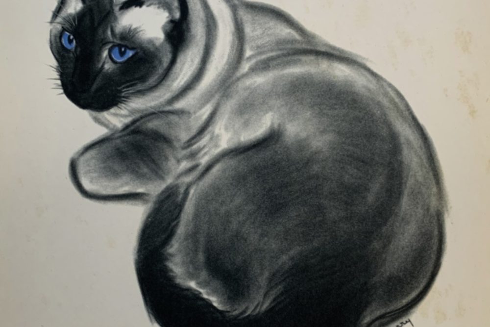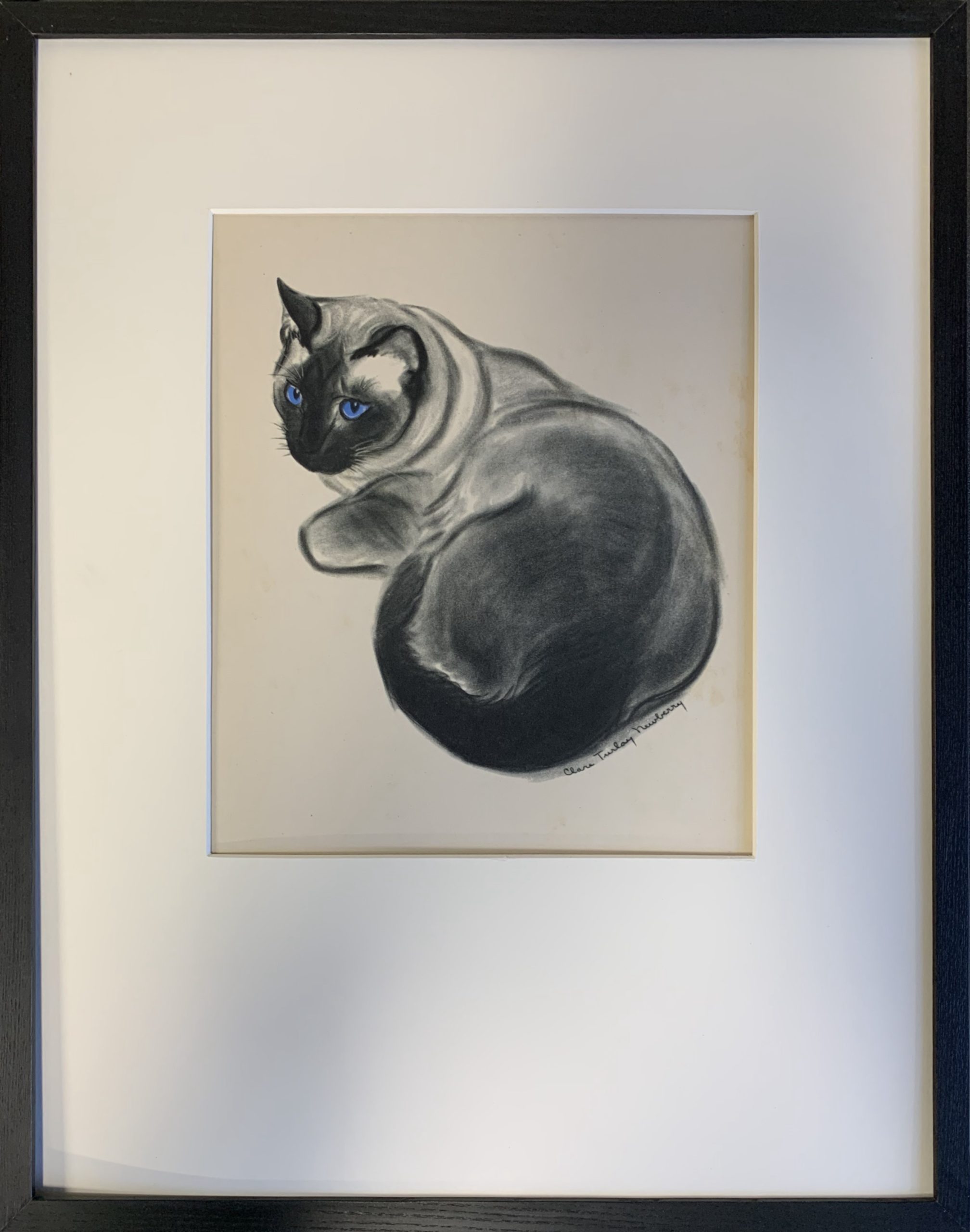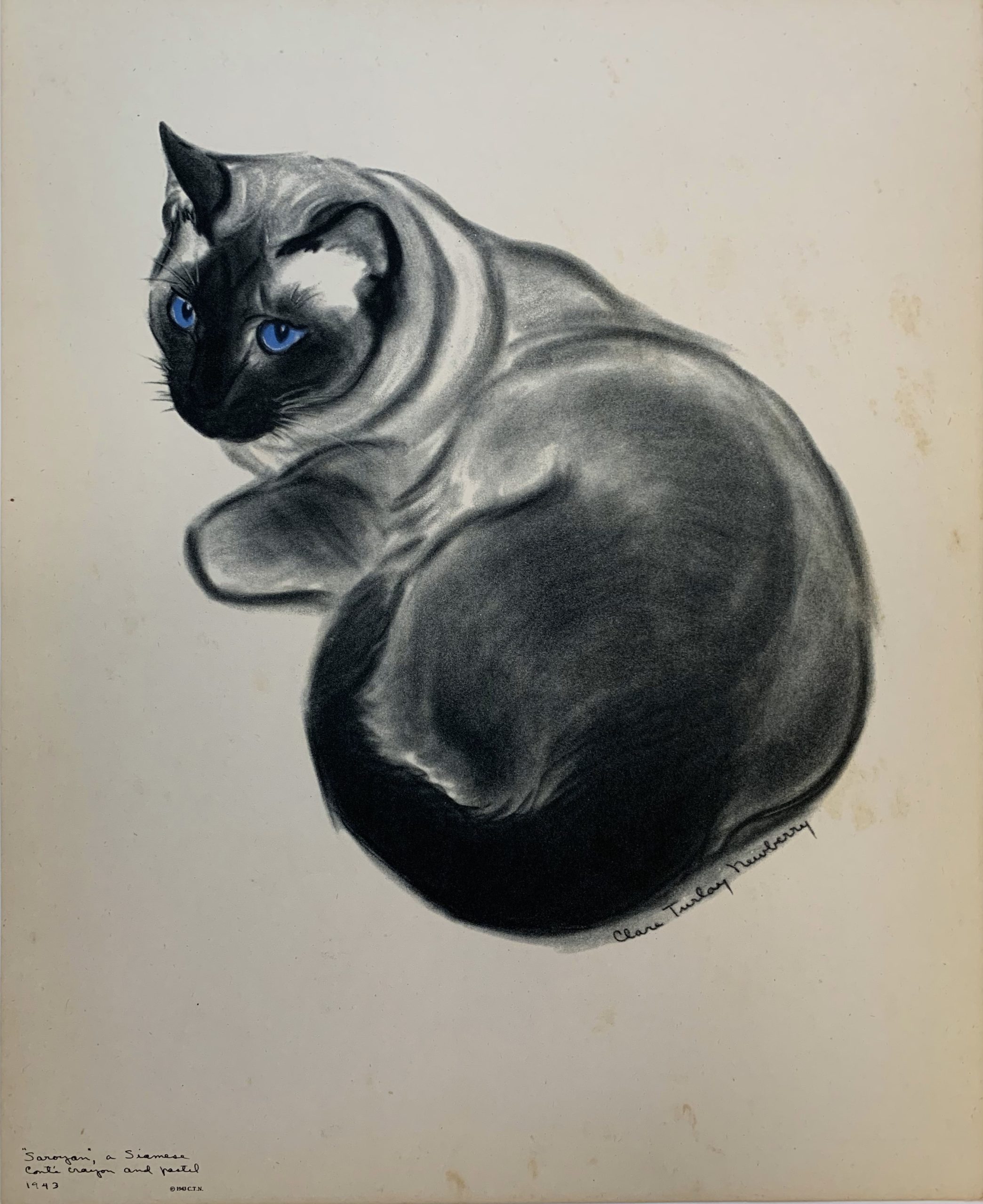 Clare Turlay Newberry wrote and illustrated seventeen children’s books—all but three of which were about cats, and nearly all taken from real life. Four of her books were honored with the Caldecott award. This print, published in 1943 by Harper & Brothers, is a fine reproduction of Newberry’s watercolor and crayon drawing of the same year illustrating her Caldecott-winning book, April’s Kittens. It is a formal portrait of a not-formal animal (or maybe a not-formal portrait of a formal animal?); it is adorable and beautifully executed at the same time.