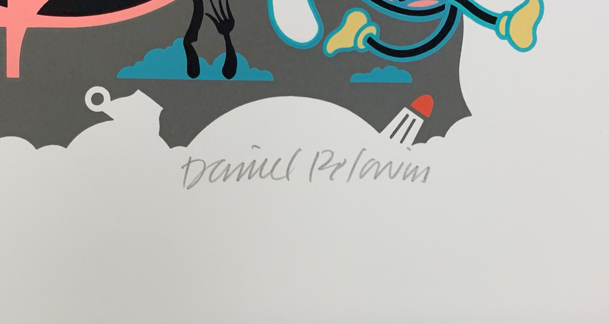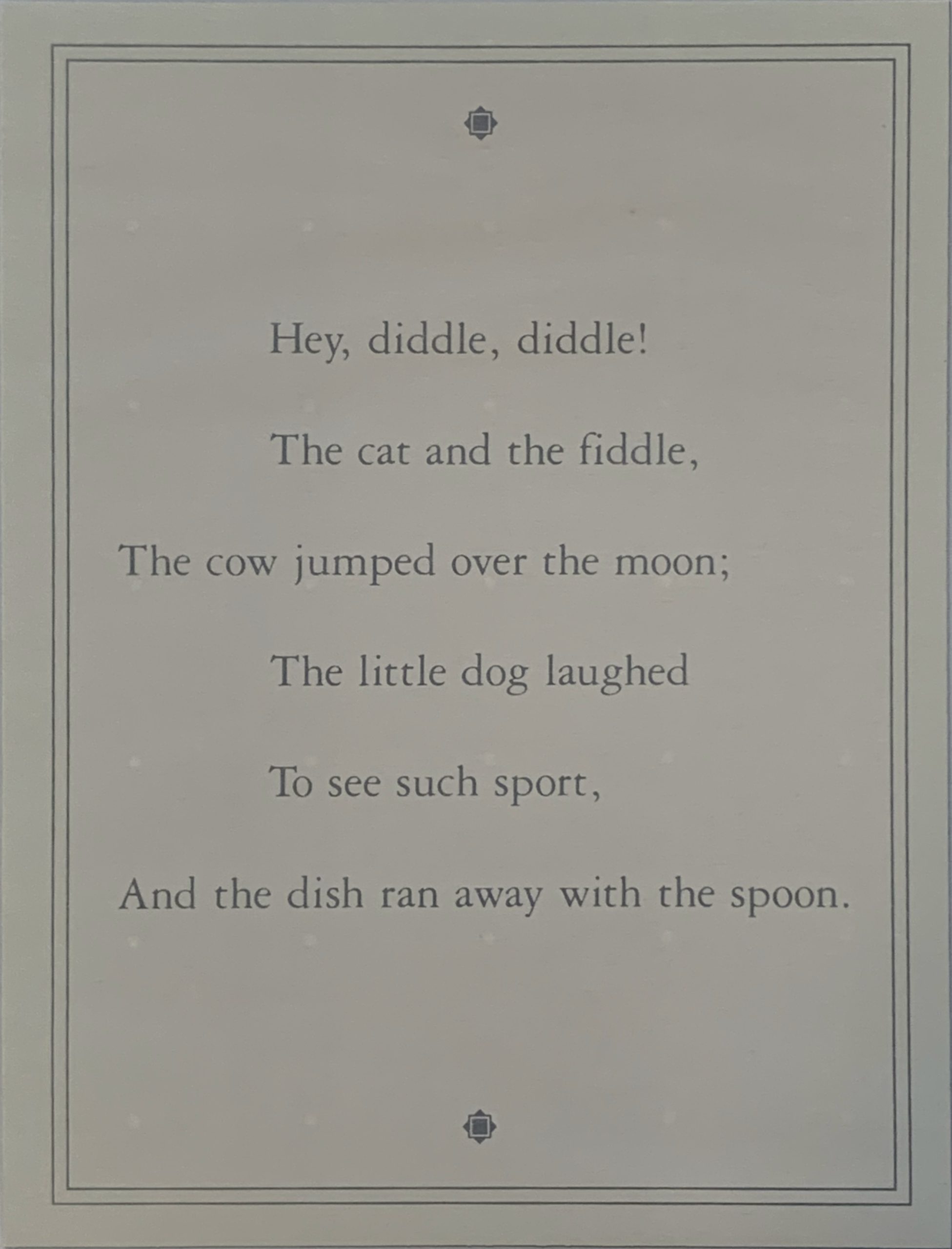 L. Frank Baum’s famous poem (though perhaps no one knows that it was Baum’s poem) is given a new look in Daniel Pelavin’s silkscreen for the Serigrafia’s Mother Goose portfolio. Pelavin, a very highly-regarded illustrator, brings whimsy and extraordinary creativity to his work. Here, the cat and his fiddle are joined by the mouse playing air guitar while the dish does the “running man”.