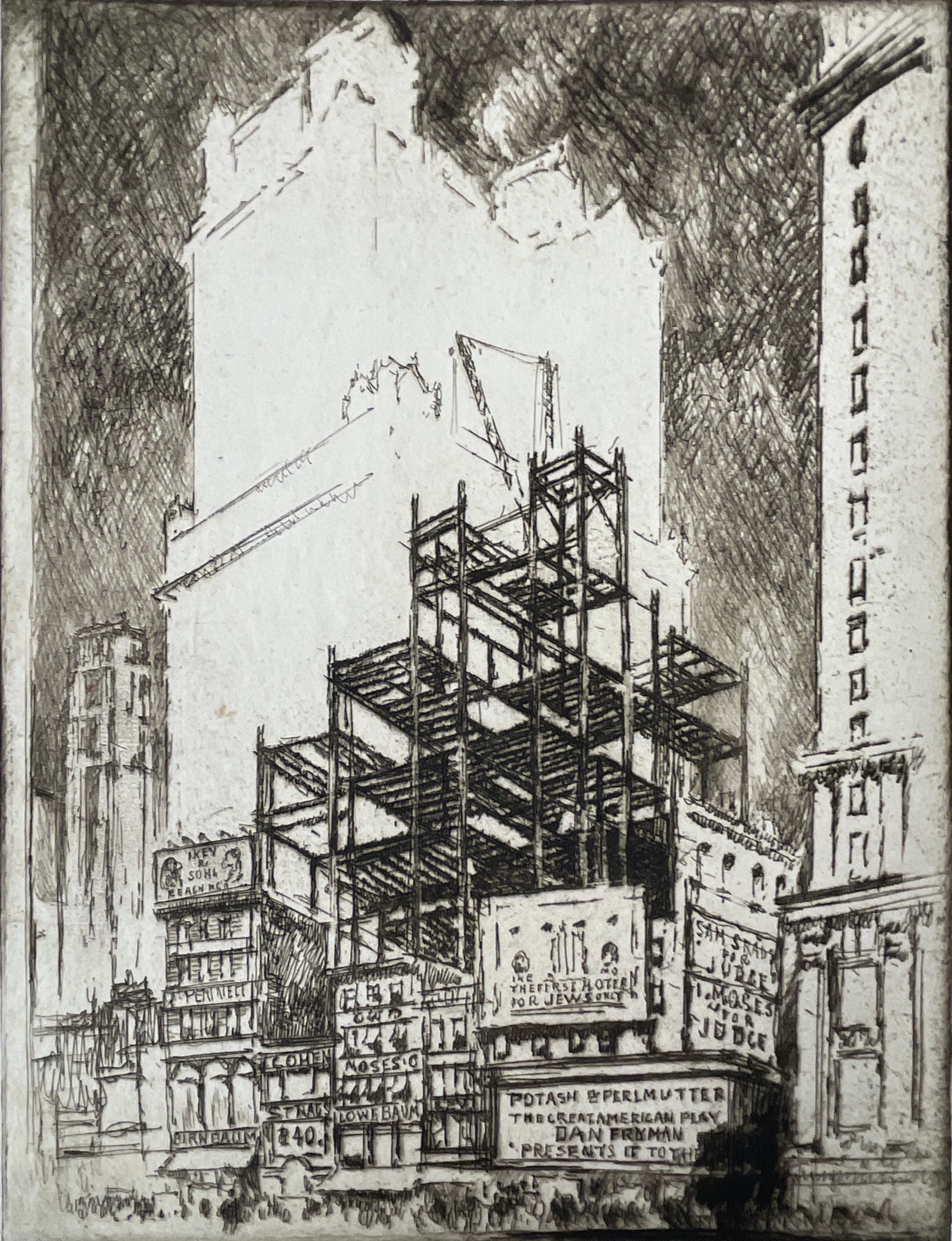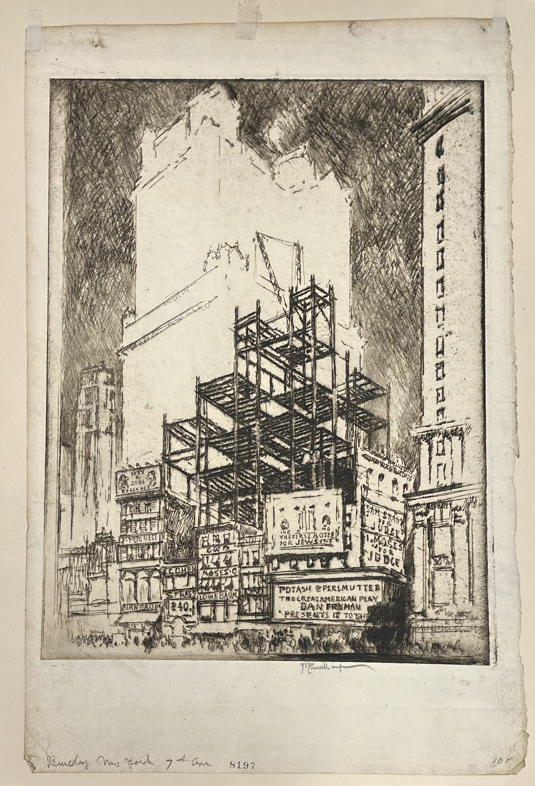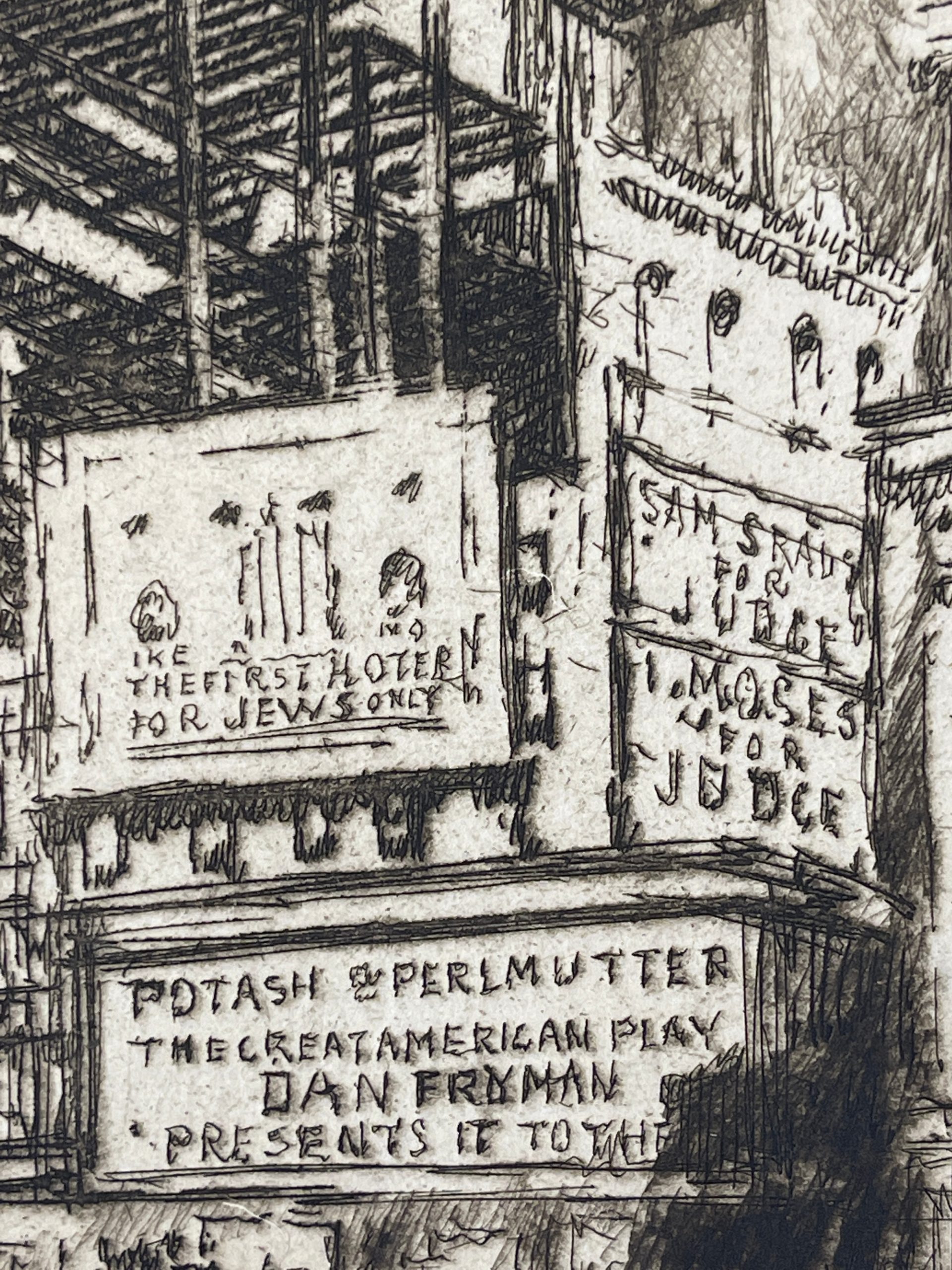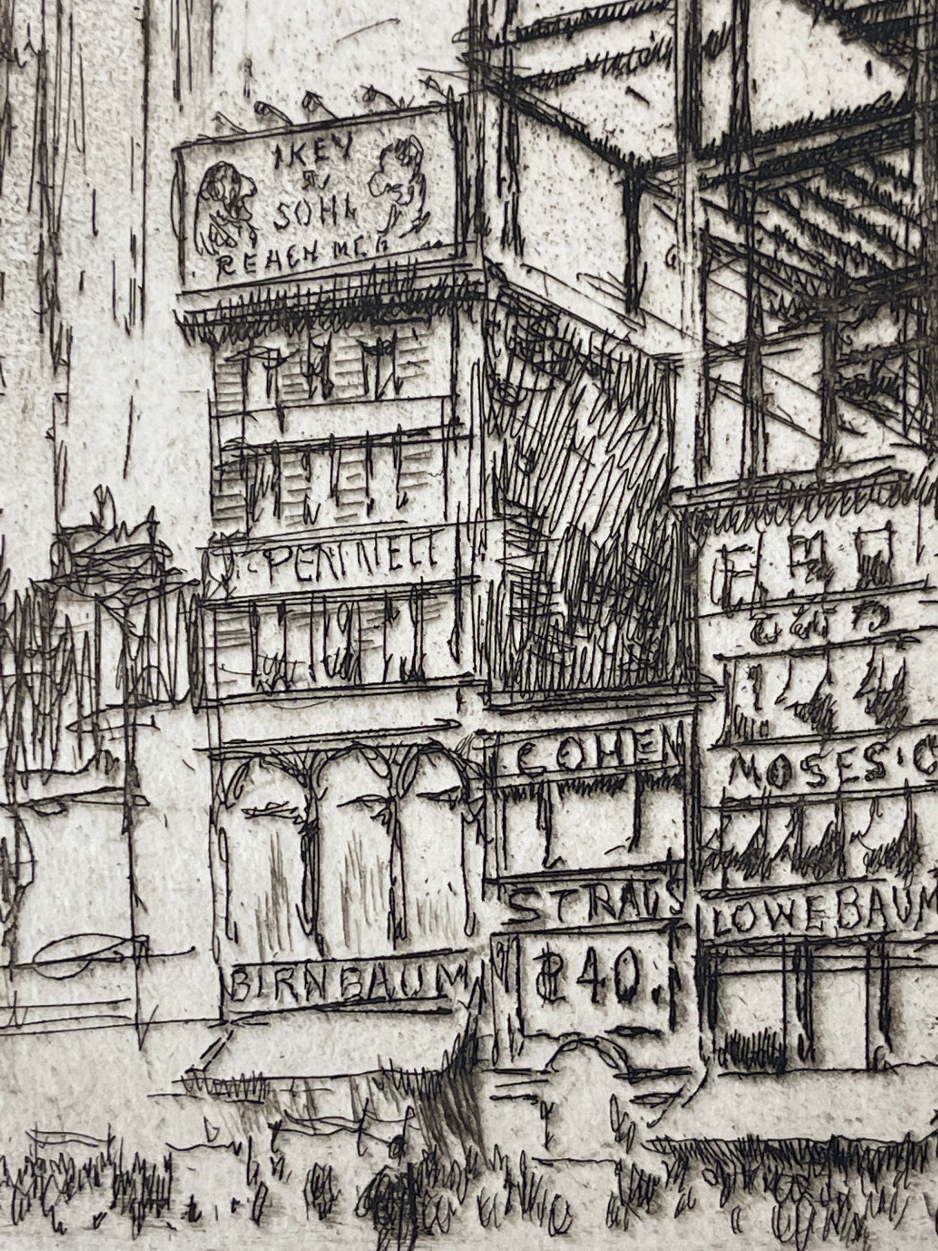 Joseph Pennell’s hundreds of etchings include countless cityscapes, including many portraying New York City. This print is unique, though, in its frank portrayal of the Jewish presence in New York—or at least on Seventh Avenue. At first look the work seems to celebrate the growing Jewish community, with a street filled with Jewish businesses and a billboard supporting “Sam Straus for Judge” and “Moses for Judge”. But it is impossible to view this picture without considering Pennell’s infamous book, “The Jew at Home,” which he wrote and illustrated in 1892. In the preface, Pennell states that he is neither a Jew hater nor a Jew lover. But there is little in this book to support that contention; as Pennell writes, “I can sympathize with the oppressed Jews of Russia, and also with the Hungarians who are thoroughly sick of those they already have, and who are doing all they can to keep from importing any more. And here I should like to bring forward some rather curious facts which have been very cleverly ignored. The Russians who have got the Jews in their own territory are going to get rid of them. The Turks have made laws refusing to receive them. And Germany and Austria-Hungary are loudly calling upon the rest of the world to take up collections to prevent their settling in either empire.” To what extent does this book describe Pennell’s views more than 40 years later?