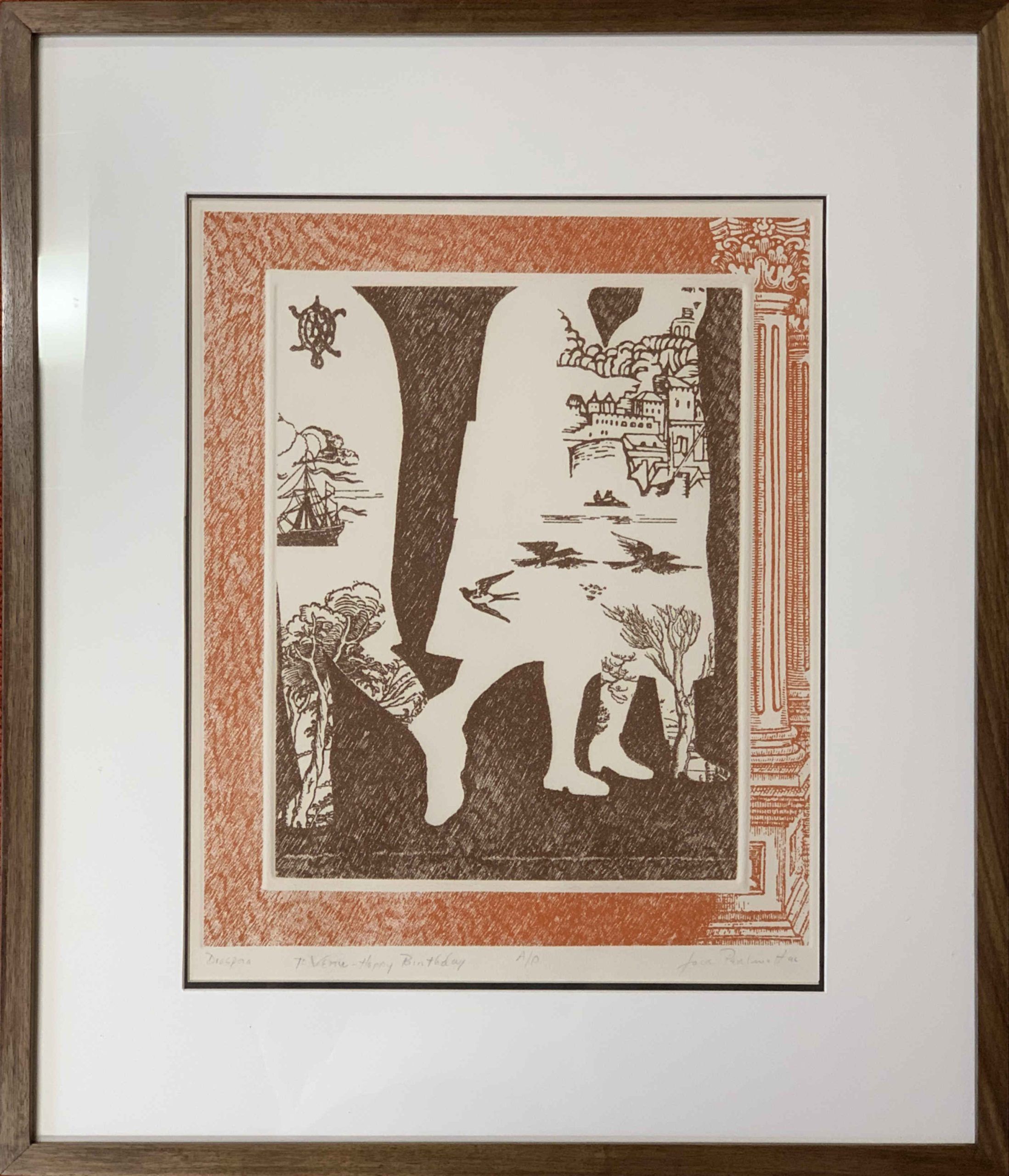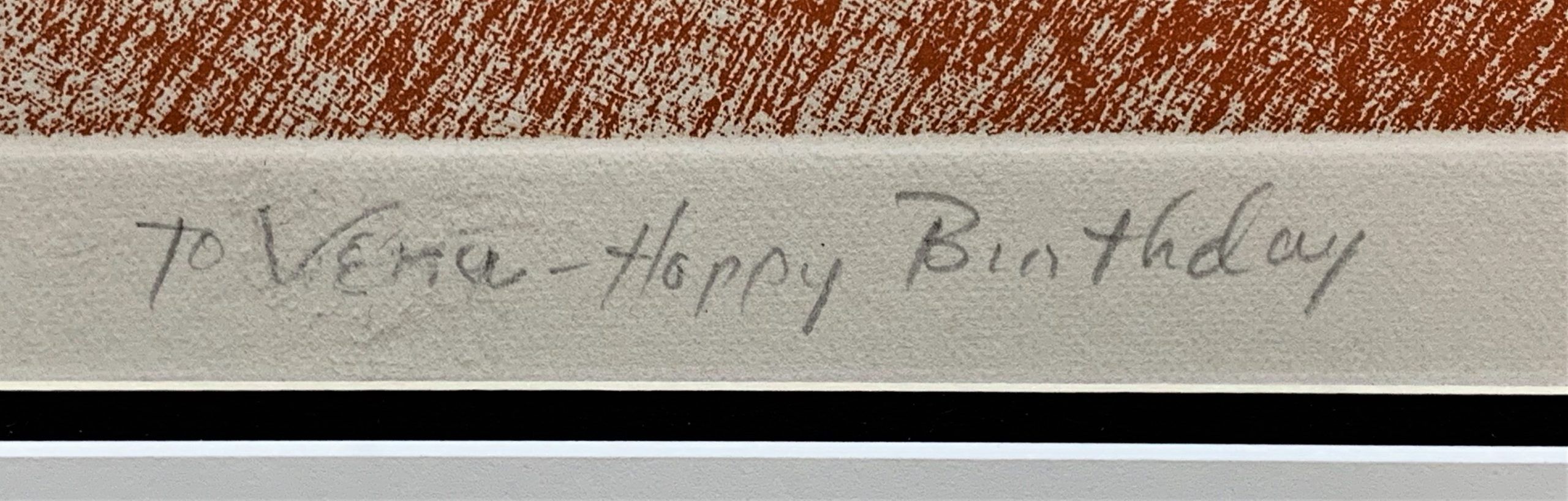 Hand-signed in pencil by the artist en recto lower right. Editioned in pencil by the artist en recto lower center. Titled in pencil by the artist en recto lower left. Inscribed in pencil by the artist en recto lower center “To Vera – Happy Birthday”