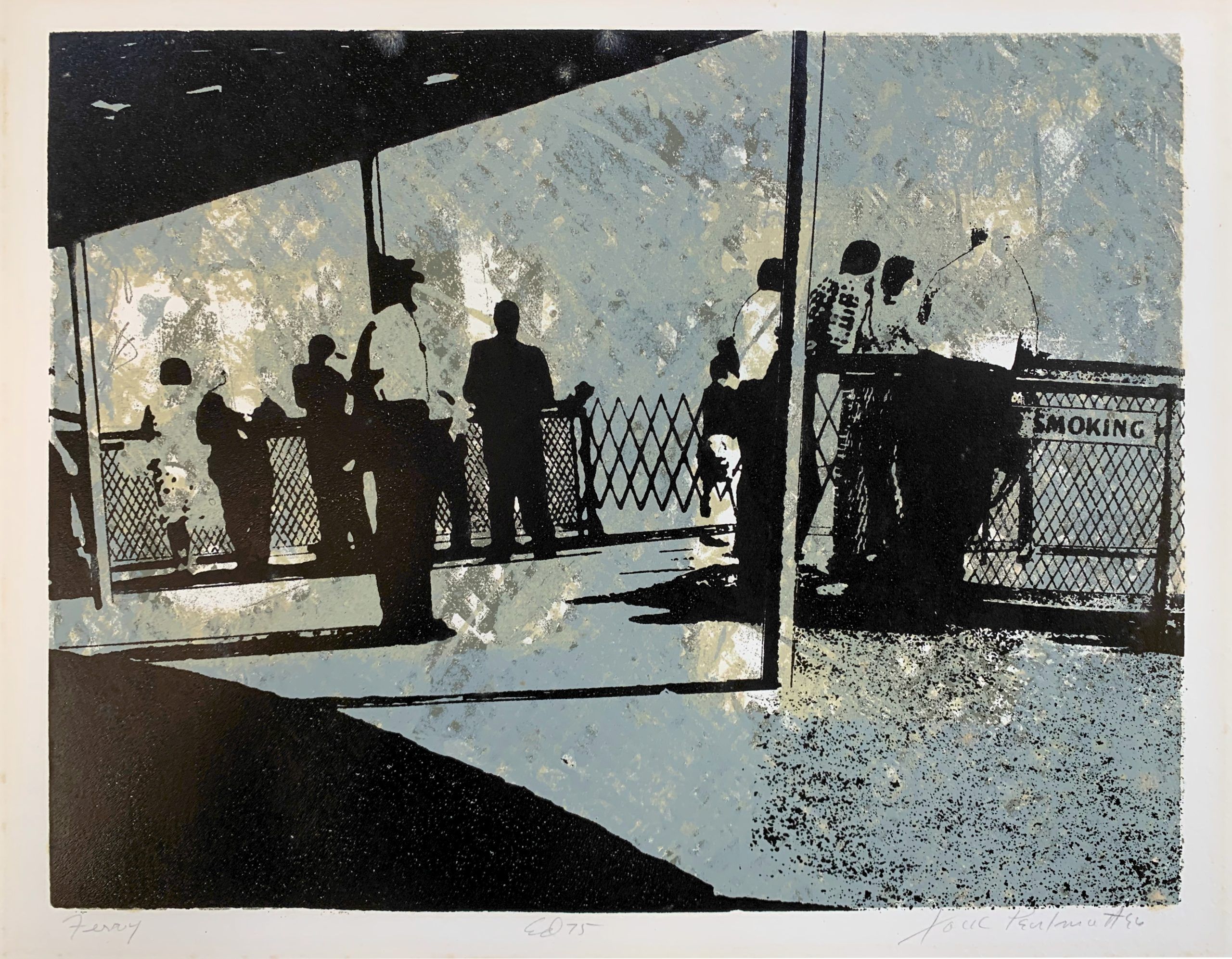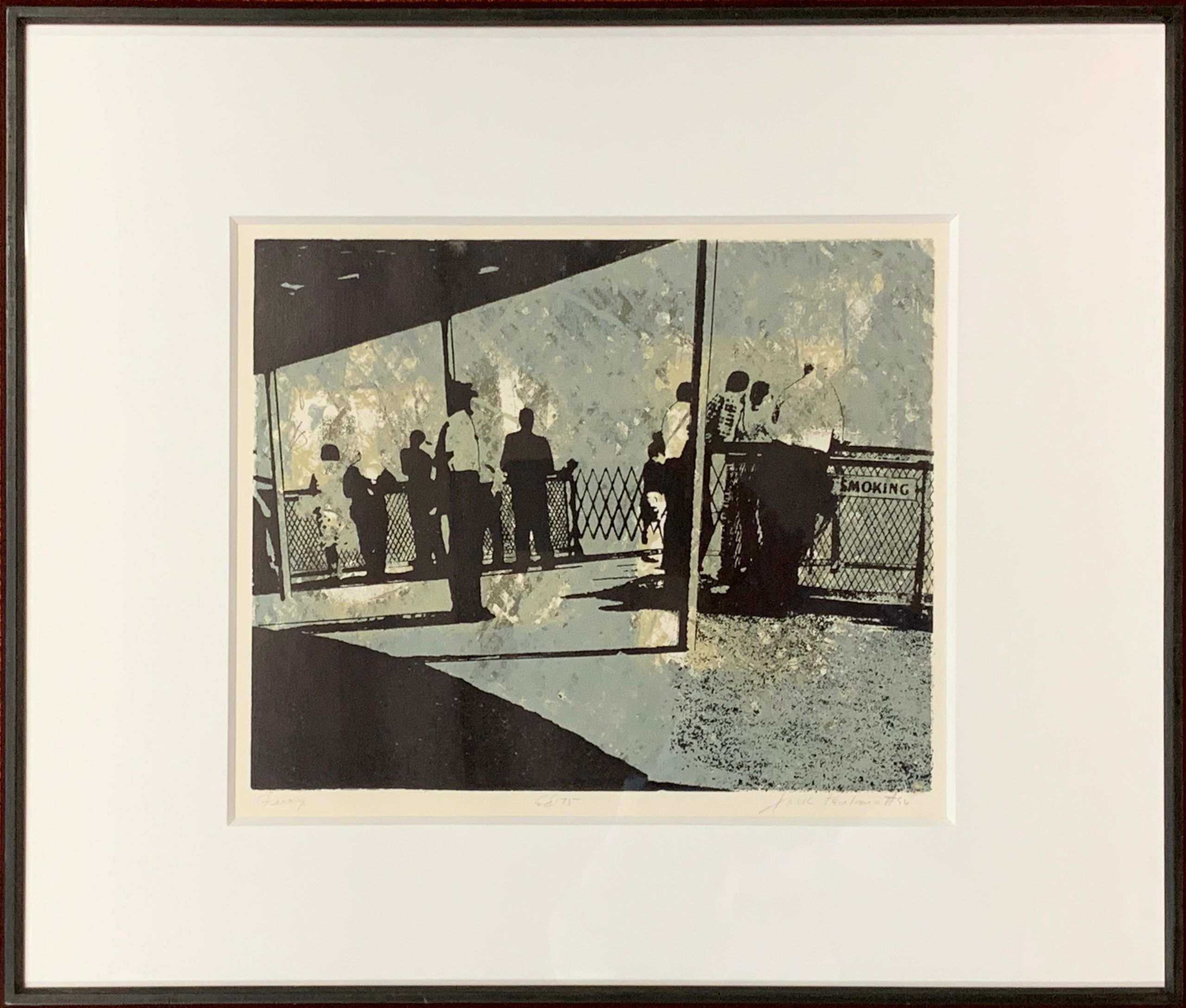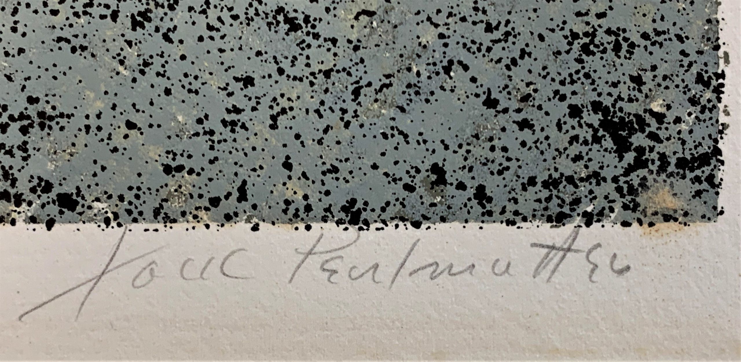 Jack Perlmutter’s trademark look: A mottled image, dispassionate view of a cityscape. A lithograph with a very heavy paint application, creating an image similar to a woodcut. Expressive and somber in cool colors.