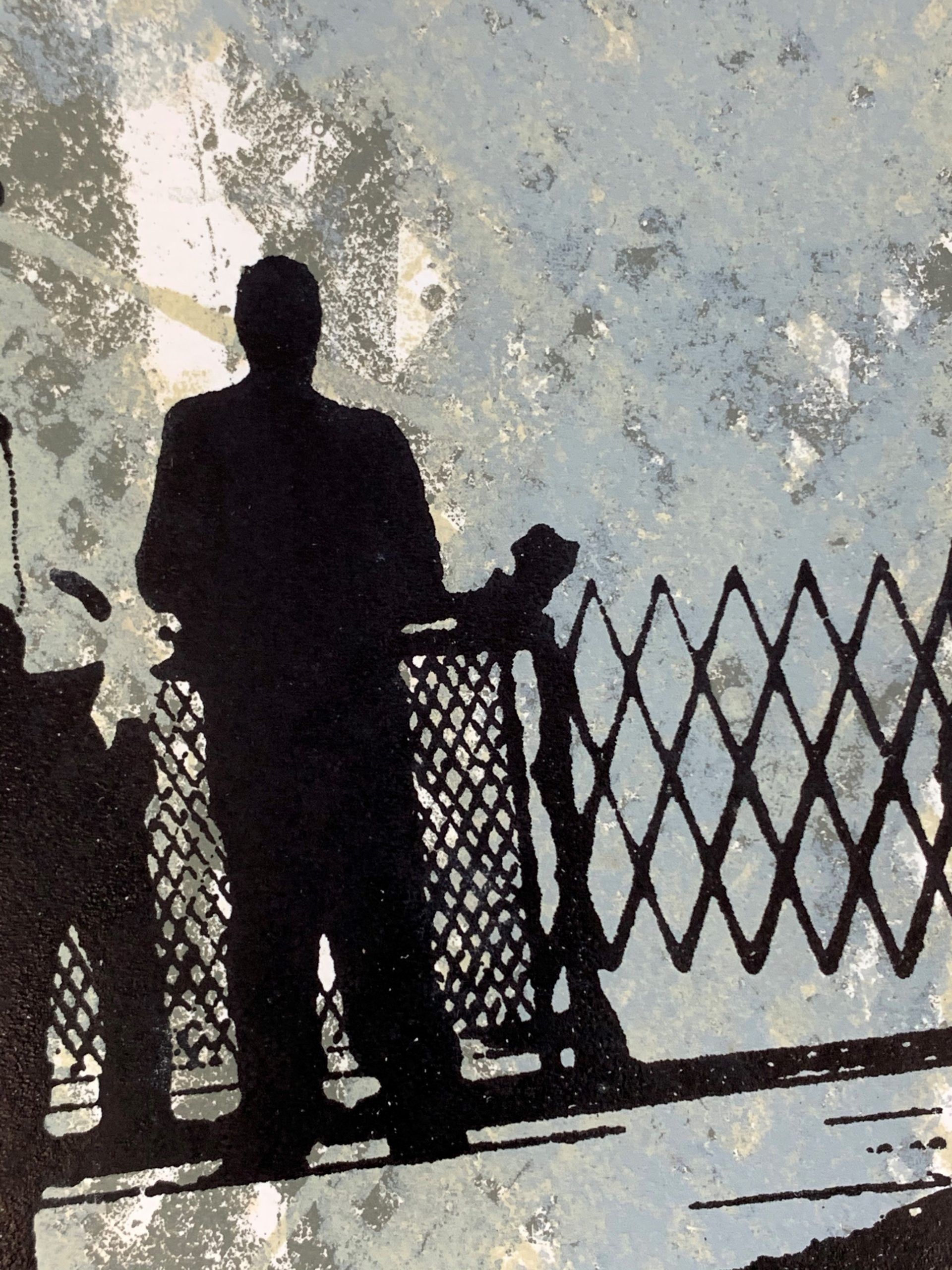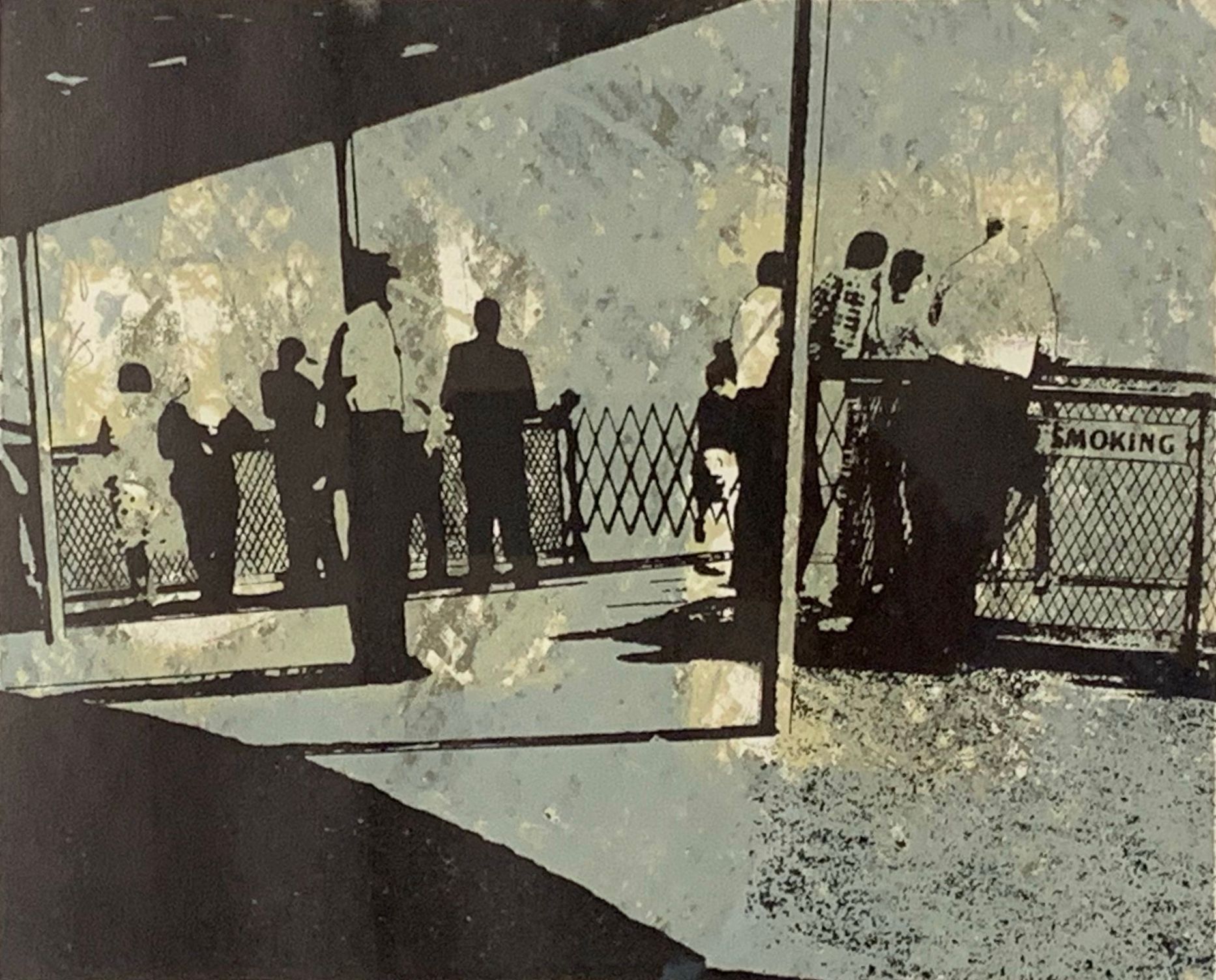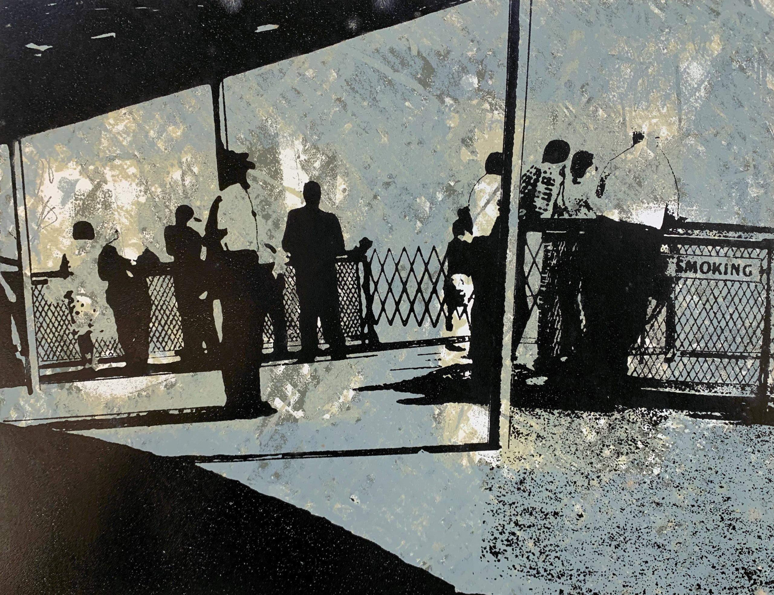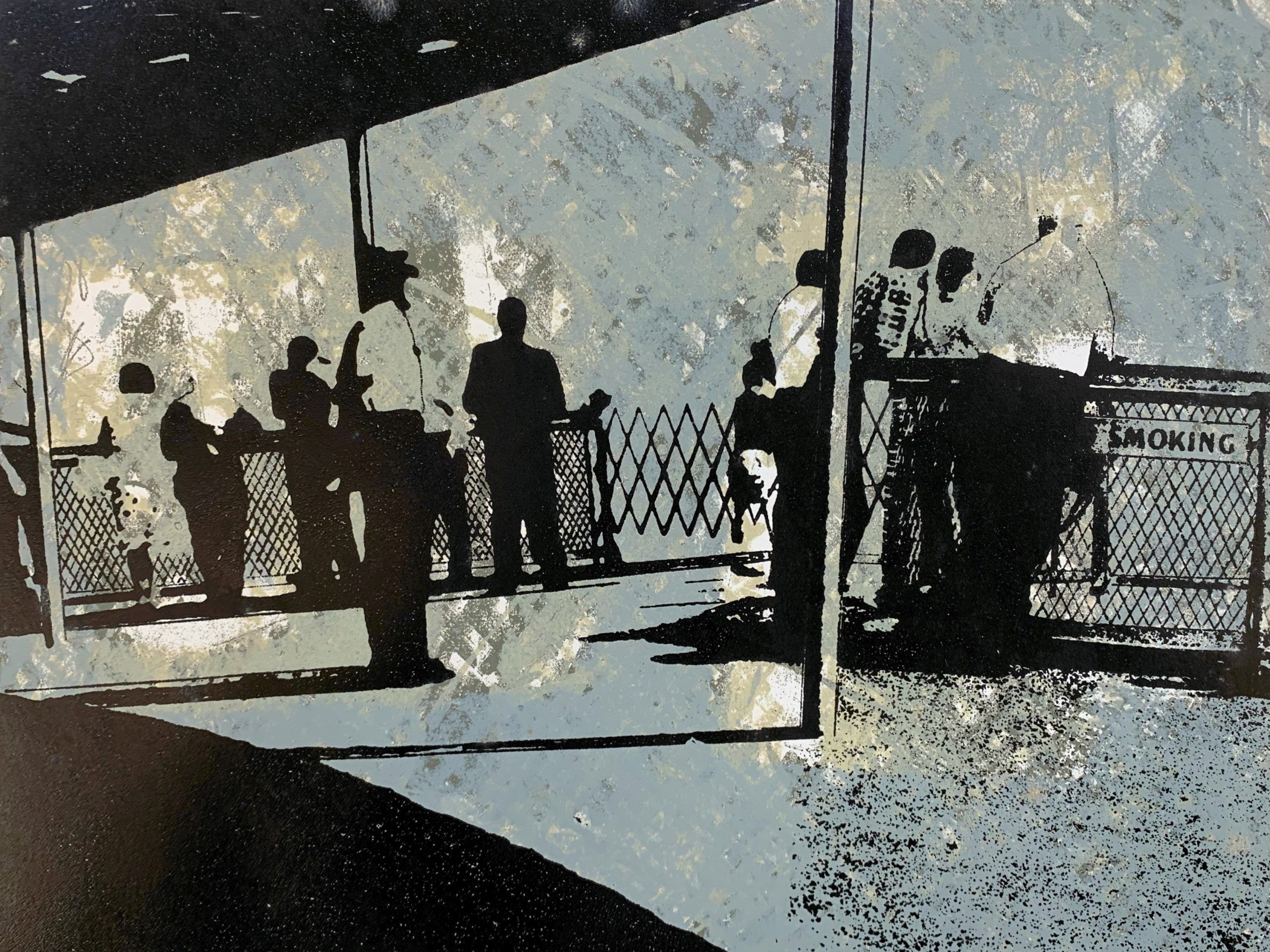 Jack Perlmutter’s trademark look: A mottled image, dispassionate view of a cityscape. A lithograph with a very heavy paint application, creating an image similar to a woodcut. Expressive and somber in cool colors.
