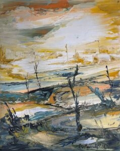 Rendered expertly in yellows and oranges, black and ash, Jack Perlmutter’s moody and surrealistic depiction of a desolate landscape.
