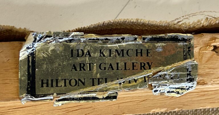 Bearing the gallery label of the storied Ida Kimche art gallery. The Kimche gallery, located in the Tel Aviv Hilton, was a highly successful dealer of Twentieth Century masterworks.
