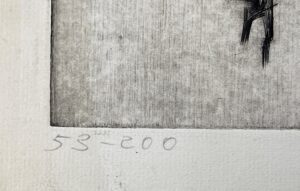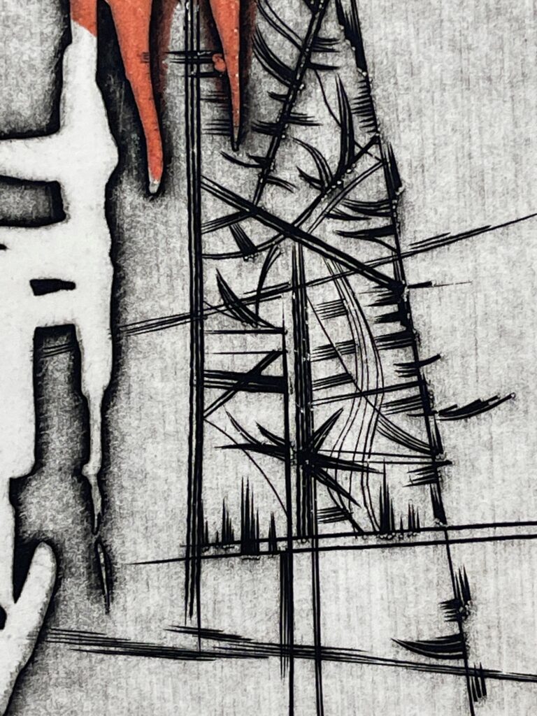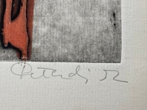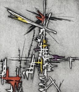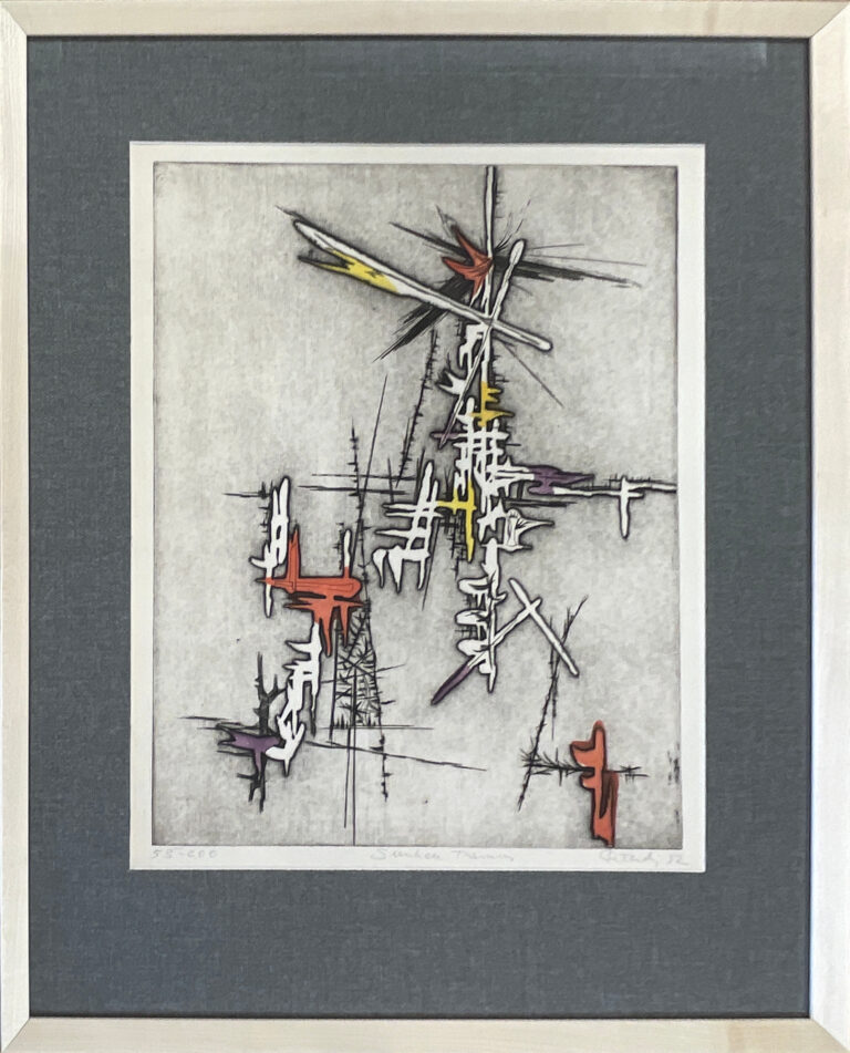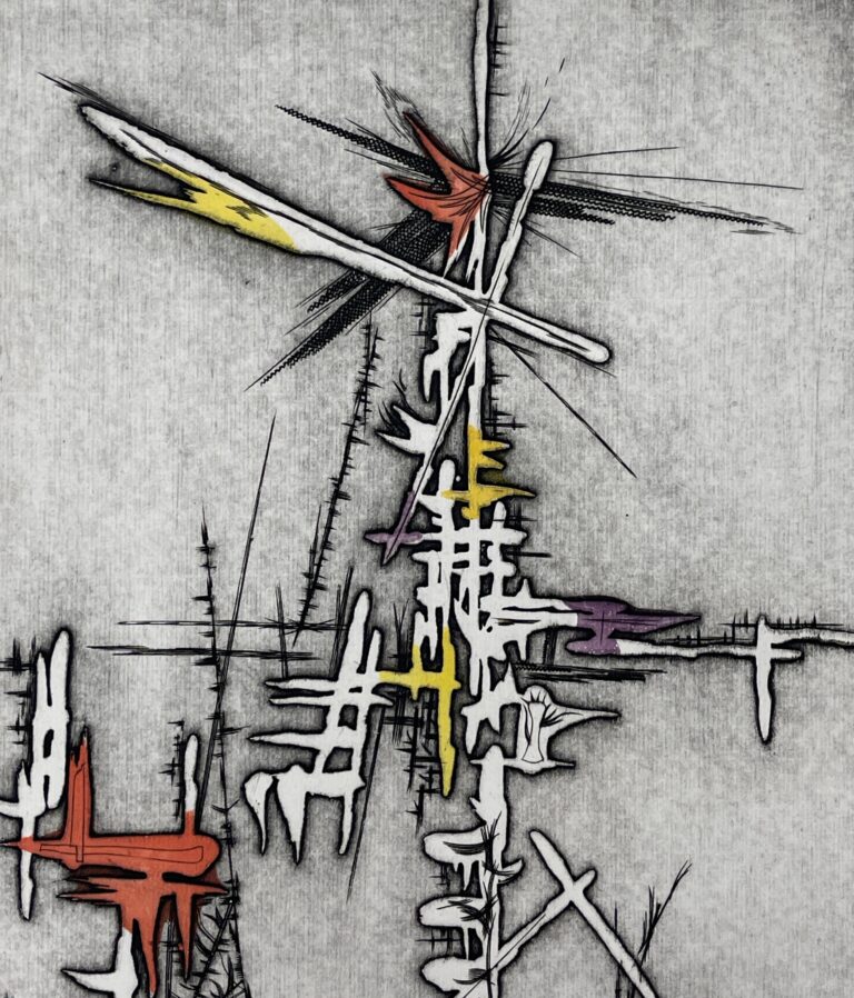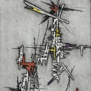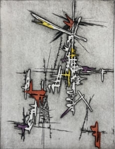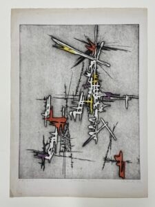 This is one of Gabor Peterdi’s masterpieces. Examples of this work are held in the collections of the Museum of Modern Art and the National Gallery of Art. It is a complex work—enormously interesting to view and interestingly created: Peterdi used etching for the background and engraving for the other elements, and placed the four colors by stenciling. This work very much reflects Peterdi’s learning at Atelier 17.