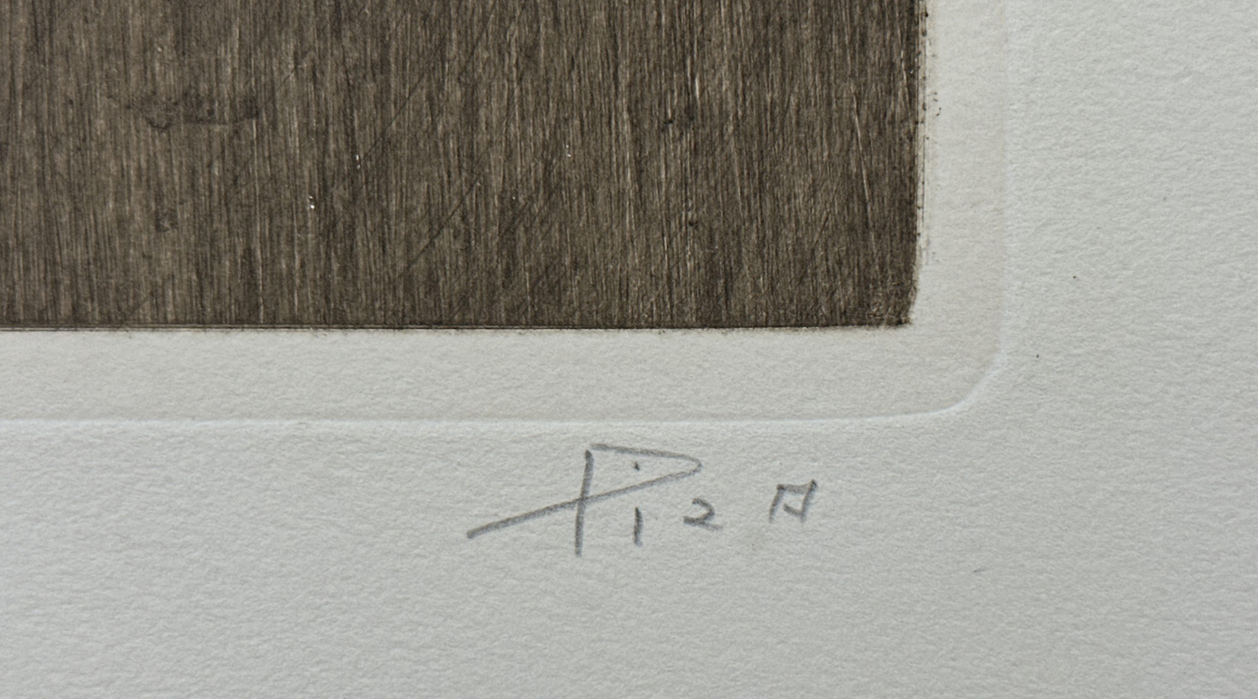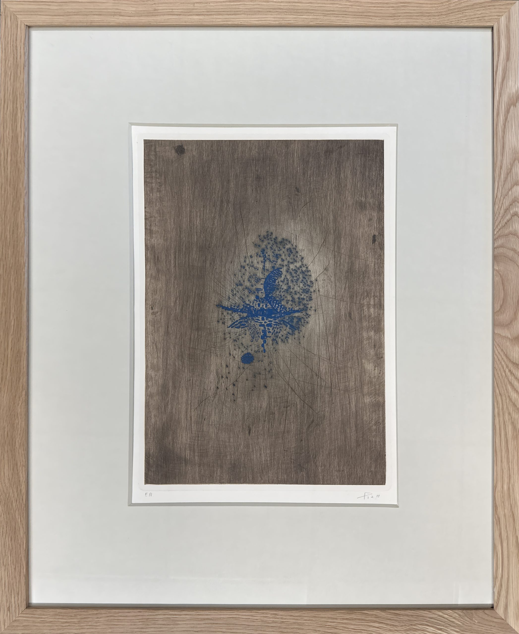 A particularly fine example of Piza’s work, created during the thick of his second period, someone unusual in being comprised of loose, scattered color rather than contained shapes. A rare artist’s proof, preceding the edition of only 50 impressions. Custom framed in a solid oak frame behind 99% UV-blocking art glass using strictly conservation-grade materials.