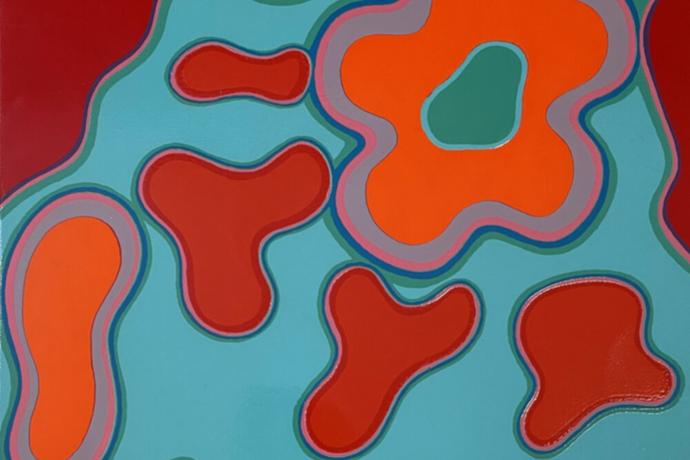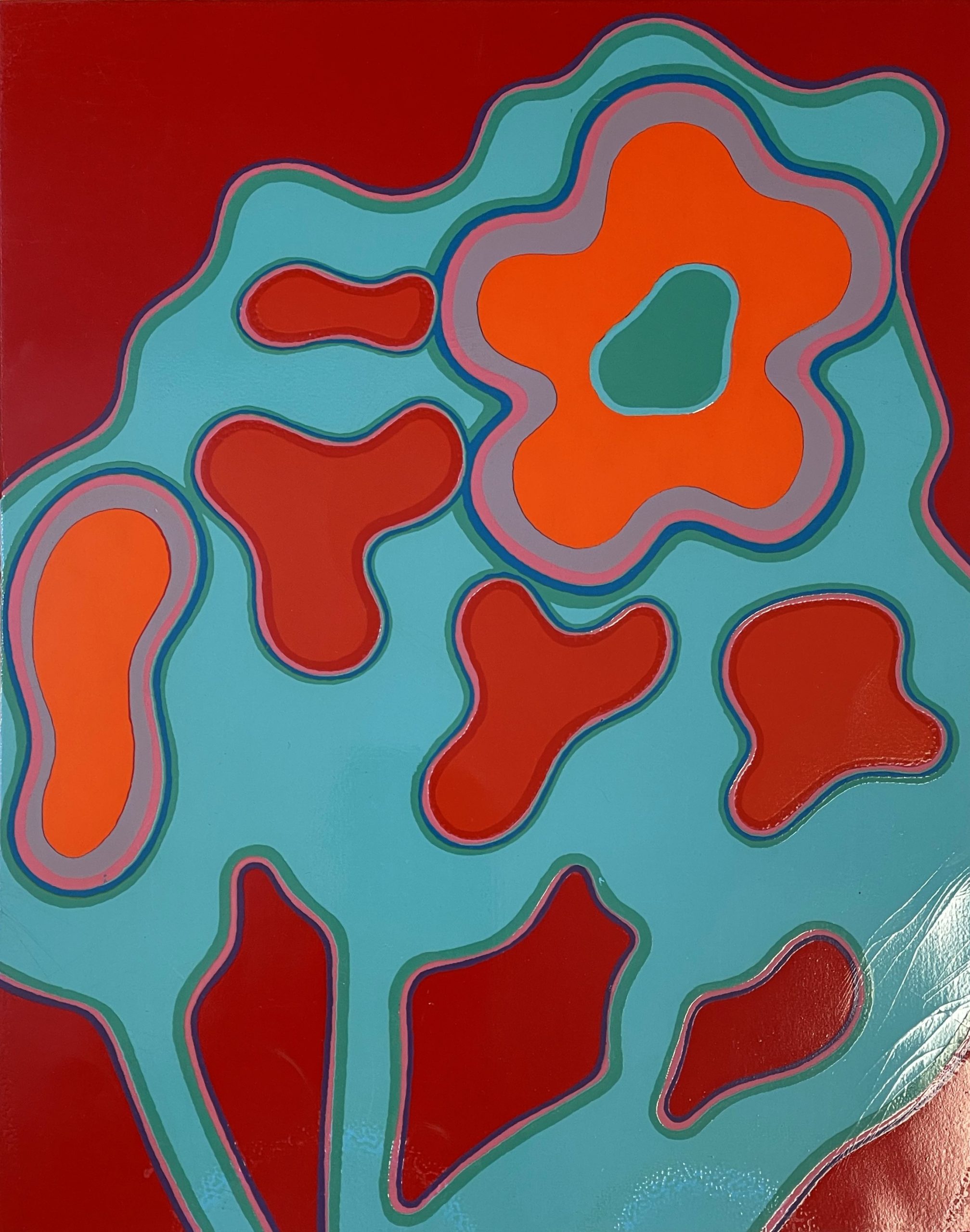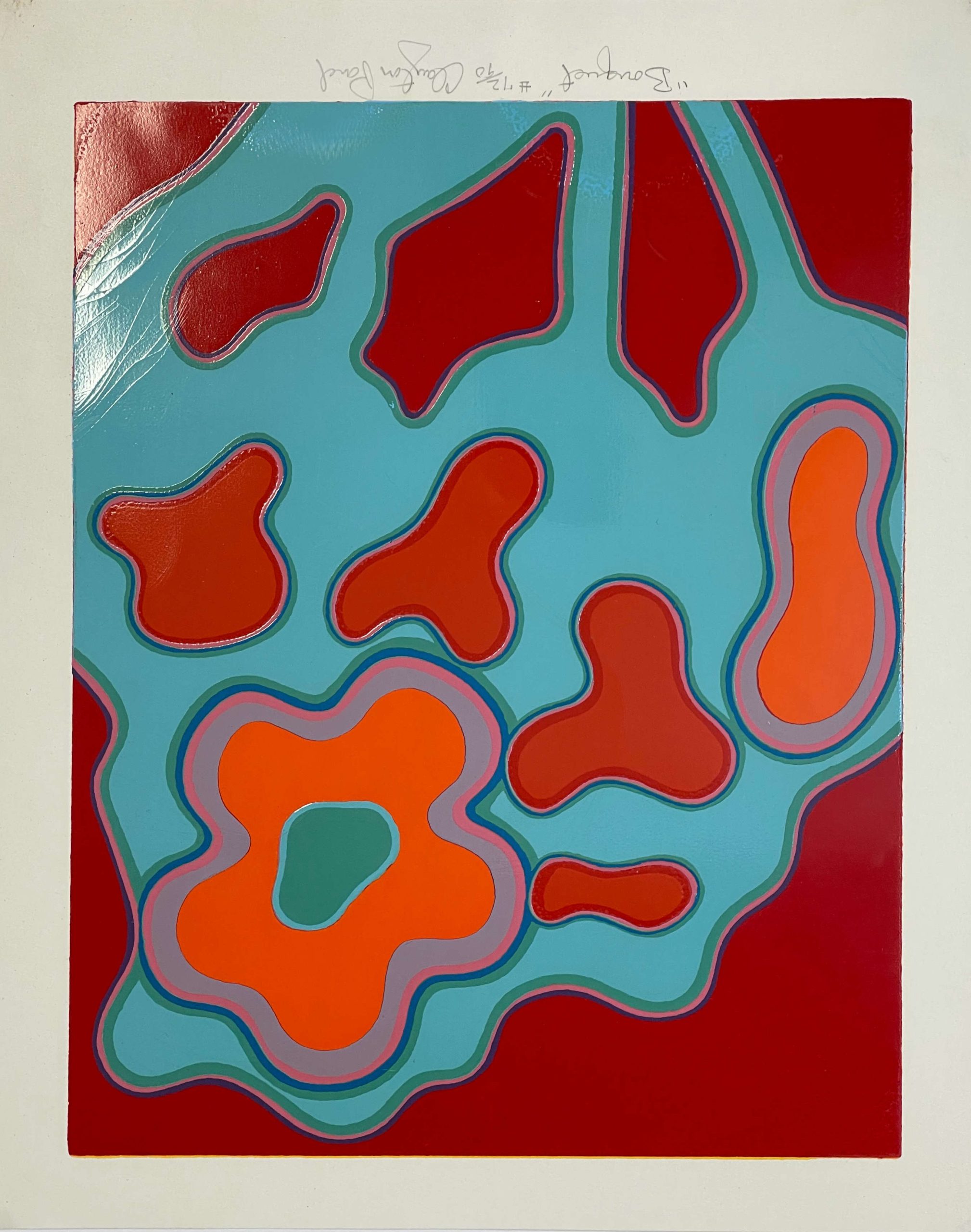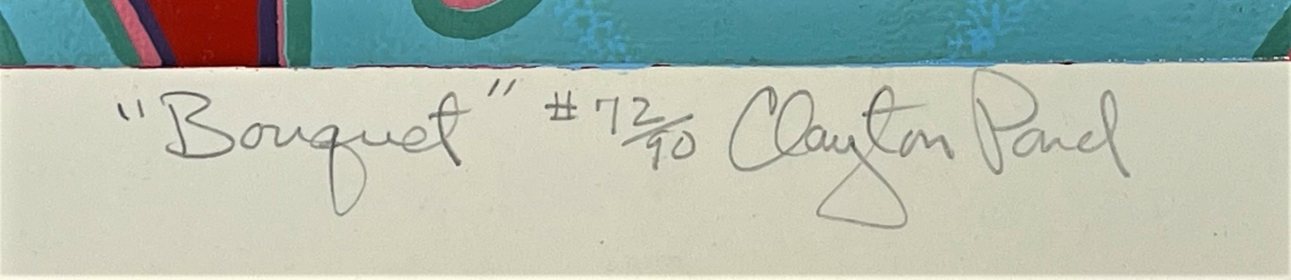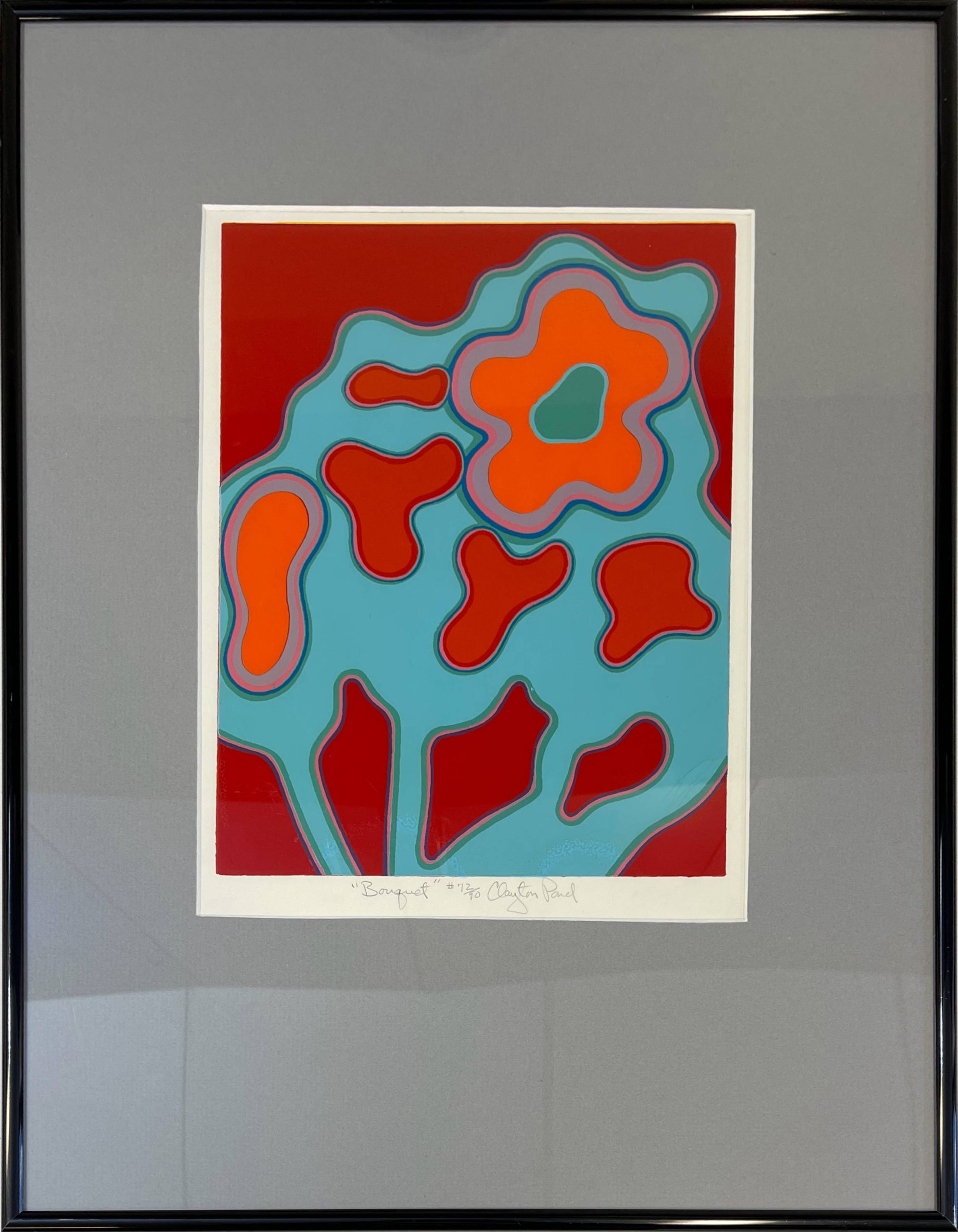 Clayton Pond is an extraordinary artist, whose rich imagination is surpassed only by the richness of the ink on his serigraphs. The inventor of an entirely new way of producing serigraphs (commonly referred to as “silkscreens”), he achieves an incomparable glossiness and luminosity. This image was abstracted from the 1965 serigraph “Flower Shop”—a shop in a train station in Stockholm where the artist traveled during the summer of 1965. “Flower Shop” was the first print in which the artist originated his reductive method of stenciling, whereby he gradually reduced the openings in the same stencil for each subsequent color. Pond’s printing process gave his prints a tactile relief surface by printing each new color layered on top of the previous one.