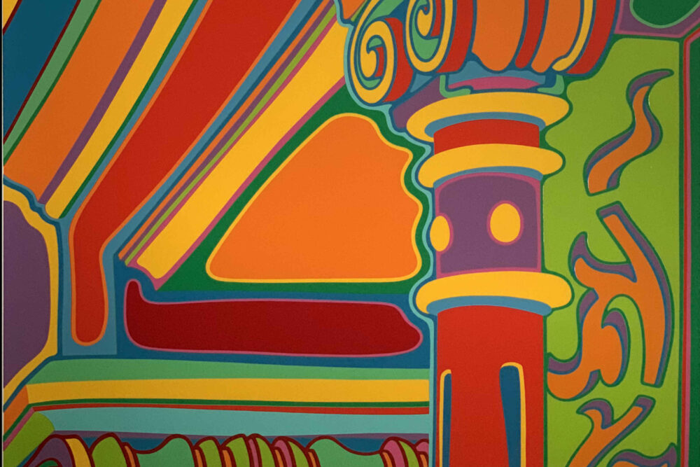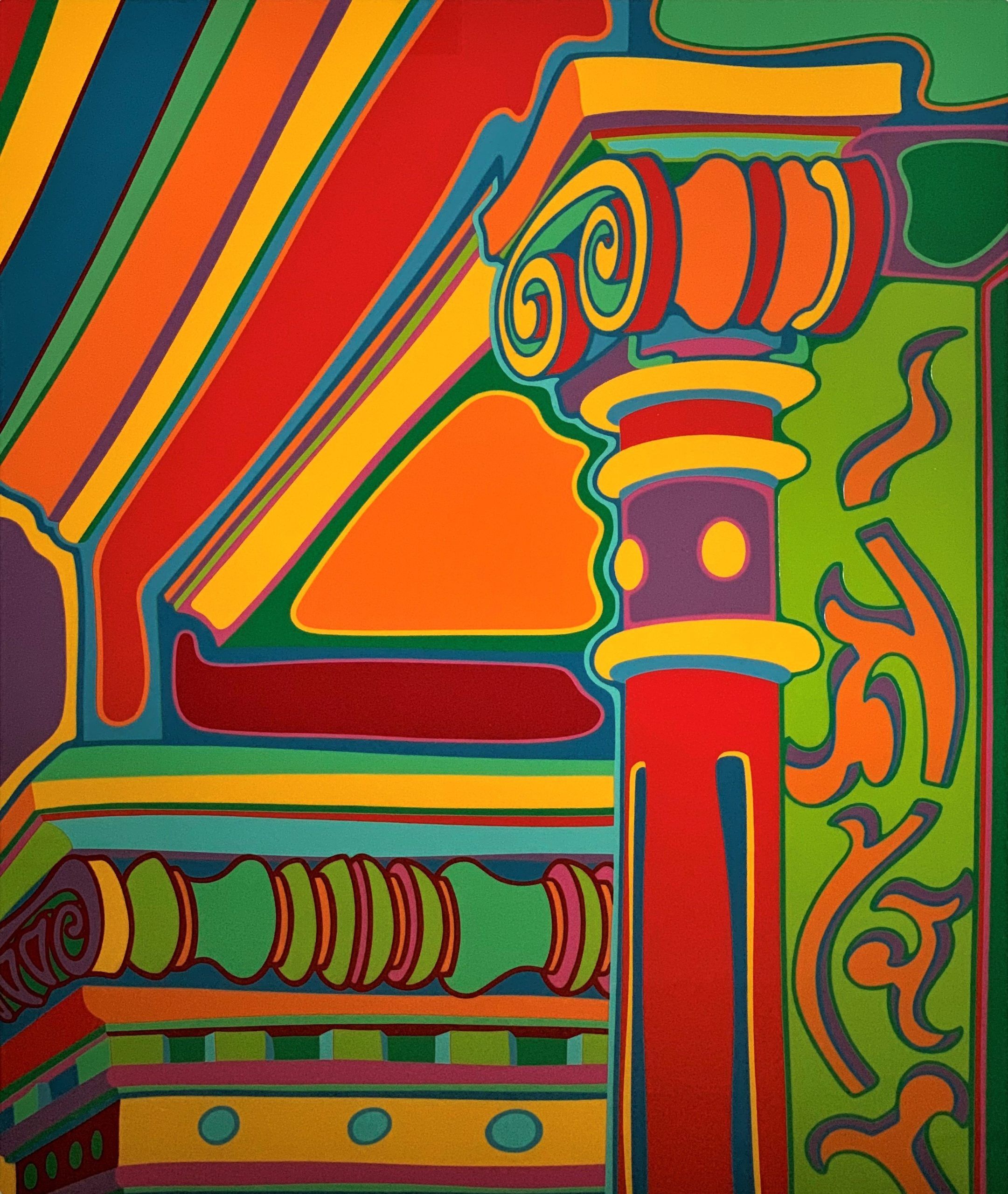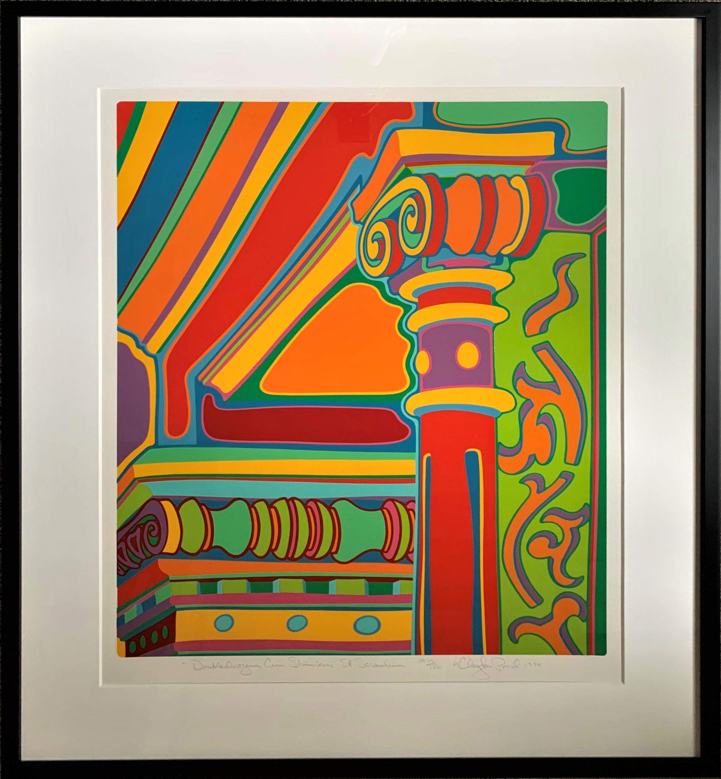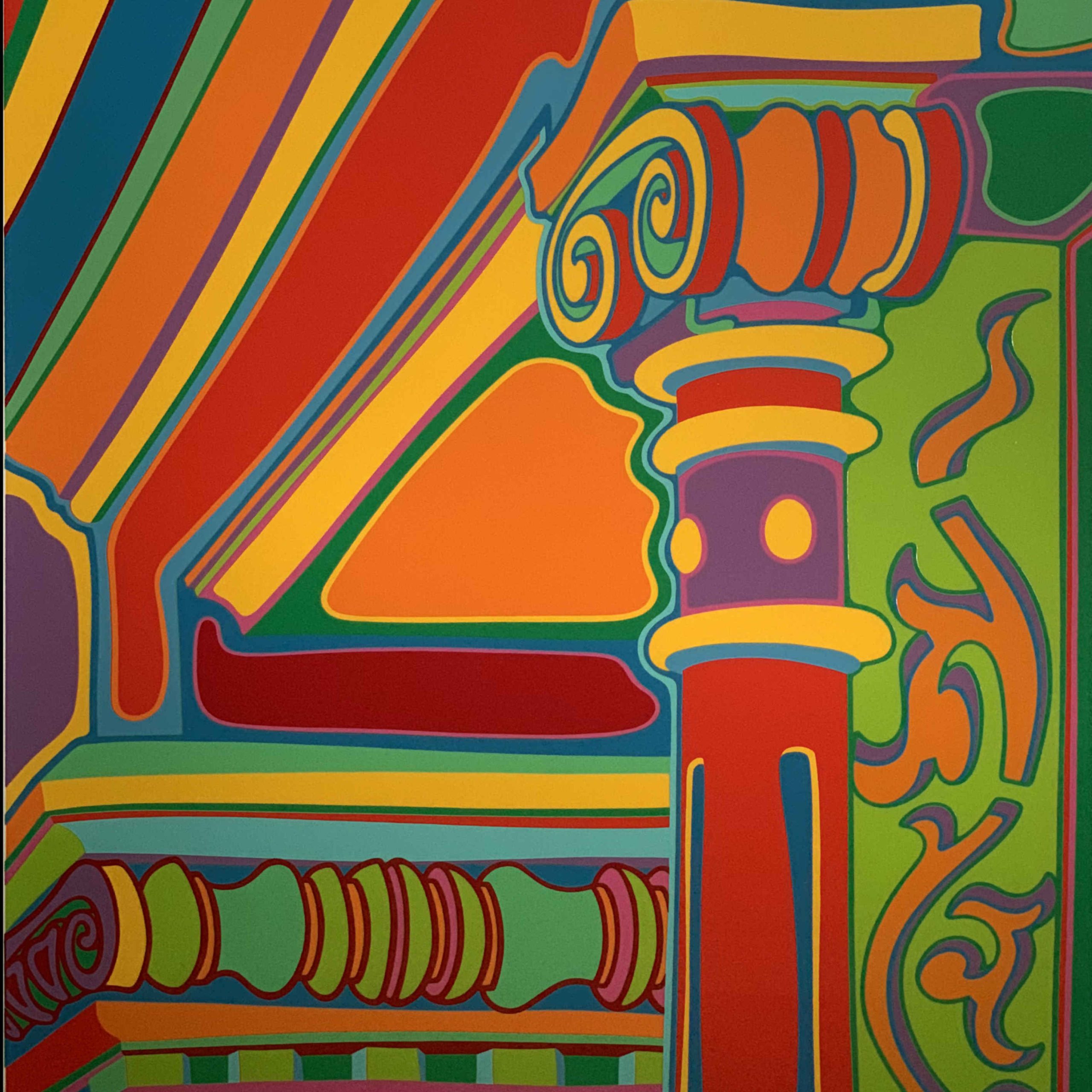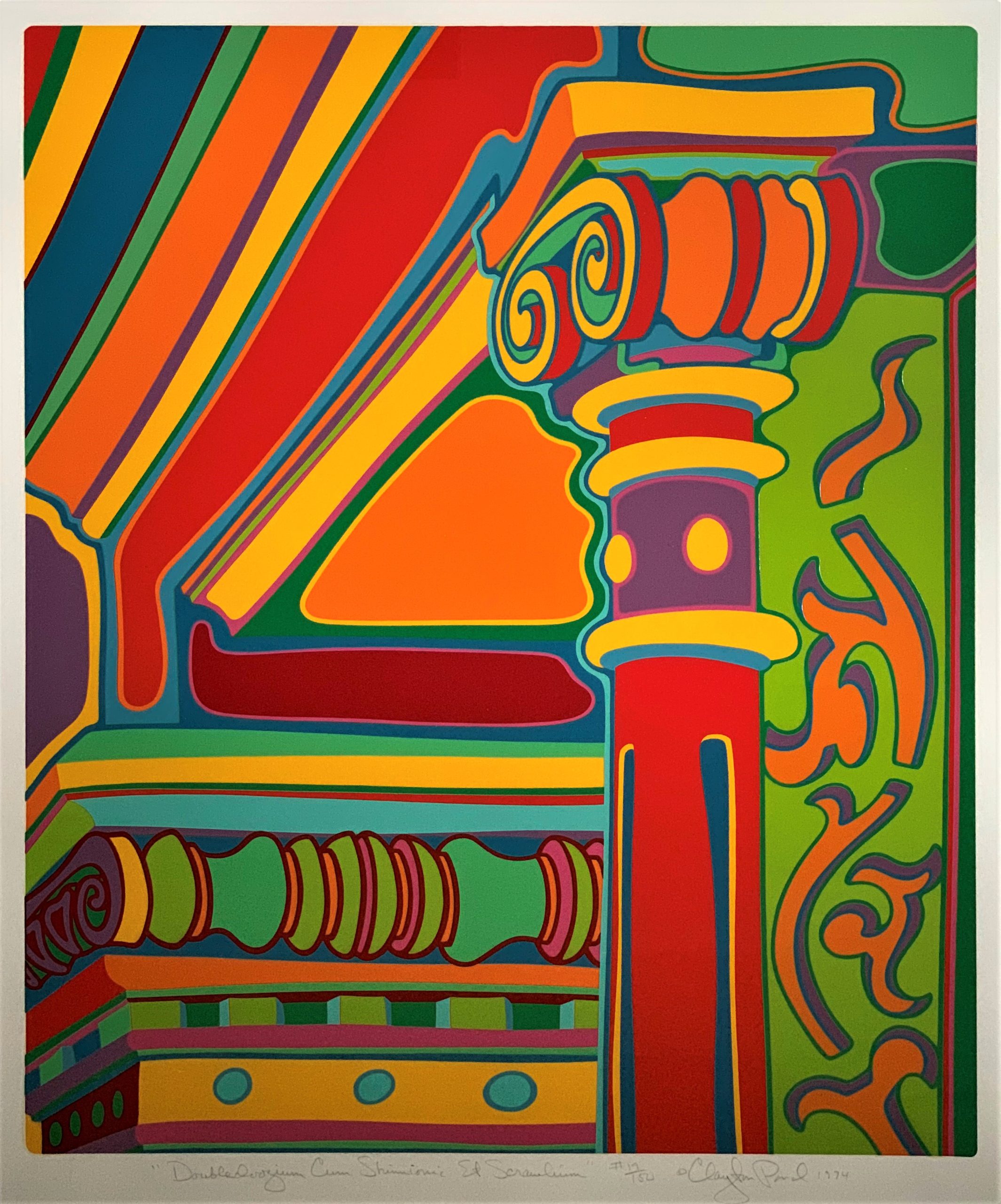 Clayton Pond’s “Capital Ideas” suite is a collection of seven serigraphs that Pond created during the spring, summer, and fall of 1974. Pond was one of the early artists to settle in the SoHo area of New York City, living in his Greene Street studio from 1969 to 1995. He watched as the area changed from a low-rent warehouse district to a dynamic center of the arts. What remained unchanged over those decades was the 100-year-old architecture of SoHo’s cast iron facades. Pond commemorated the beauty of the cast iron architectural details—enhancing them in his colorful way, of course. Every one of the images in the suite is from what Pond could see from the front windows and fire escape of his studio.